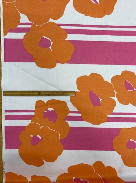 ピンクのボーダーに、大きいオレンジの花柄プリントのコットン。