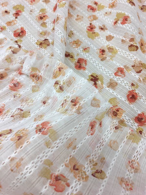 ドビー織りのストライプ模様に、水彩画のような花柄をプリントした生地です。