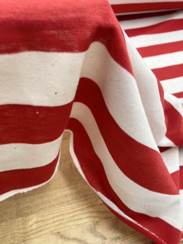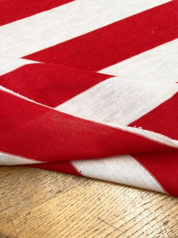 カジュアルな印象の赤とキナリのボーダー柄が目を引く、天竺ニット生地です。