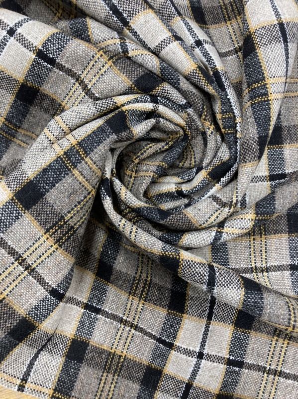 生地:タータンチェック柄ウールポリ(ベージュ/グレー黒黄) [kiji-2197]