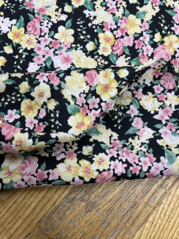 生地:ダブル幅ポリエステル100%花柄プリント(黒/黄色)
