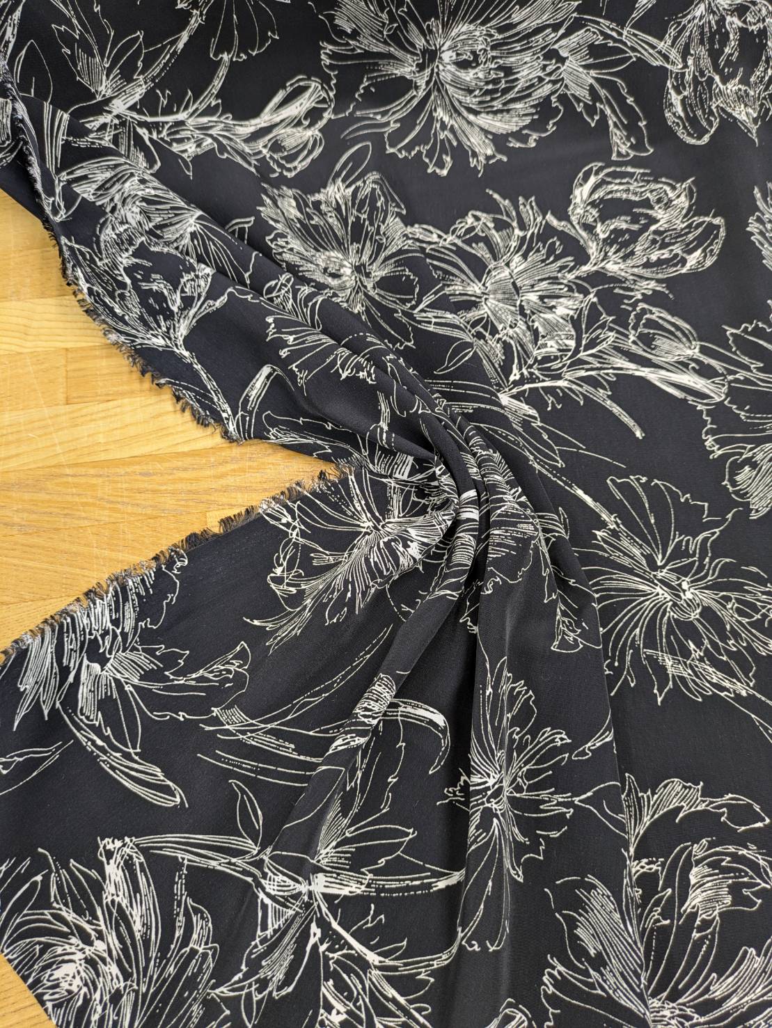 生地:手書き風フラワープリントポリエステル100%(黒/白) [kiji-2677]