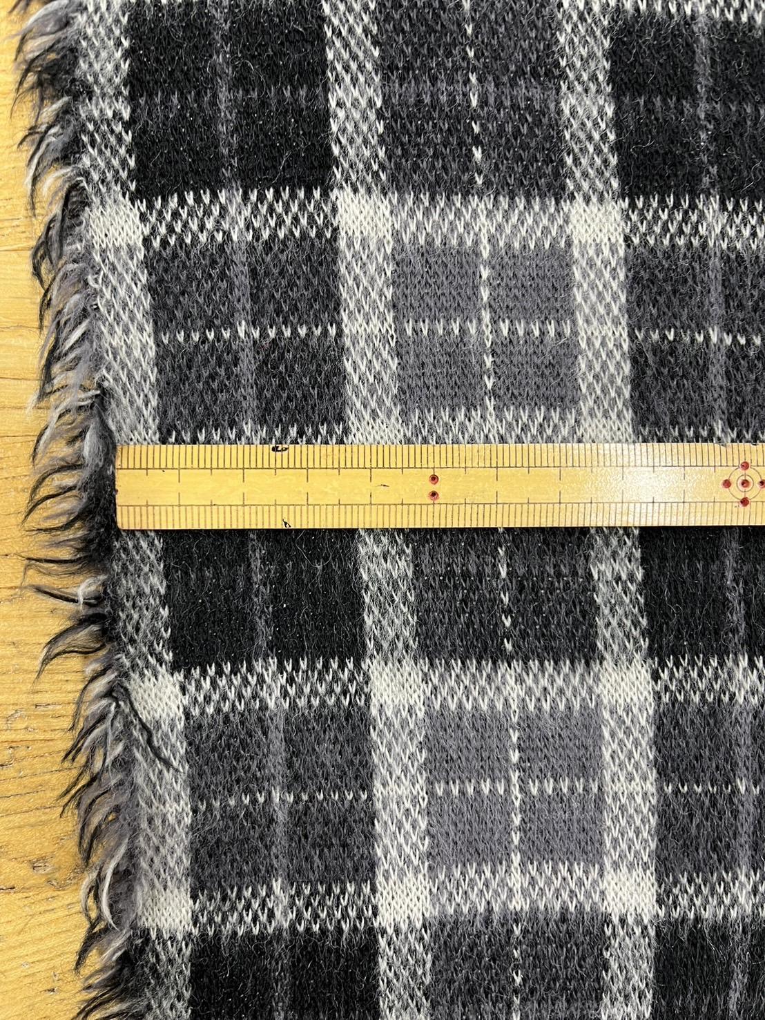 この生地はタータンチェック柄のアクリルジャガードニットで、黒を基調としたデザインが特徴です。