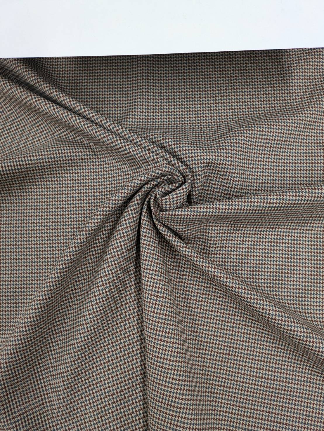 クラシカルなガンクラブチェック柄が特徴の、ウールライクな風合いを持つポリエステル生地です。