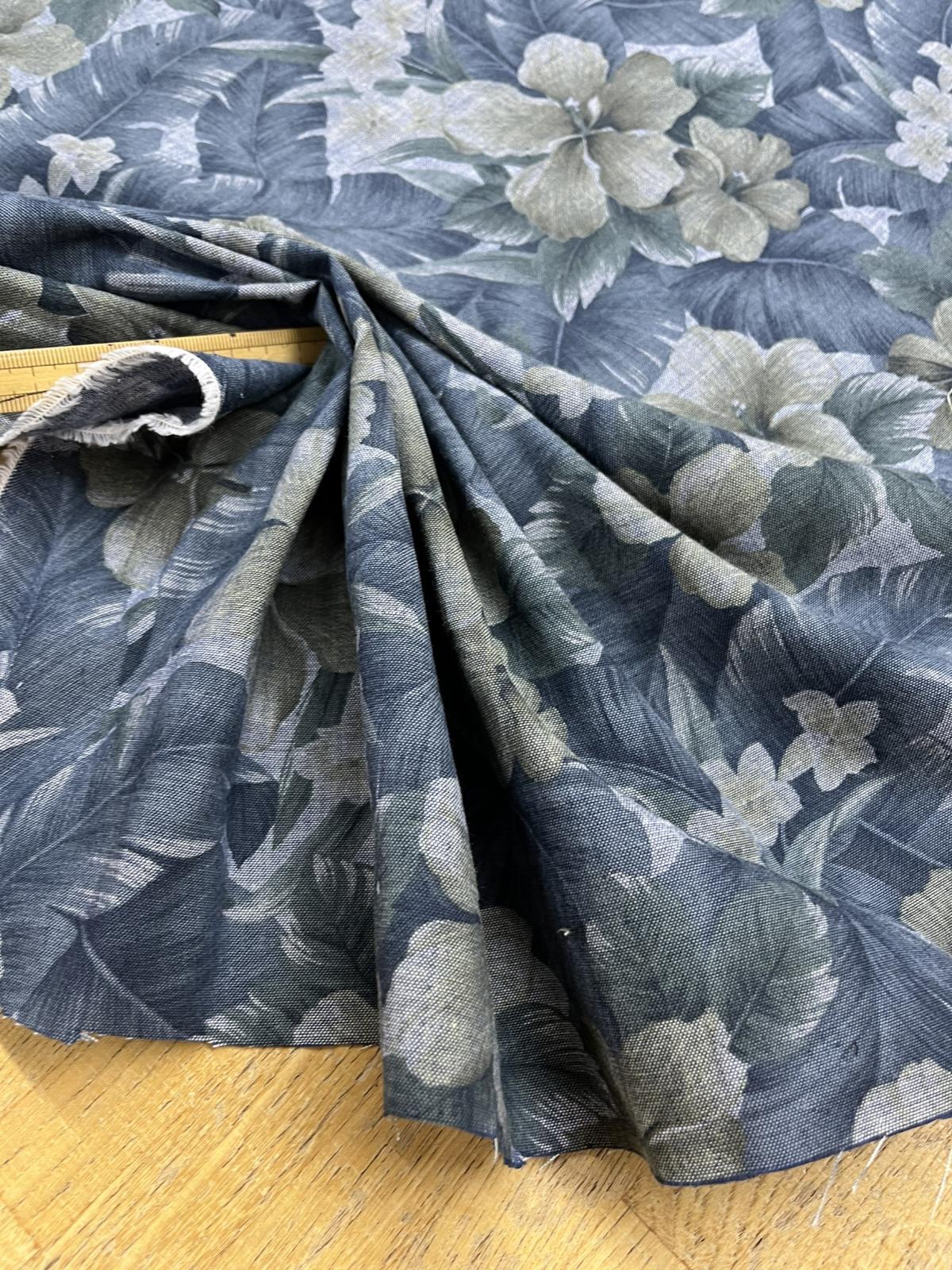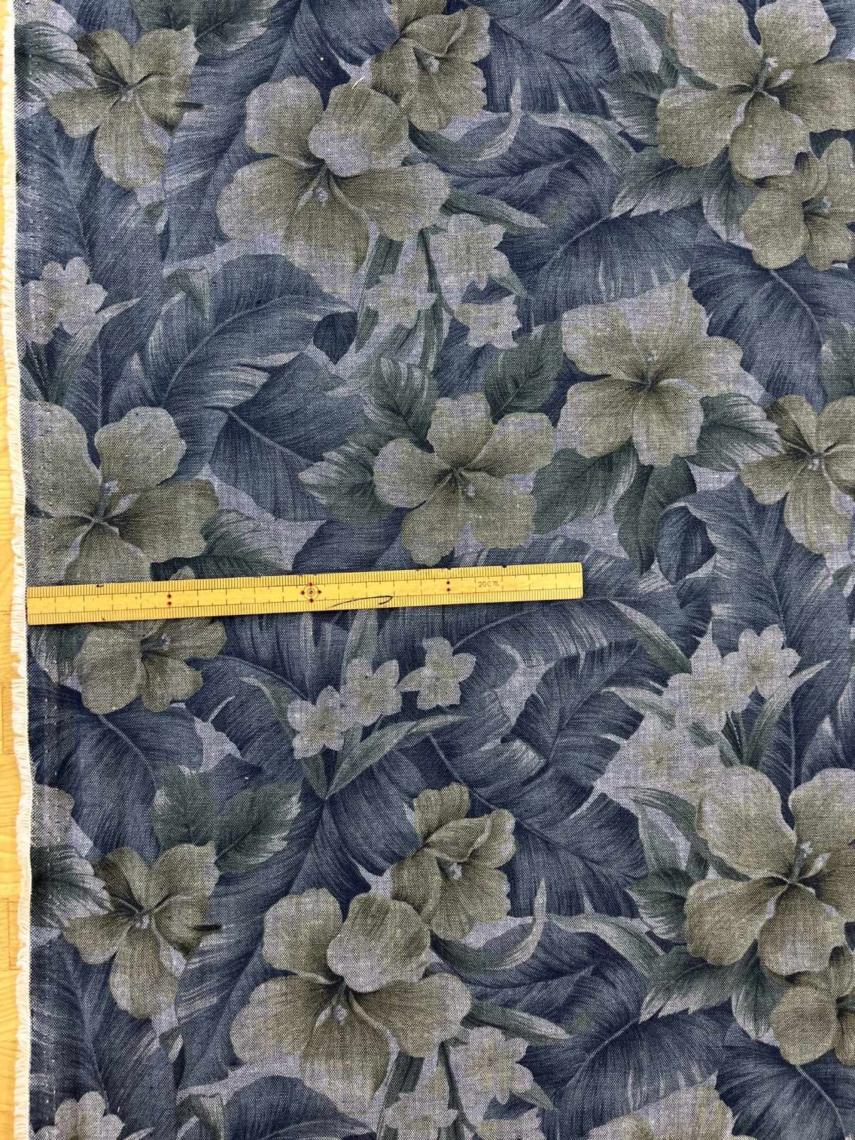 生地:ハイビスカス柄プリント デニム風コットン(デニムブルー) [kiji-2946]