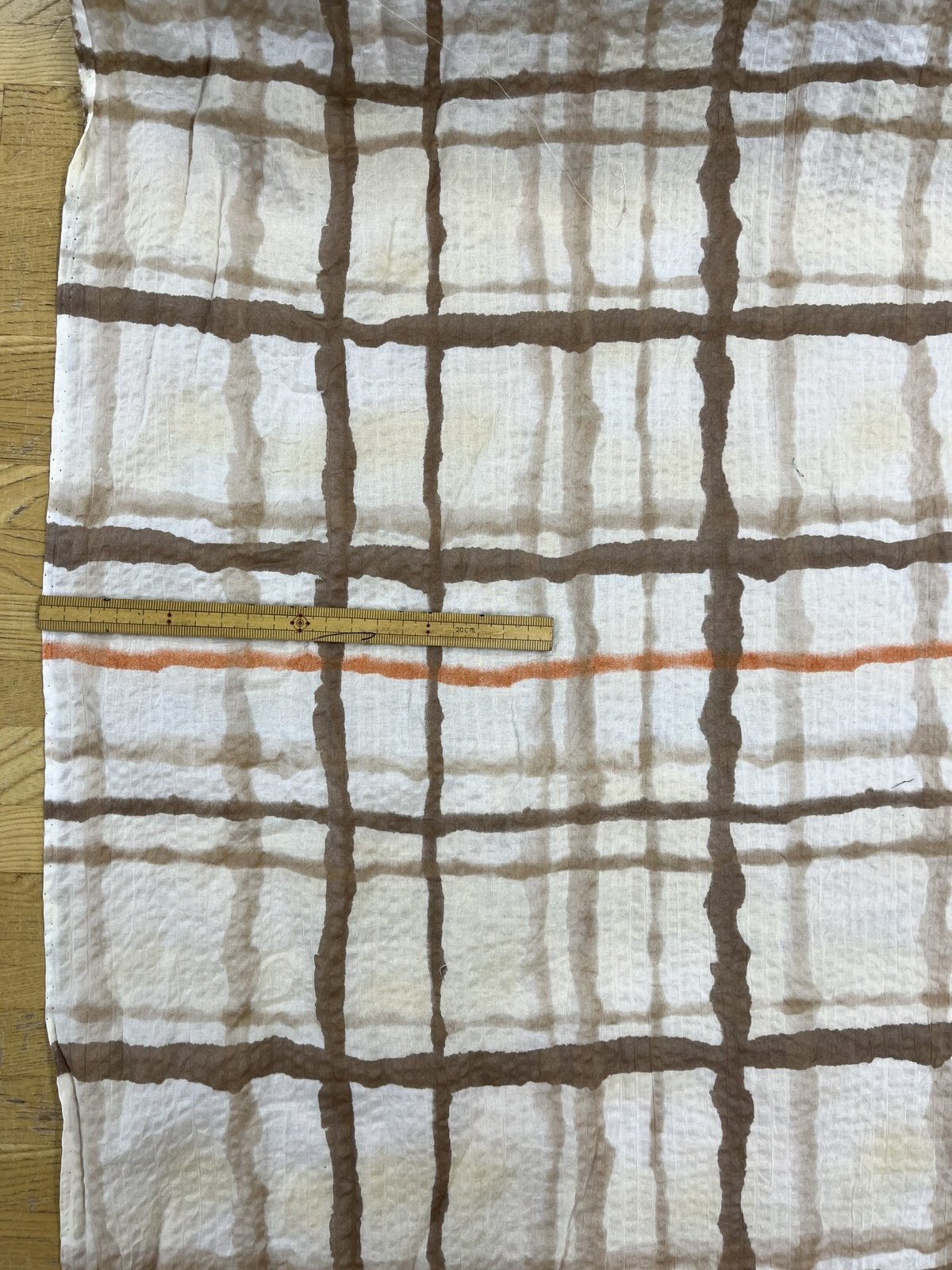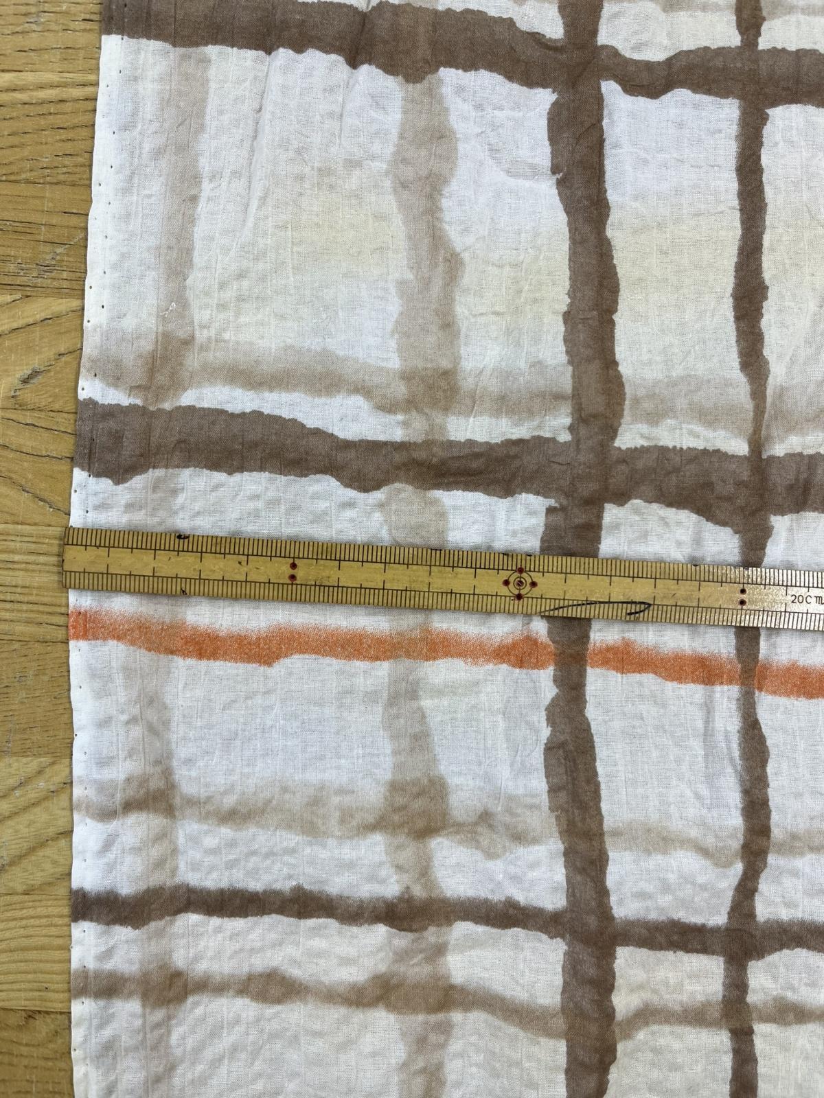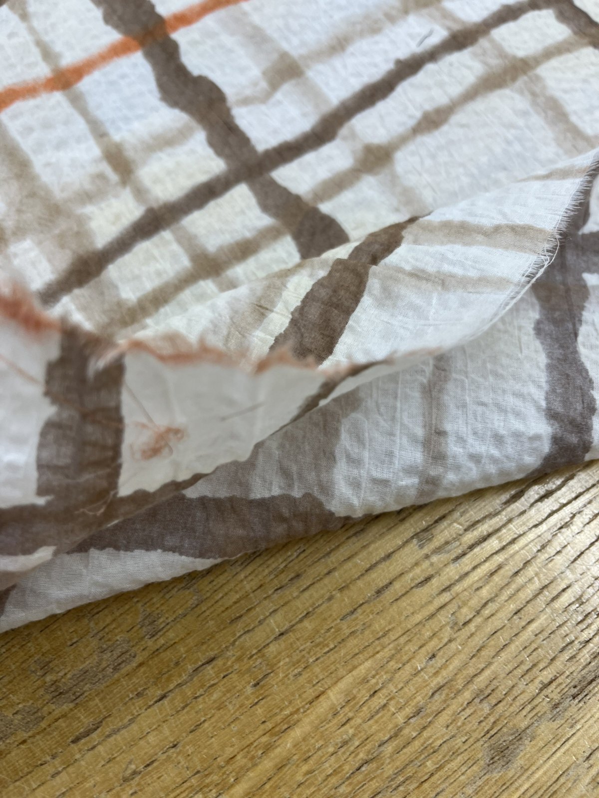 白地ににじんだような茶系の格子柄が柔らかな印象を与える、綿100%のローン生地です。