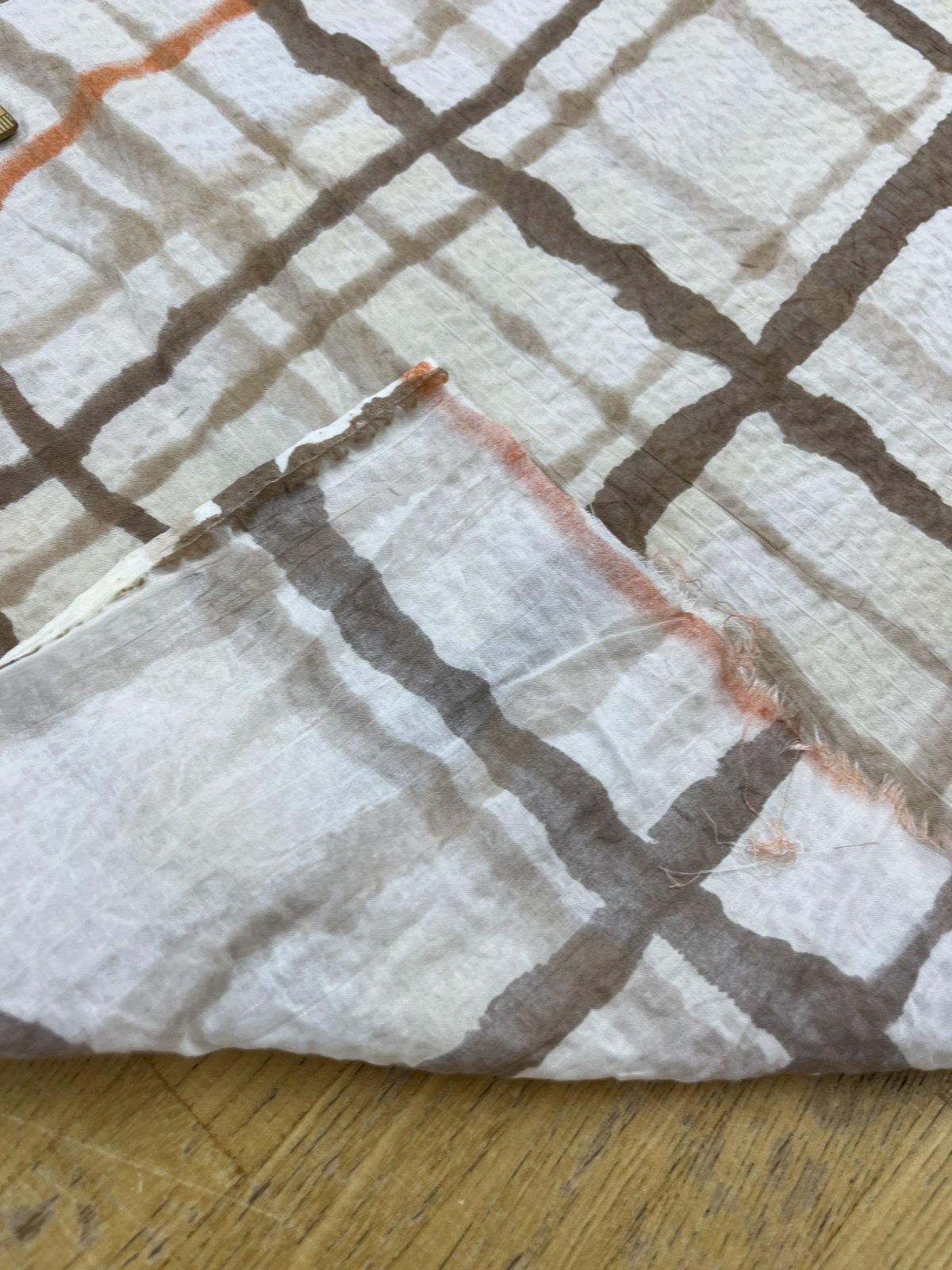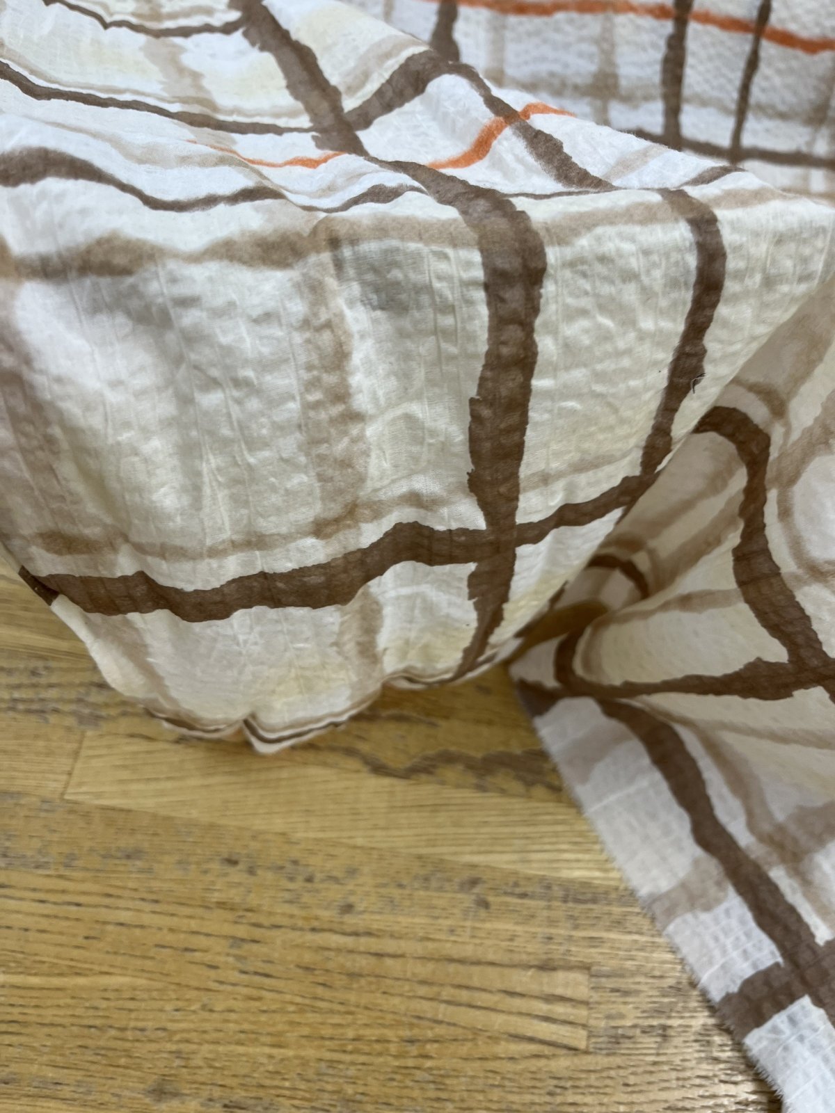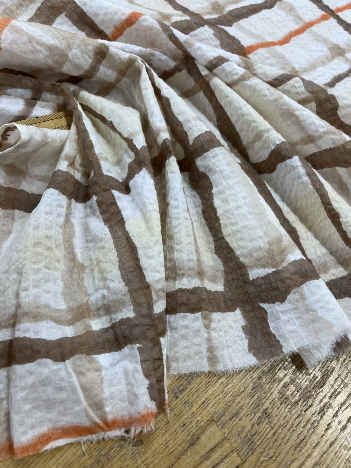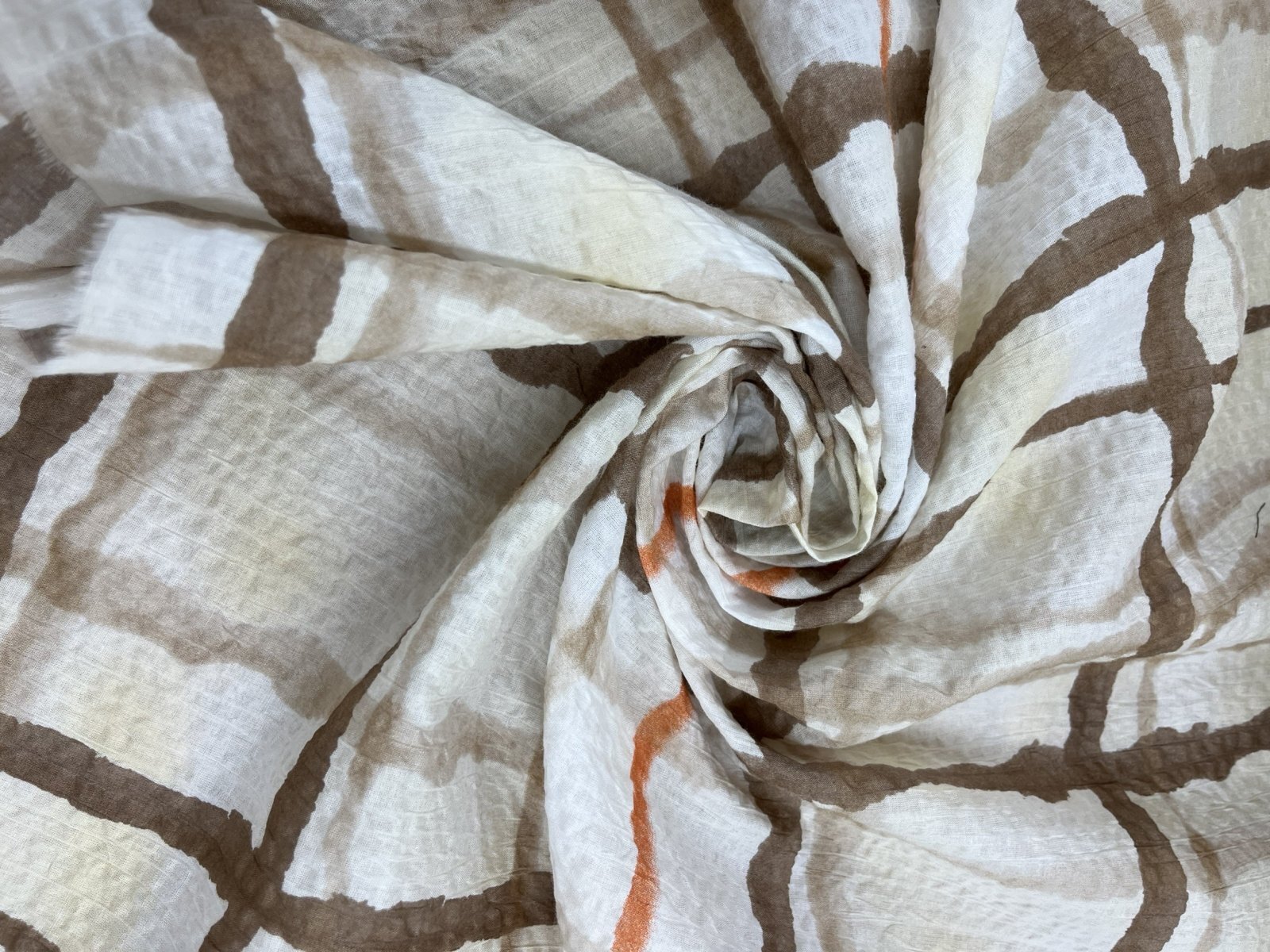白地ににじんだような茶系の格子柄が柔らかな印象を与える、綿100%のローン生地です。