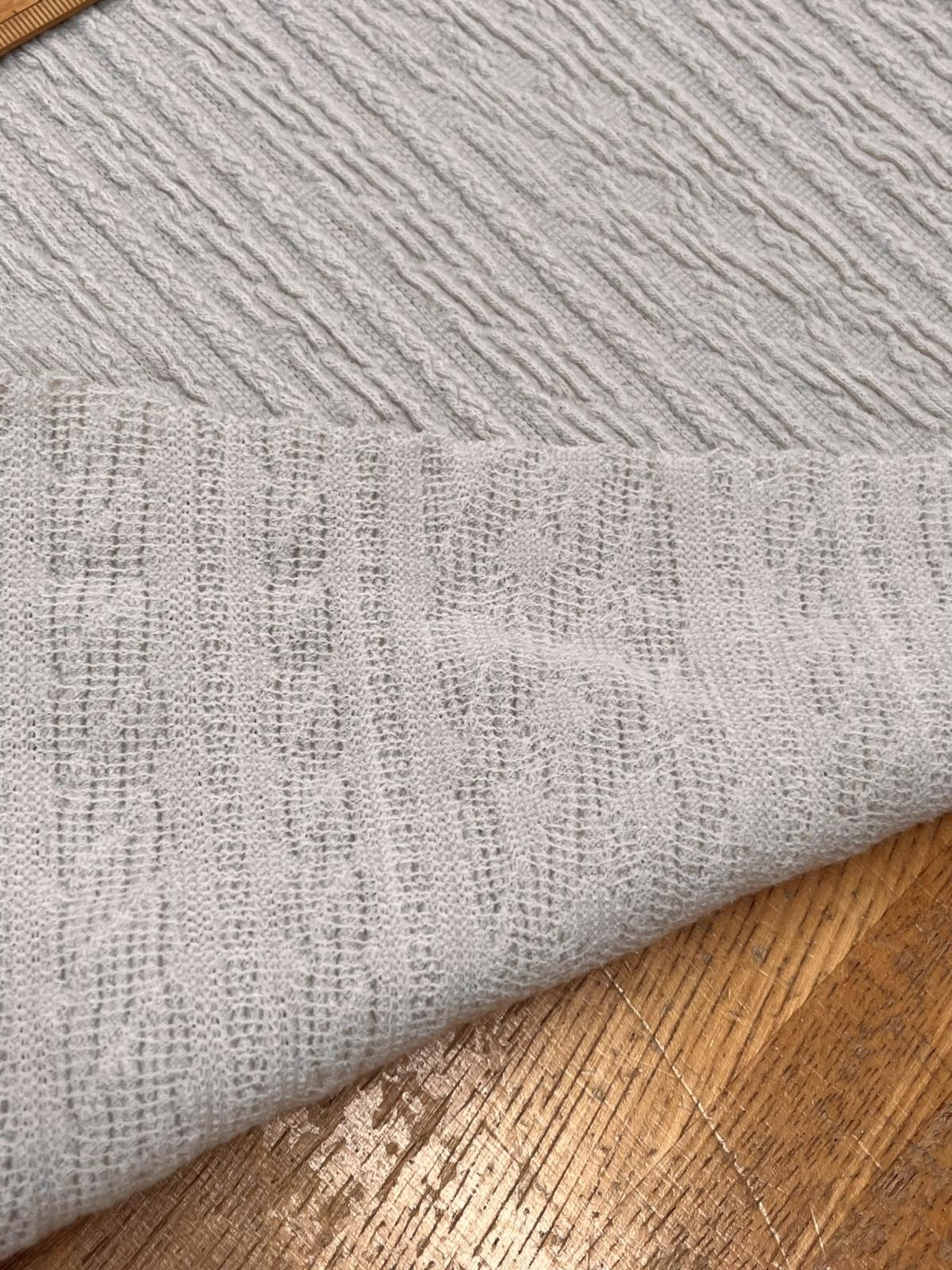しっかりとした中肉の編地ながら柔らかいタッチ。横に良く伸び、縦にも少しストレッチし、PU5%混でキックバックに優れています。
