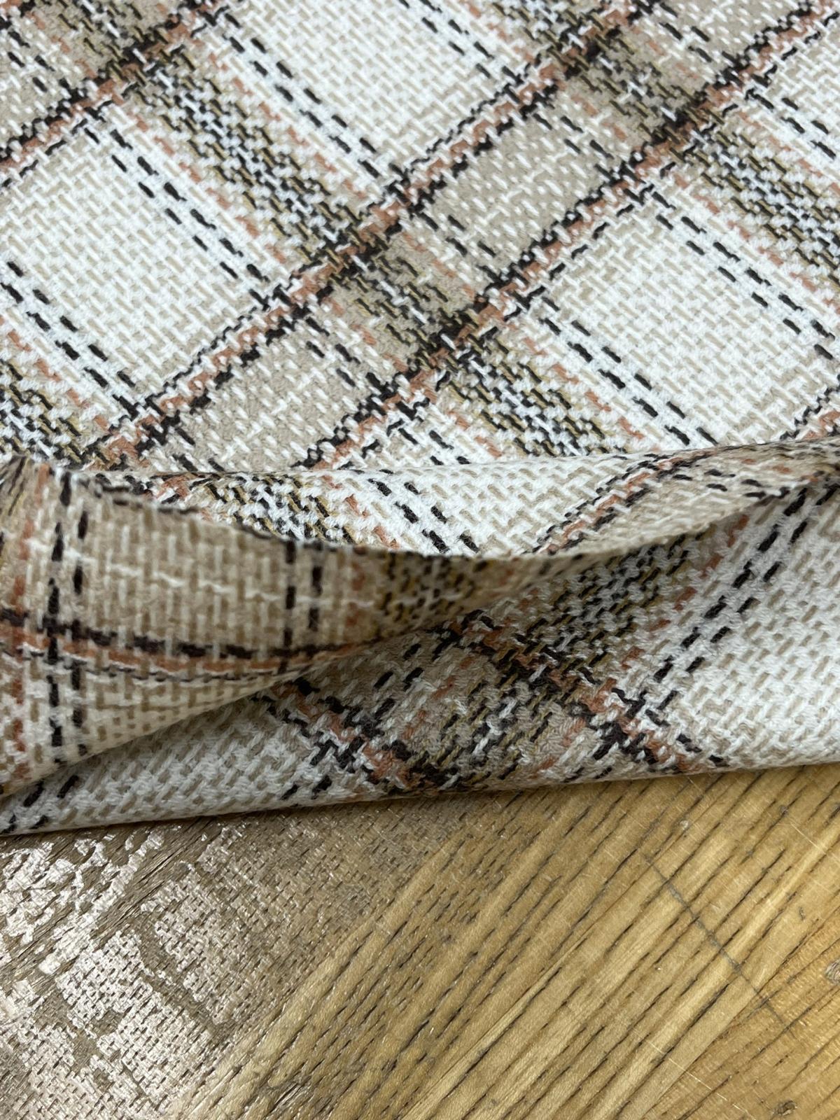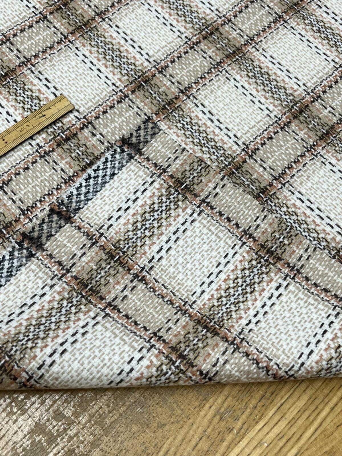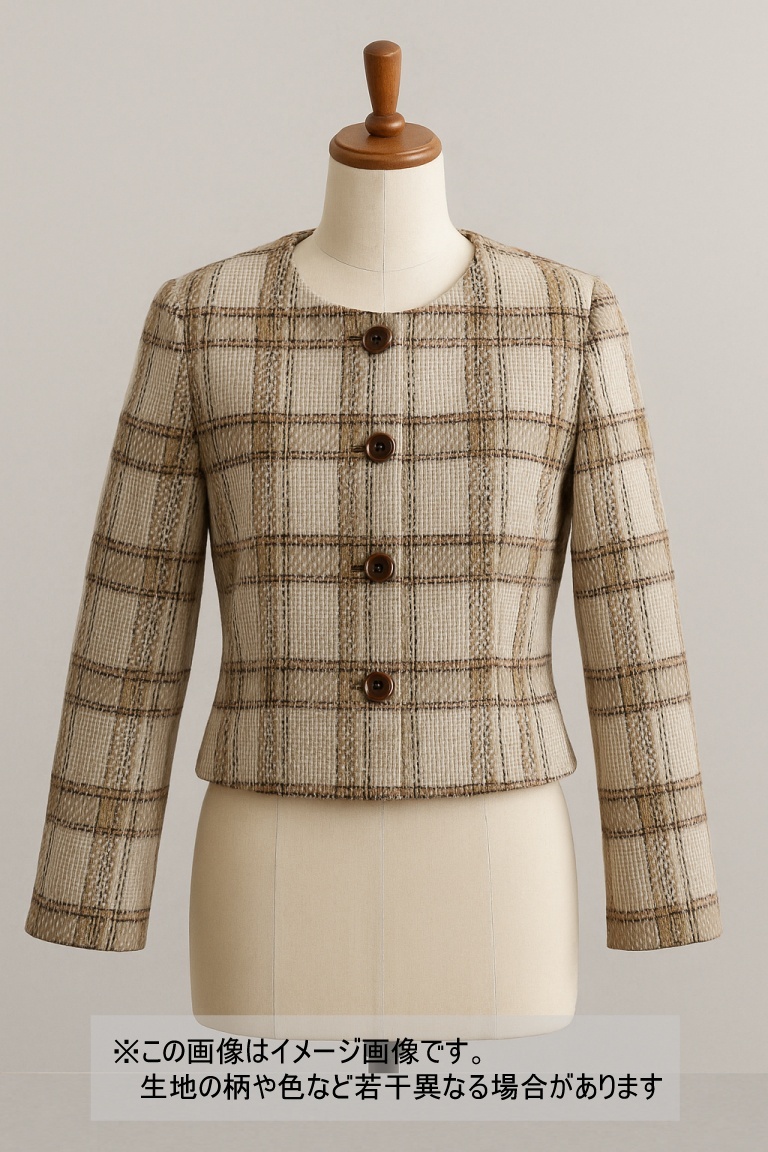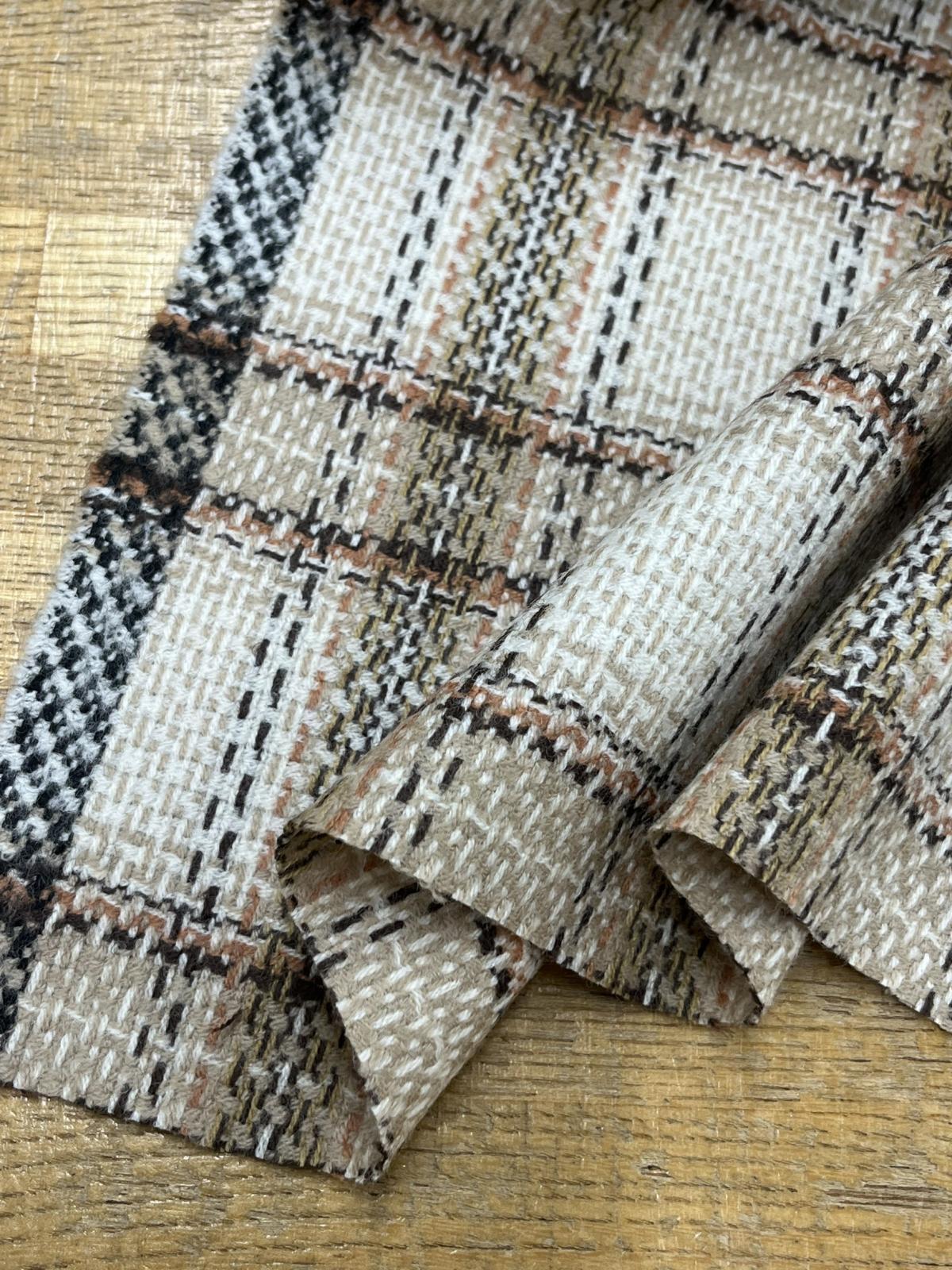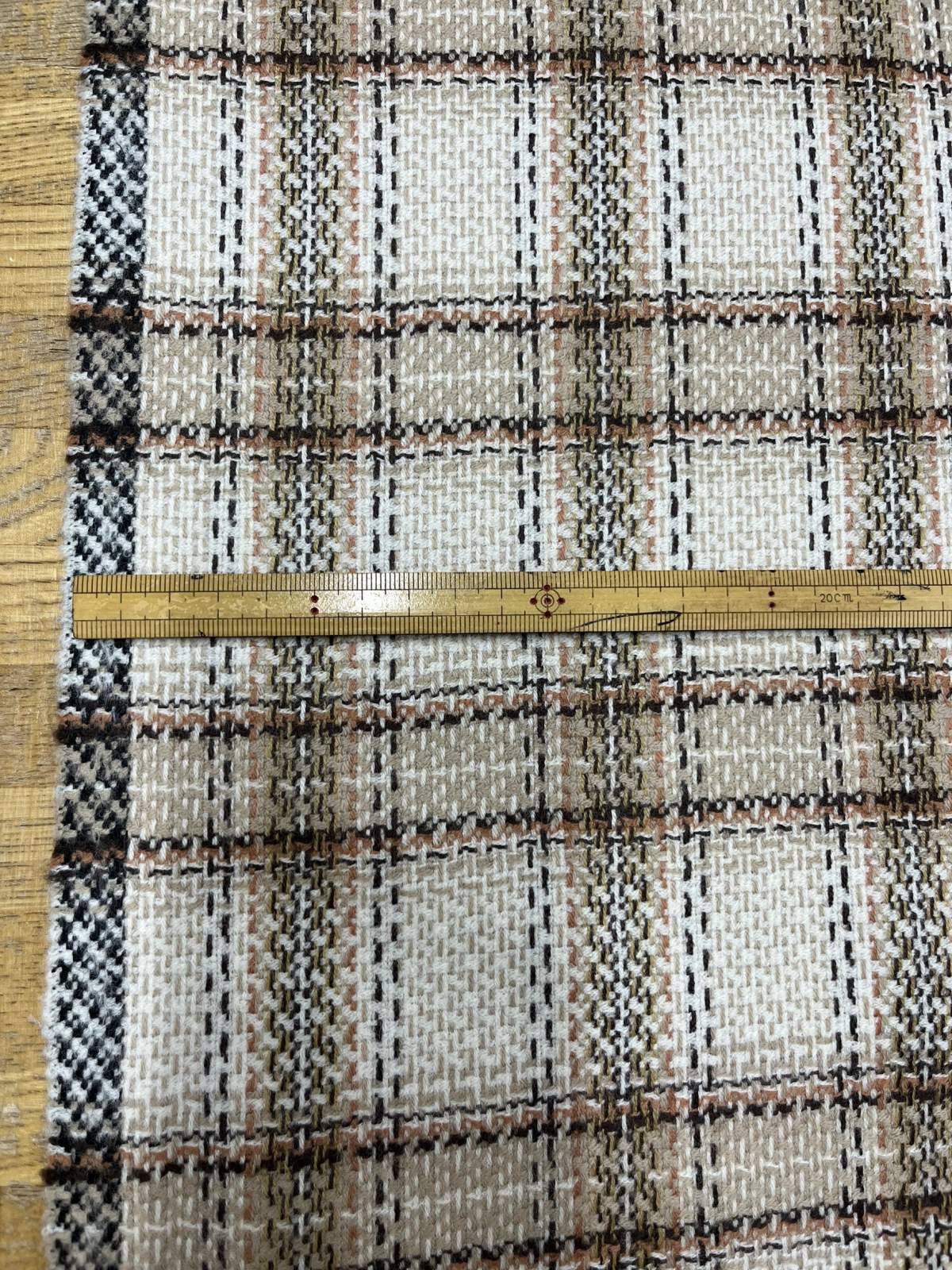 やわらかなベージュとブラウンを基調にした、大きめチェックのウール混生地。