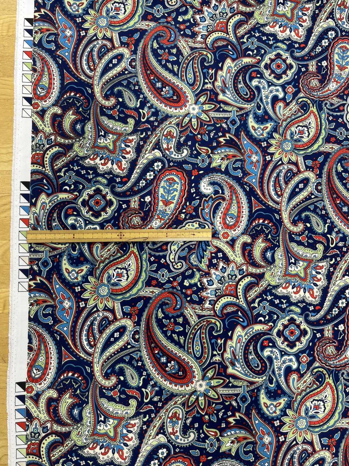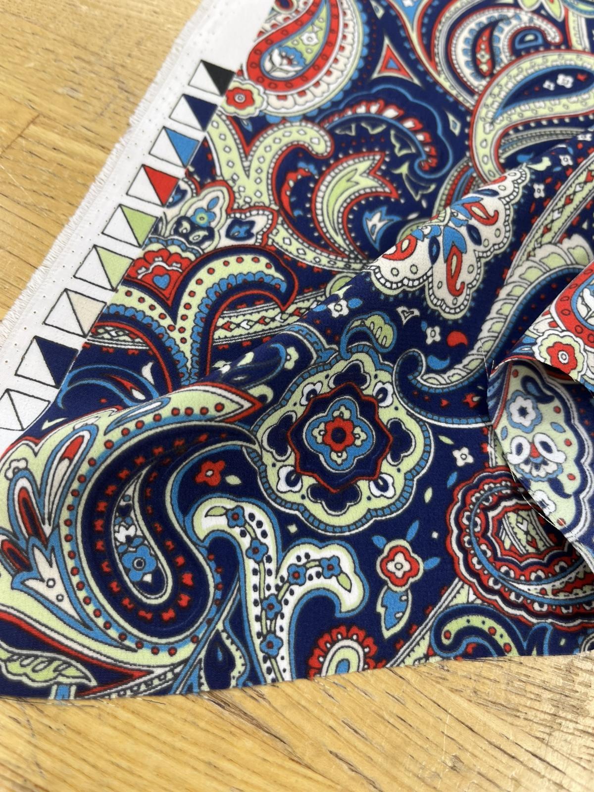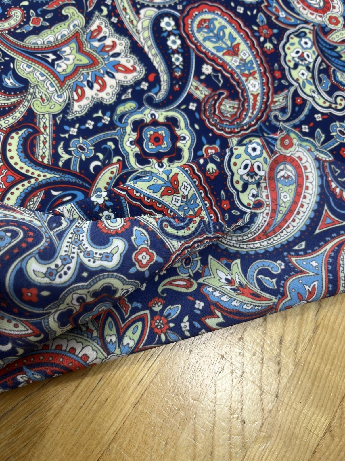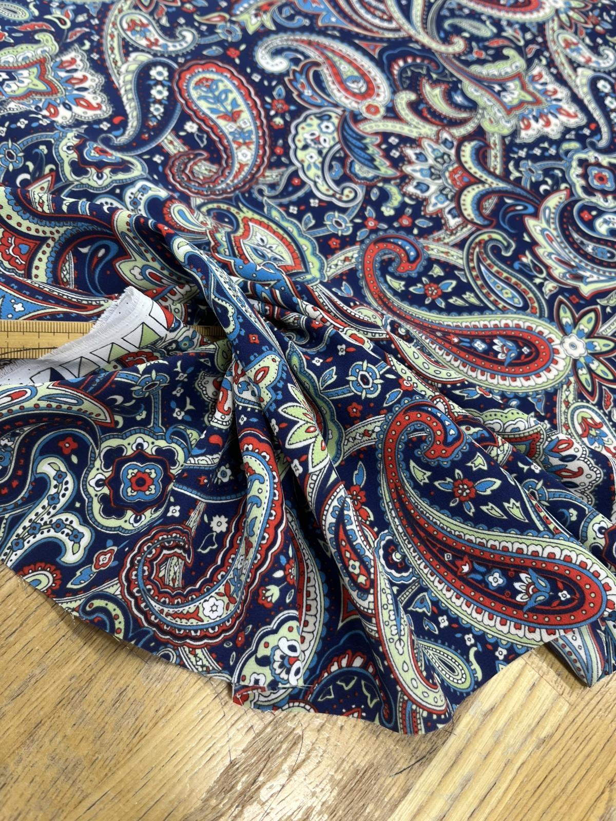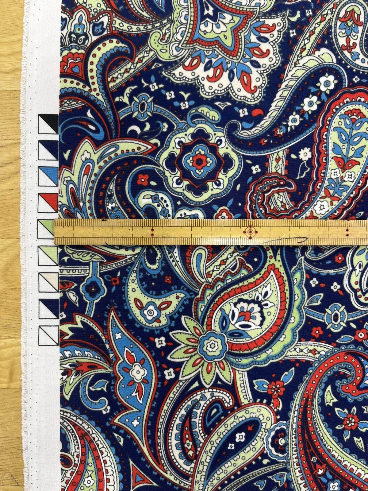 深みのあるネイビーをベースに、レッド・ライトグリーン・ホワイトを組み合わせた華やかなペイズリー柄プリント。