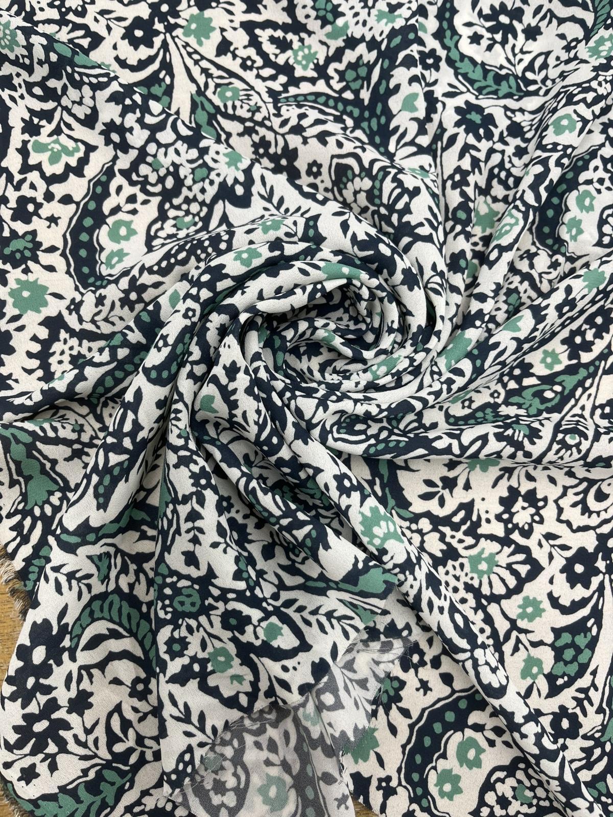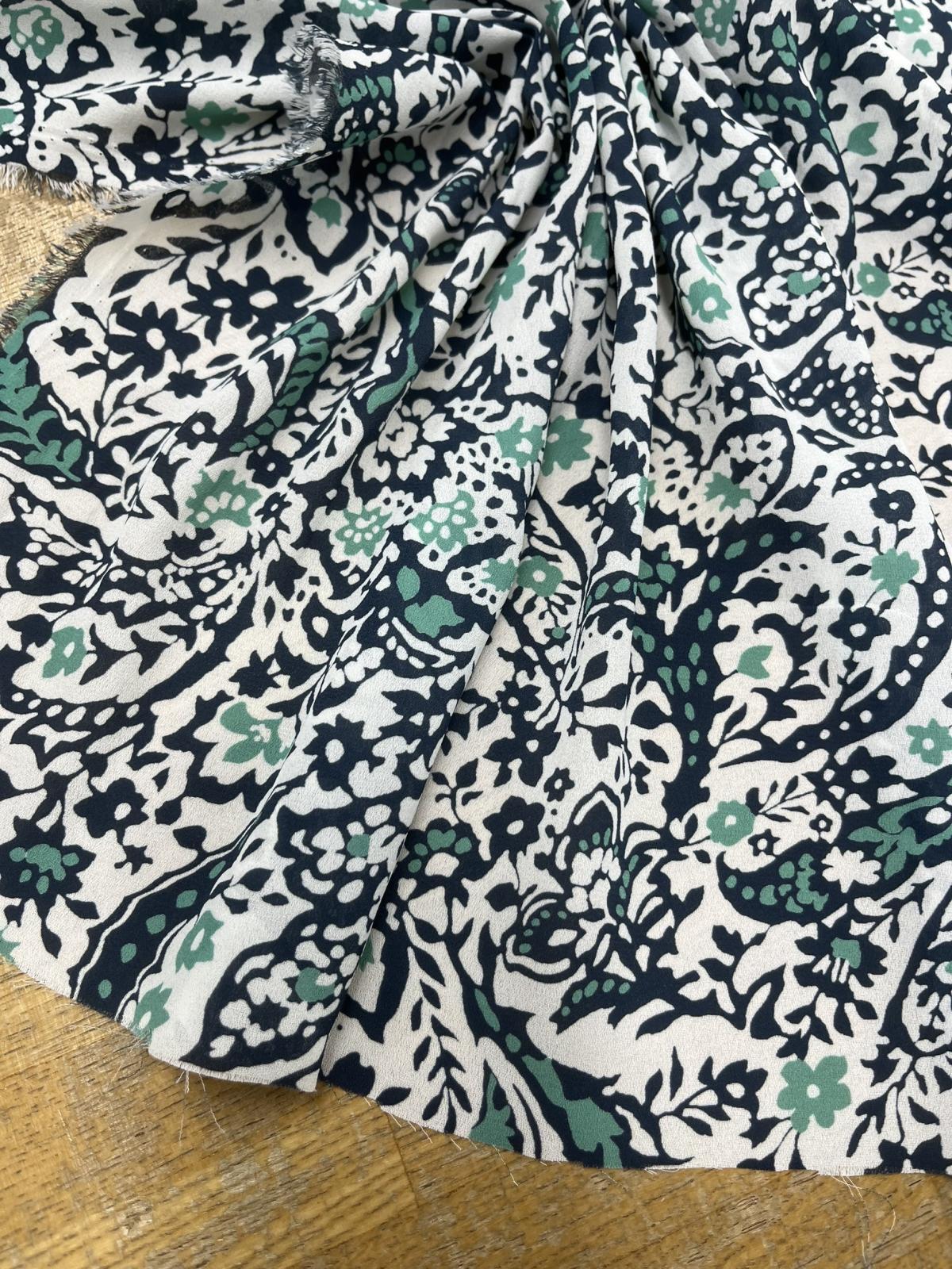 白地に紺とグリーンの手描き風フラワーを散りばめた、華やかで存在感のあるプリント生地です。