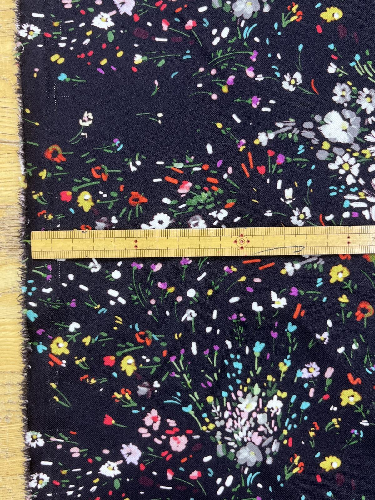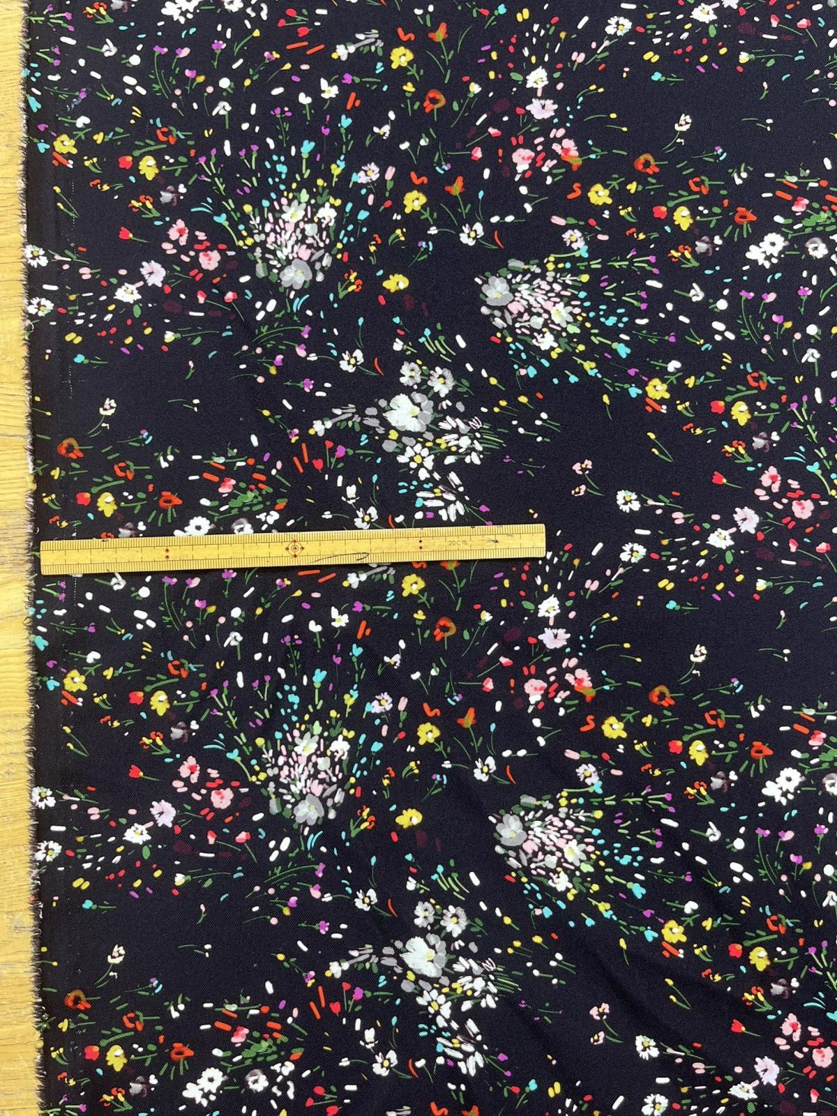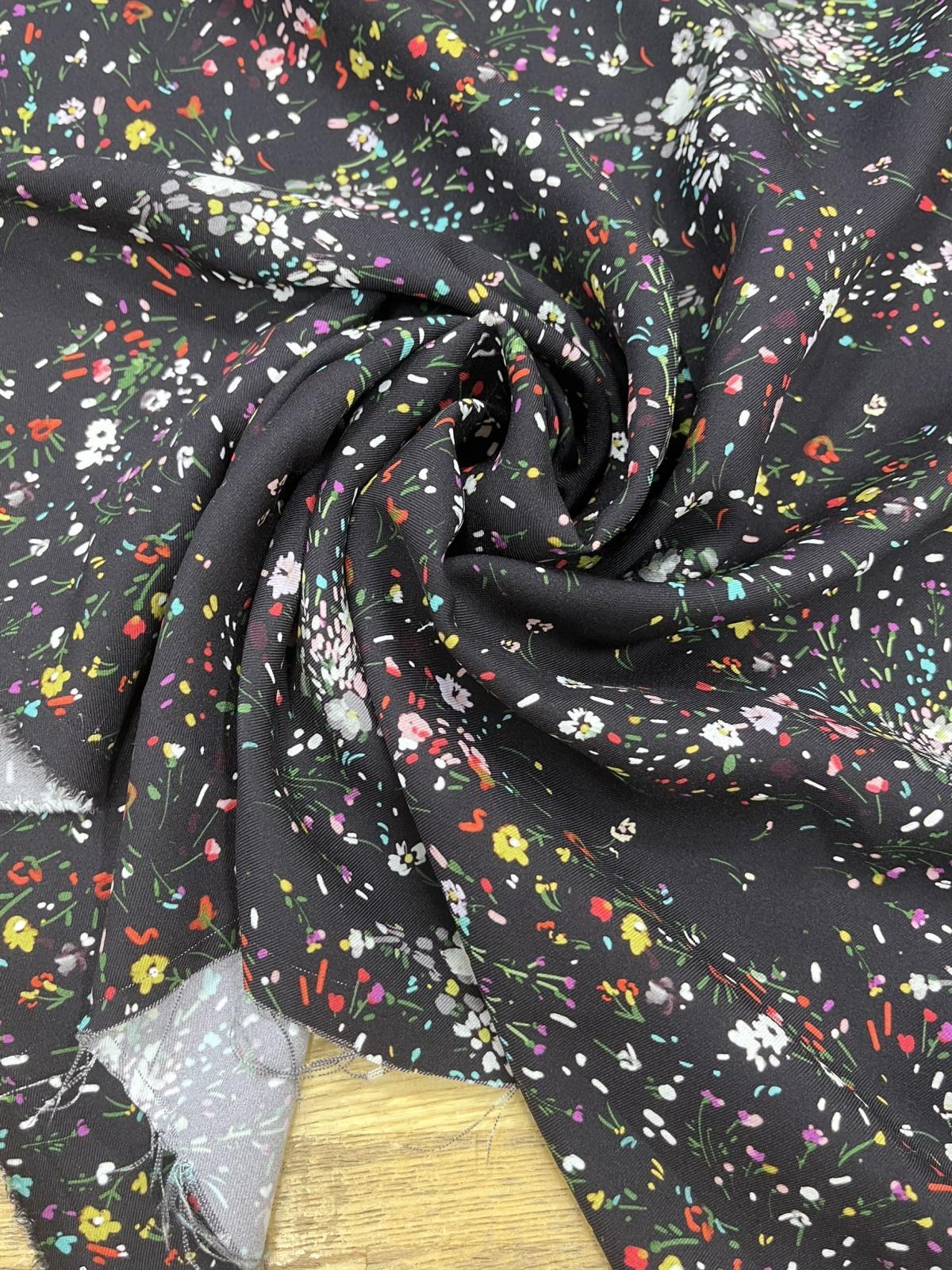 黒地にカラフルな小花を散りばめた華やかなプリント生地。