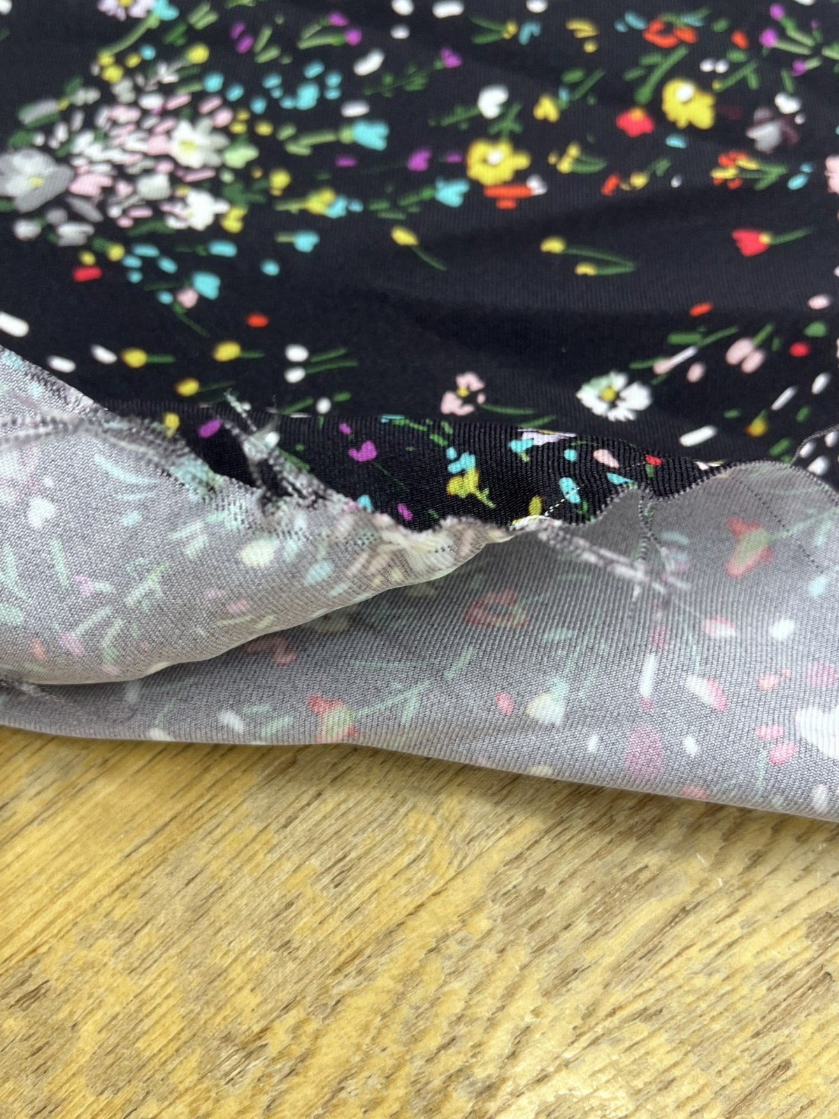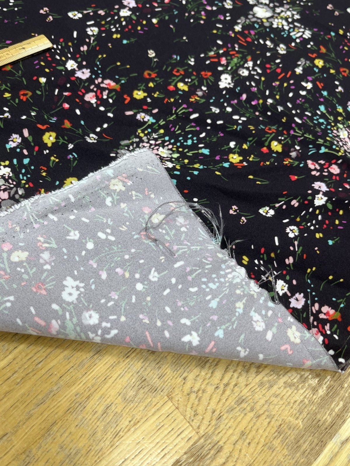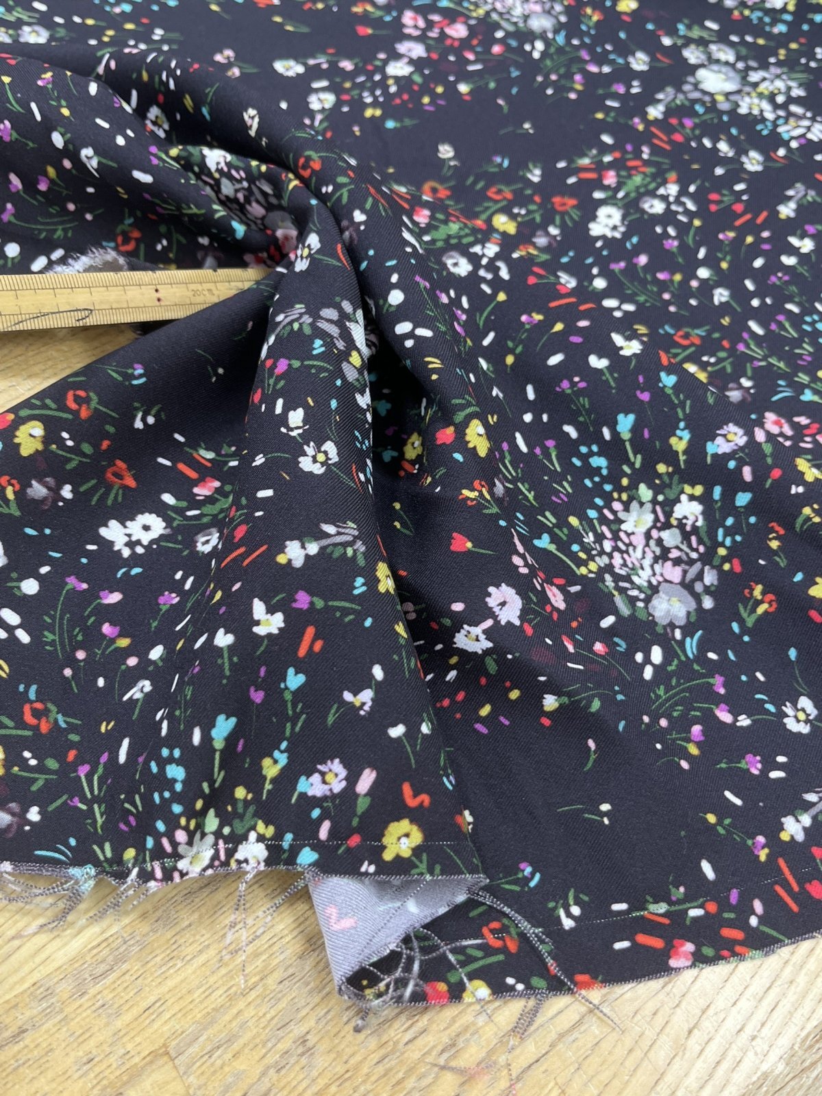 黒地にカラフルな小花を散りばめた華やかなプリント生地。