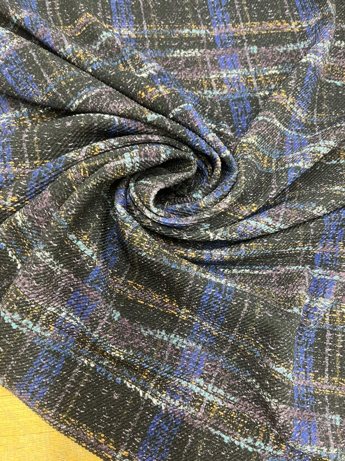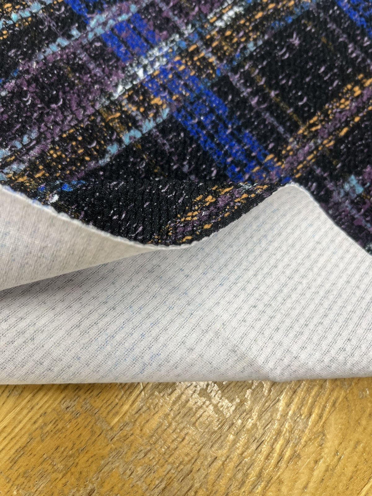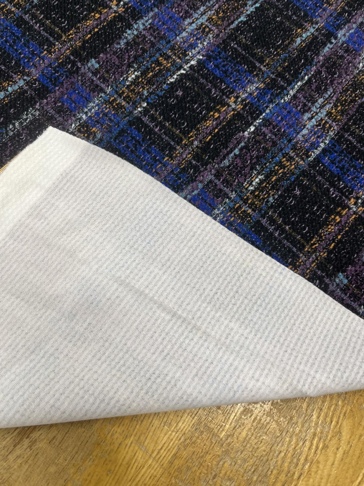 生地:ポリエステル100%手描き風チェック柄プリントニット(ネイビー系)