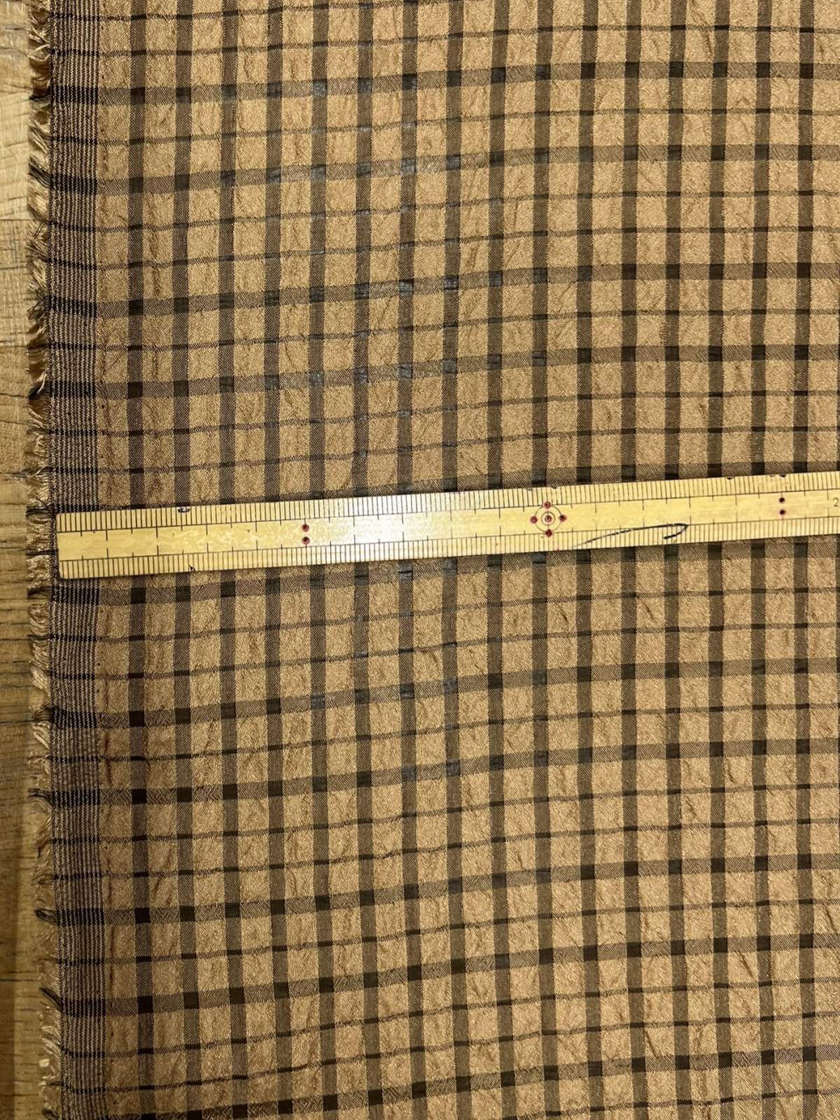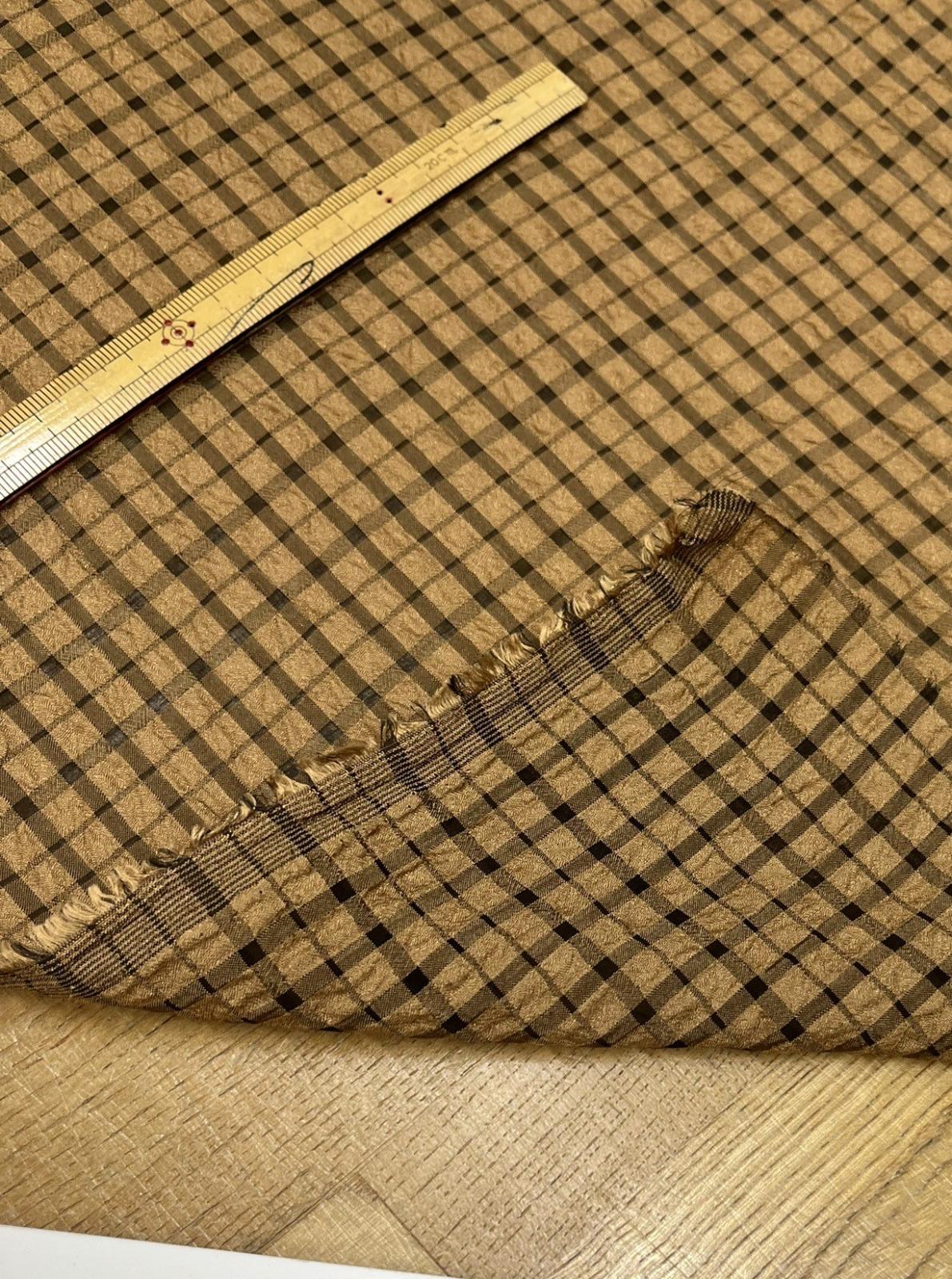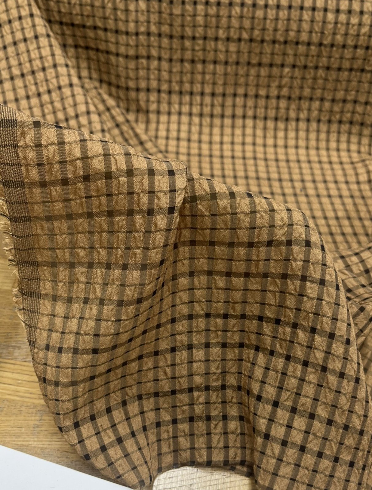 茶色の地に黒のラインを重ねた細かなチェック柄が特徴の、軽やかな薄手素材です。