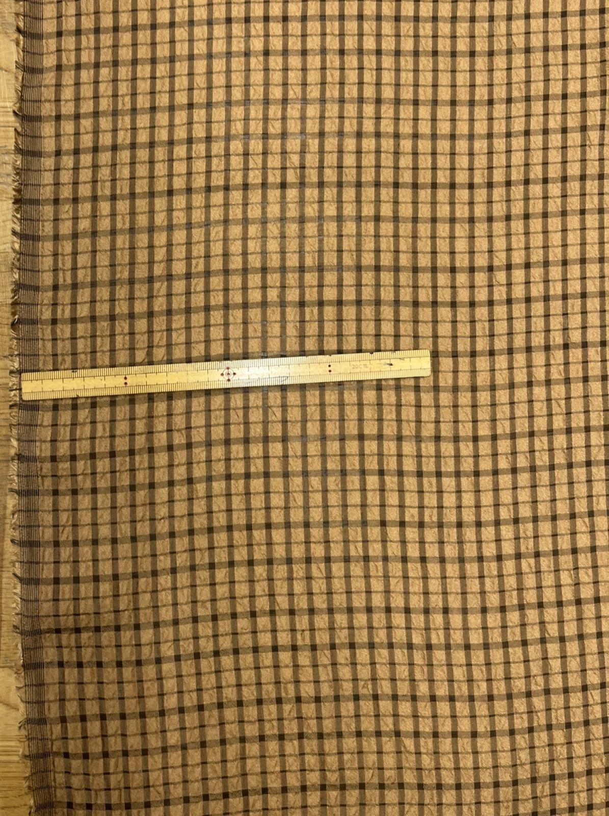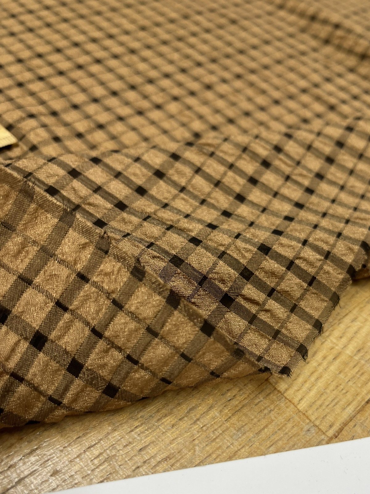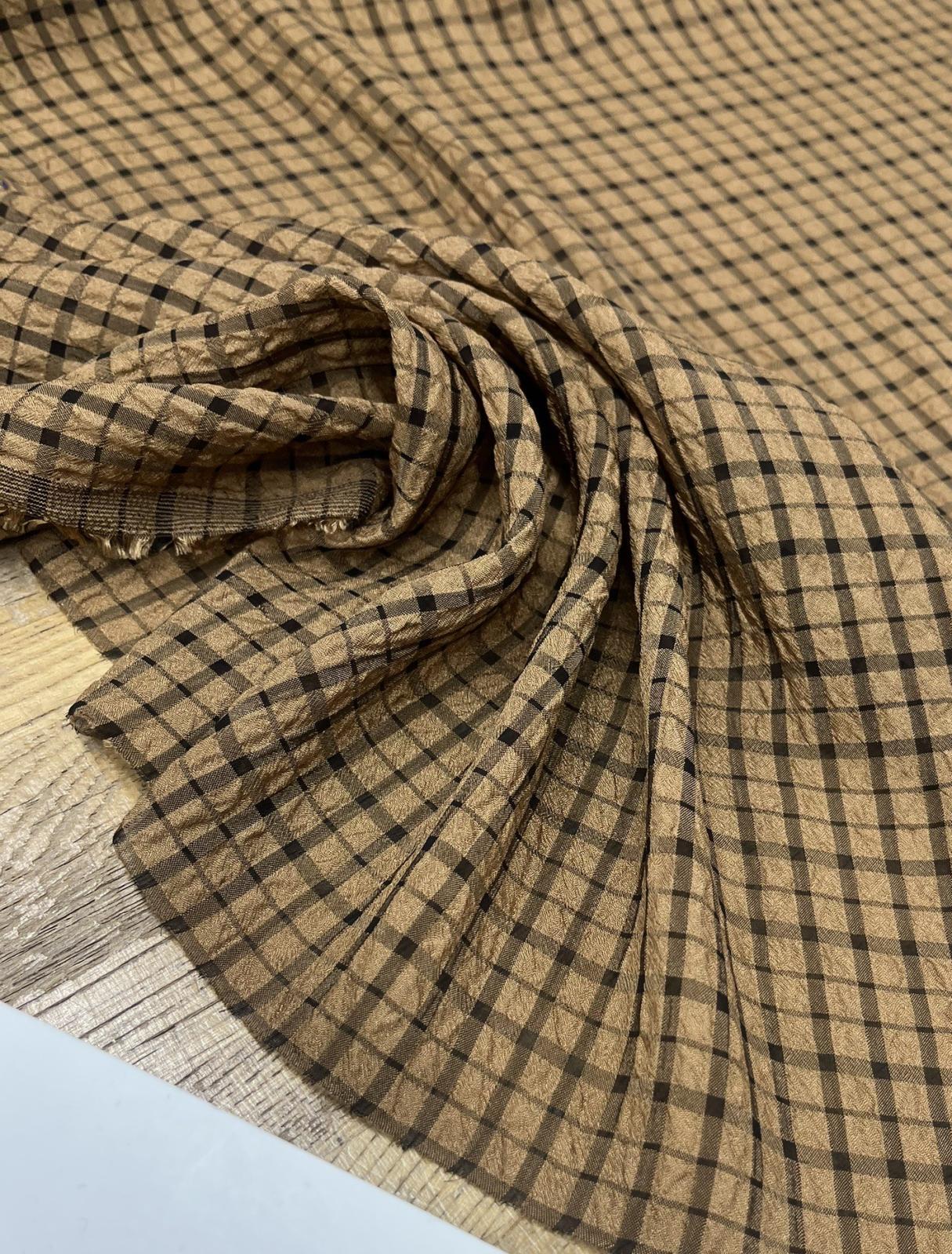 茶色の地に黒のラインを重ねた細かなチェック柄が特徴の、軽やかな薄手素材です。