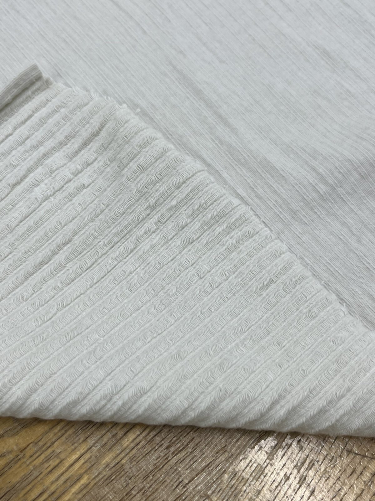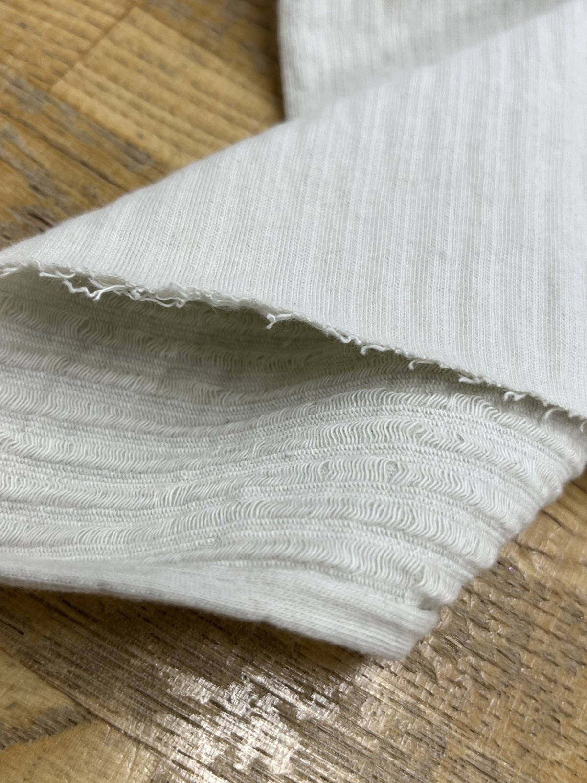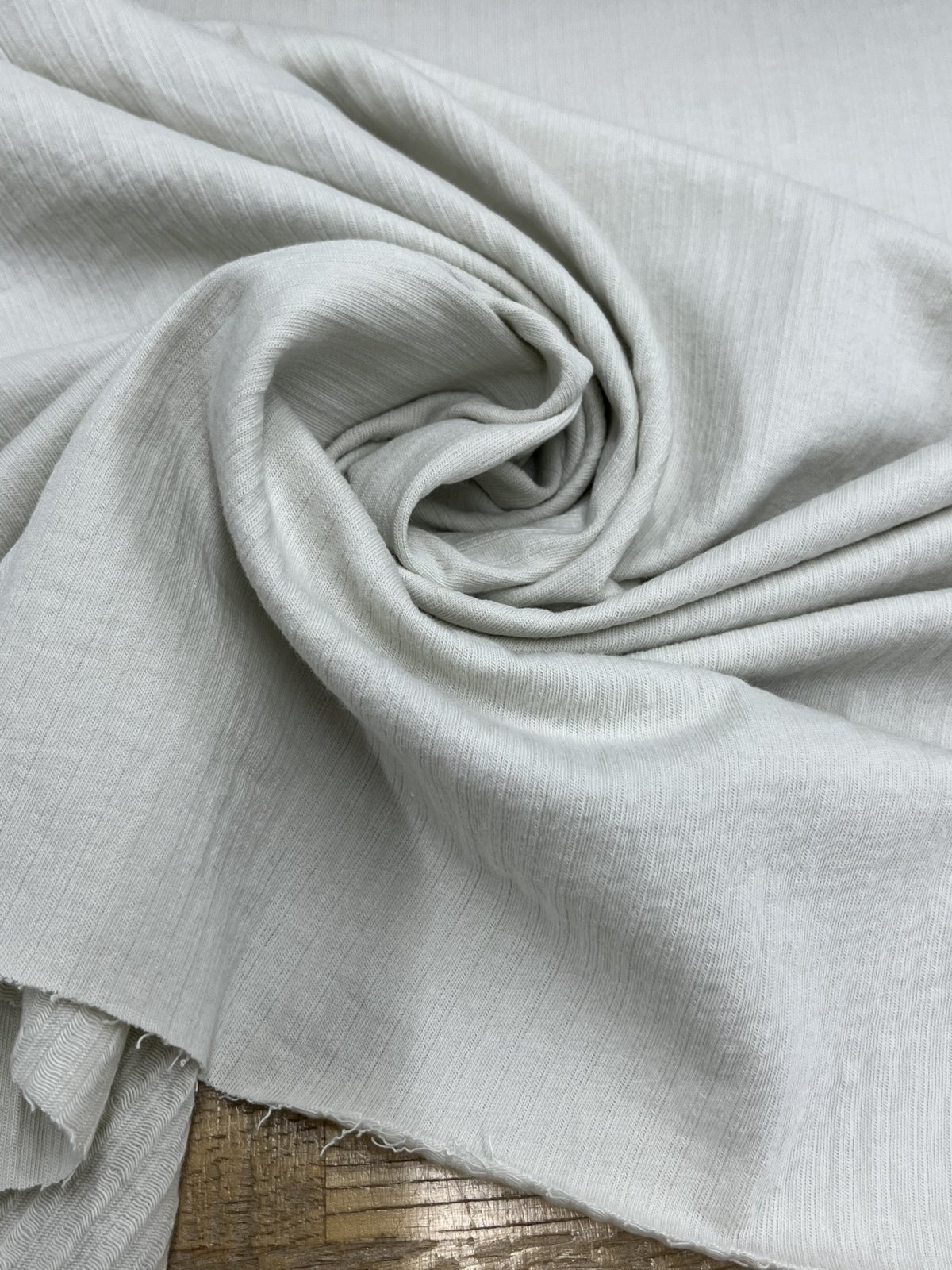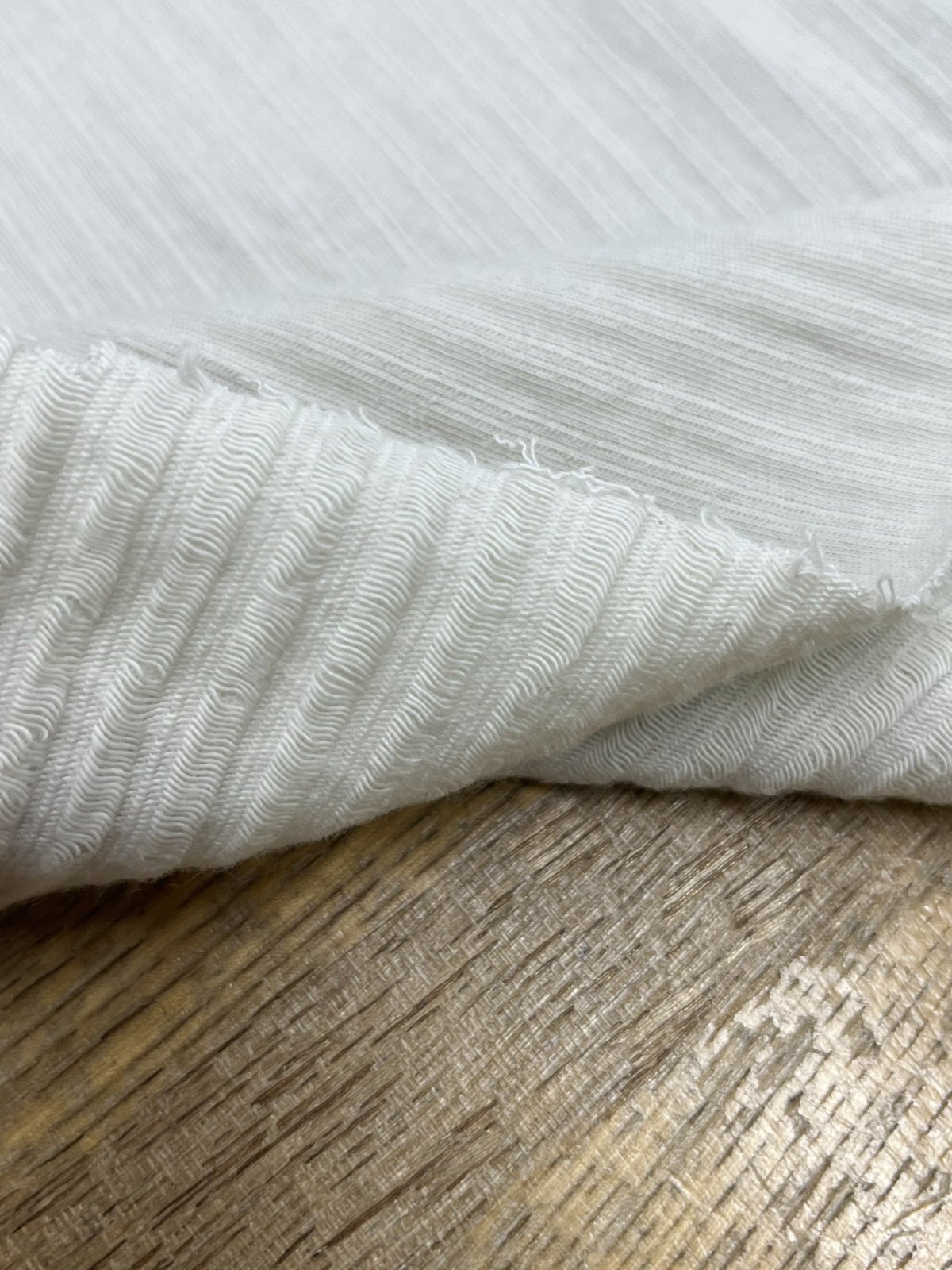やさしいサンドベージュカラーに、織りで表現された細かなストライプが特徴のニット素材です。