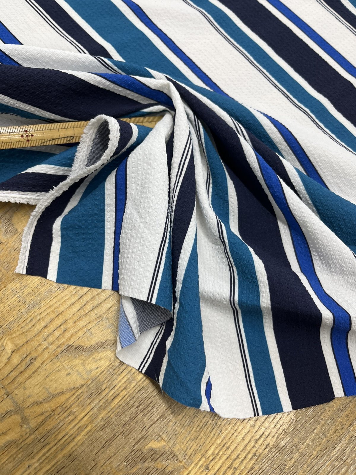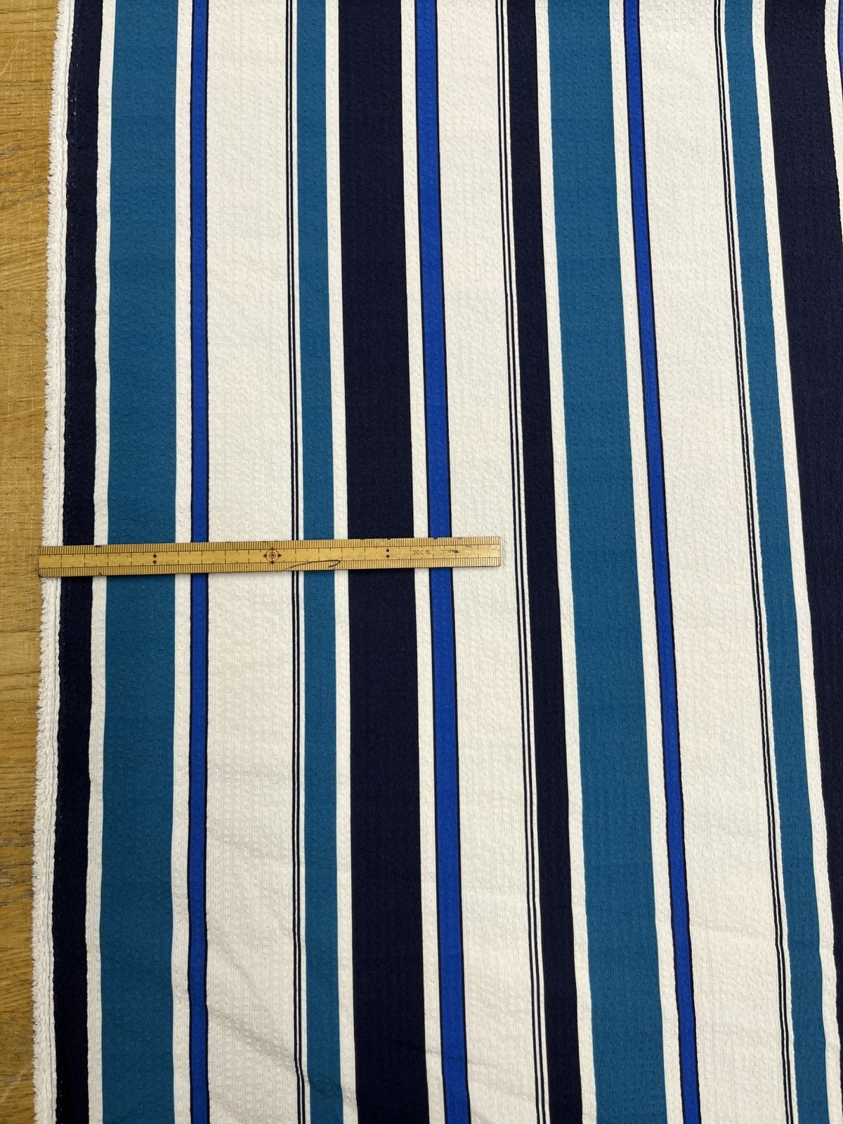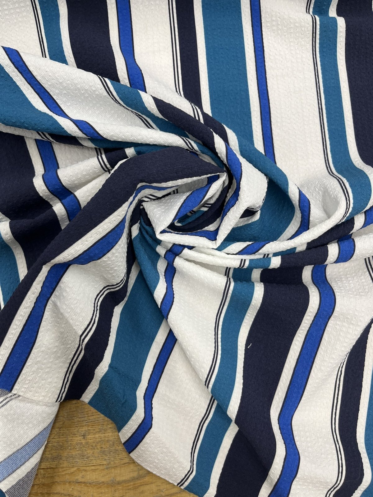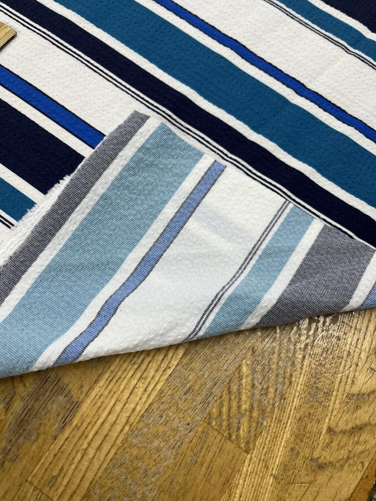 白地にブルーのストライプ柄が映える、爽やかで清潔感のある2WAYストレッチ生地です。
