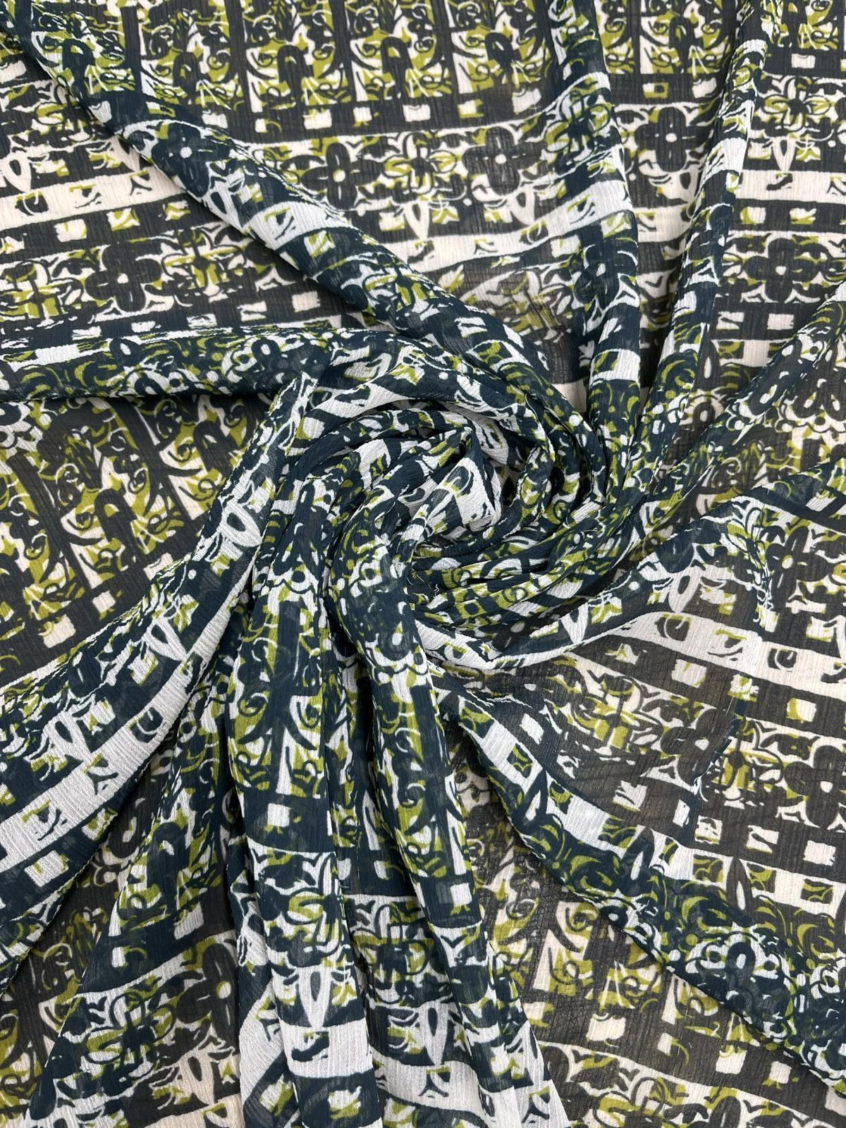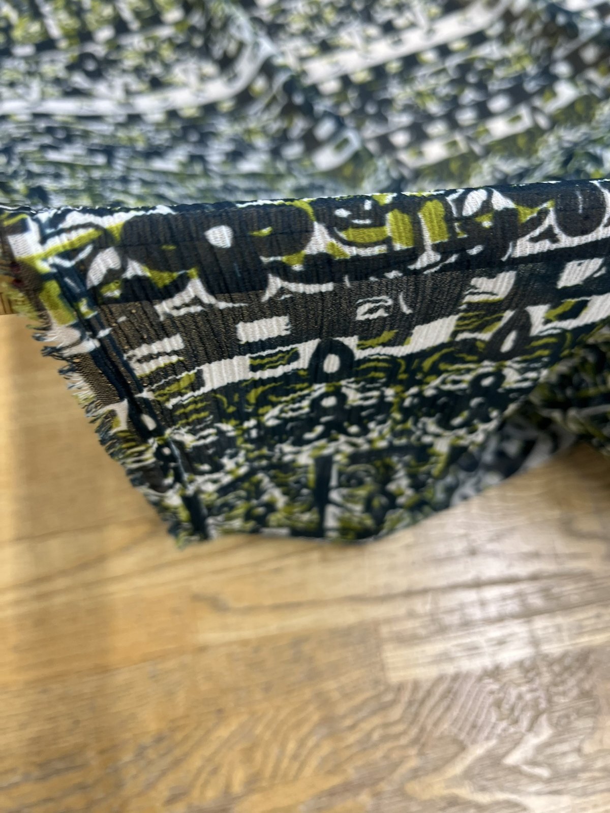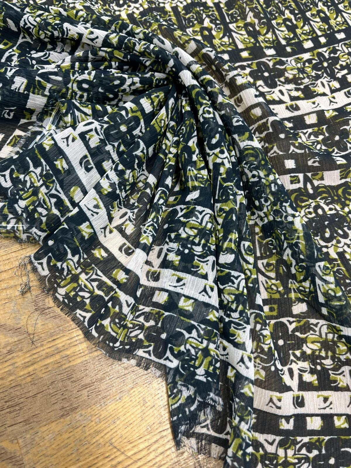 凹凸のある楊柳組織に、グリーンとブラックの柄をプリントした表情豊かな素材です。