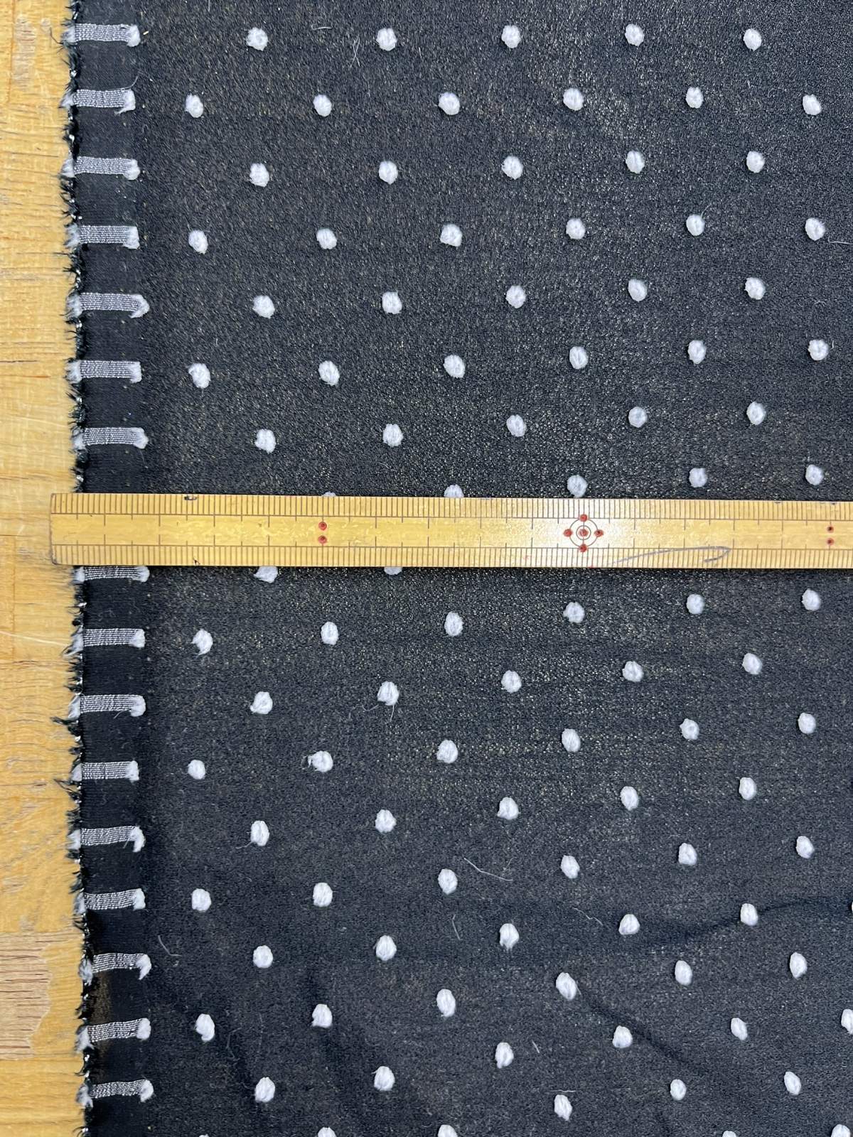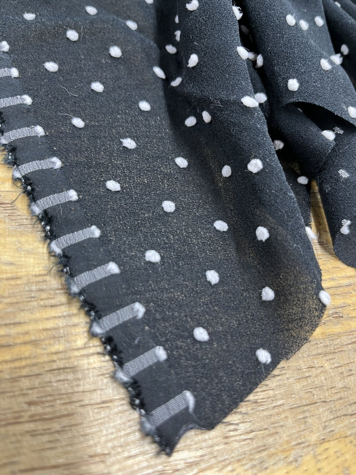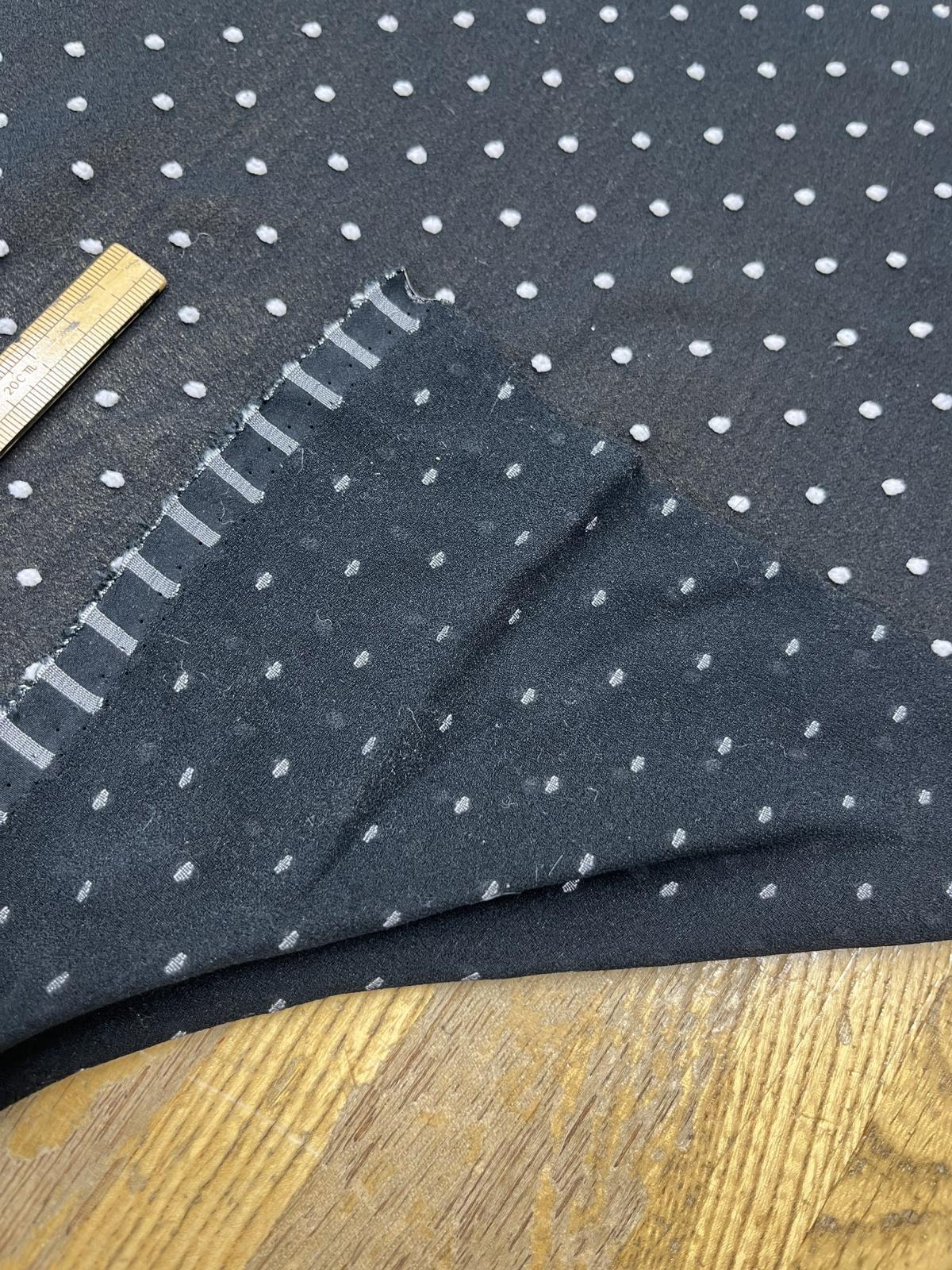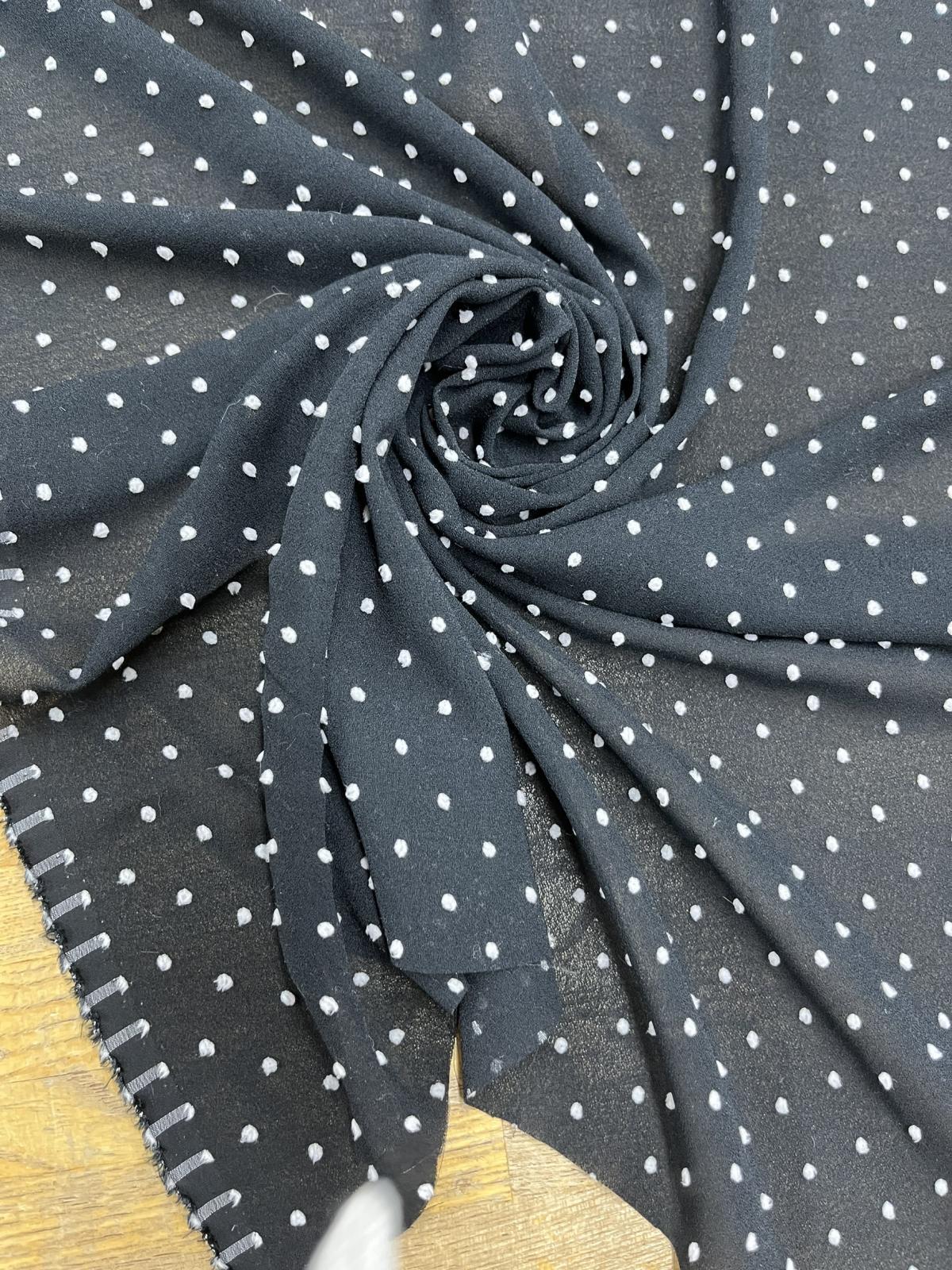 黒地のジョーゼットに、白のドットが立体的に表現されたスノーカット生地です。