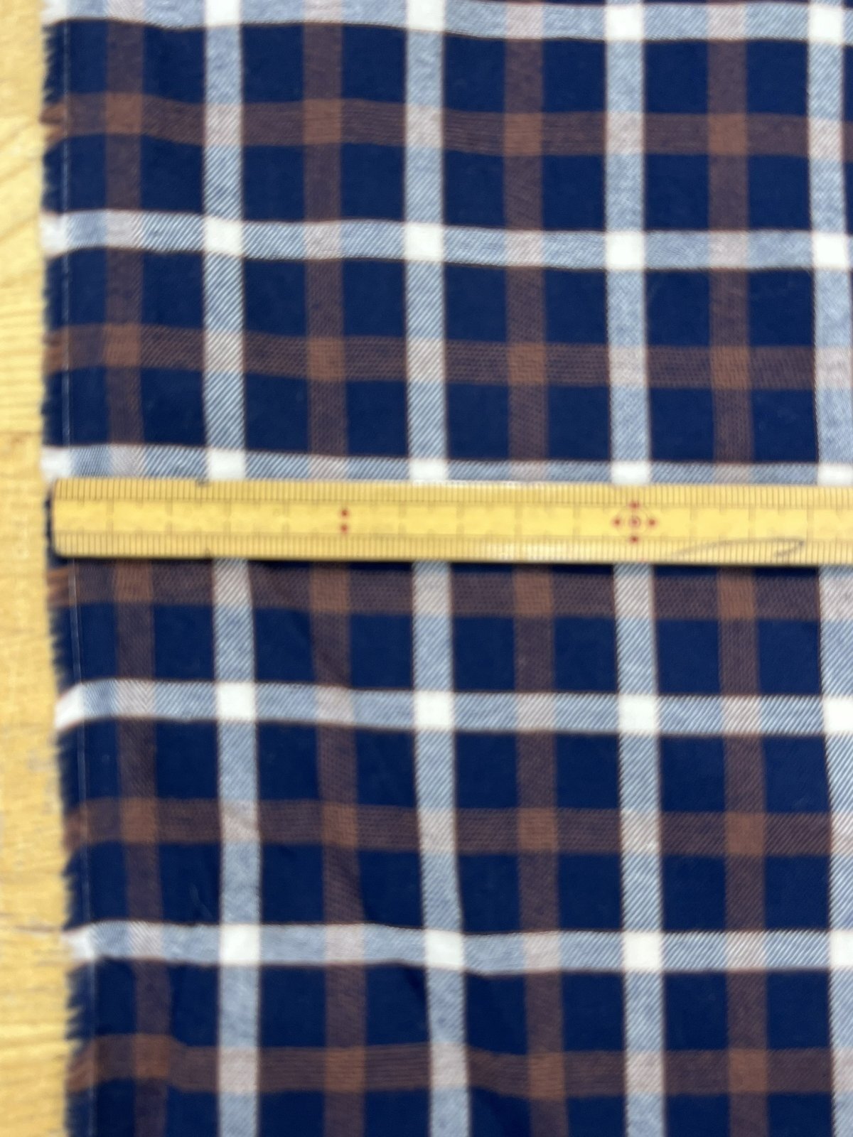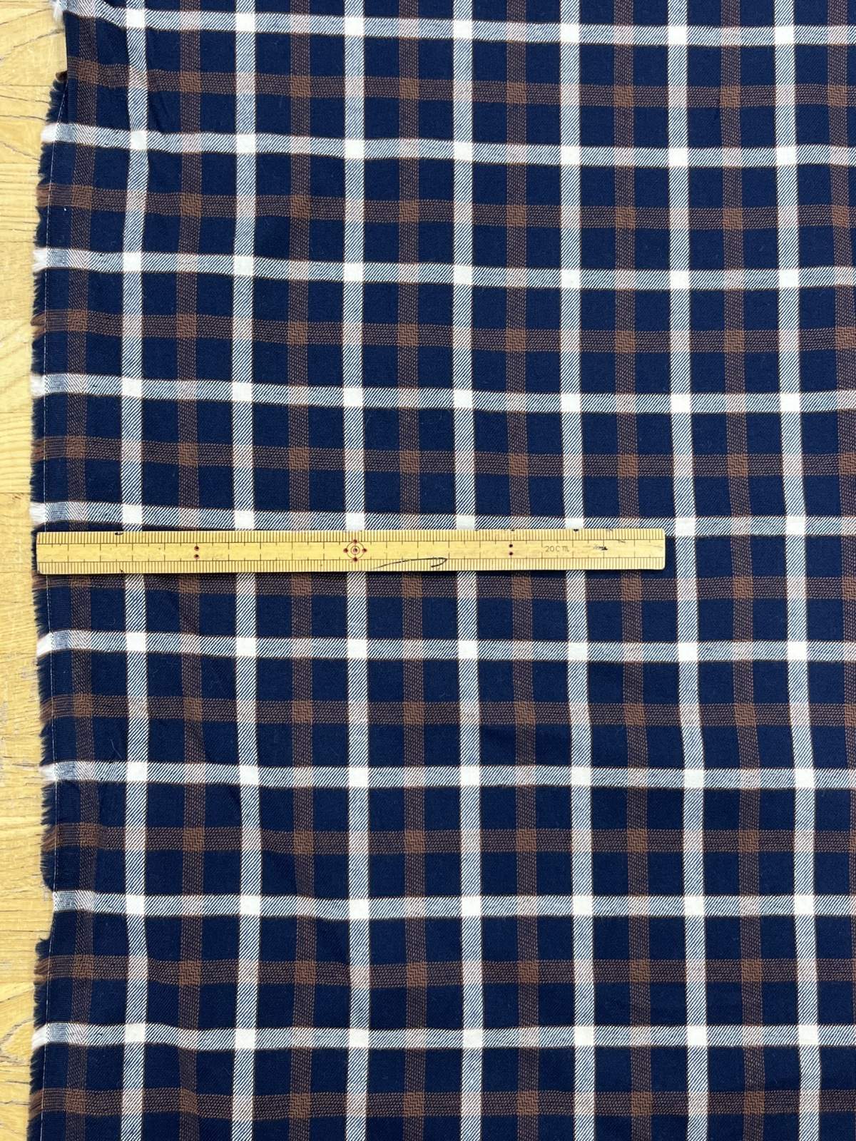 紺をベースに、茶と白を組み合わせた落ち着きのあるチェック柄。