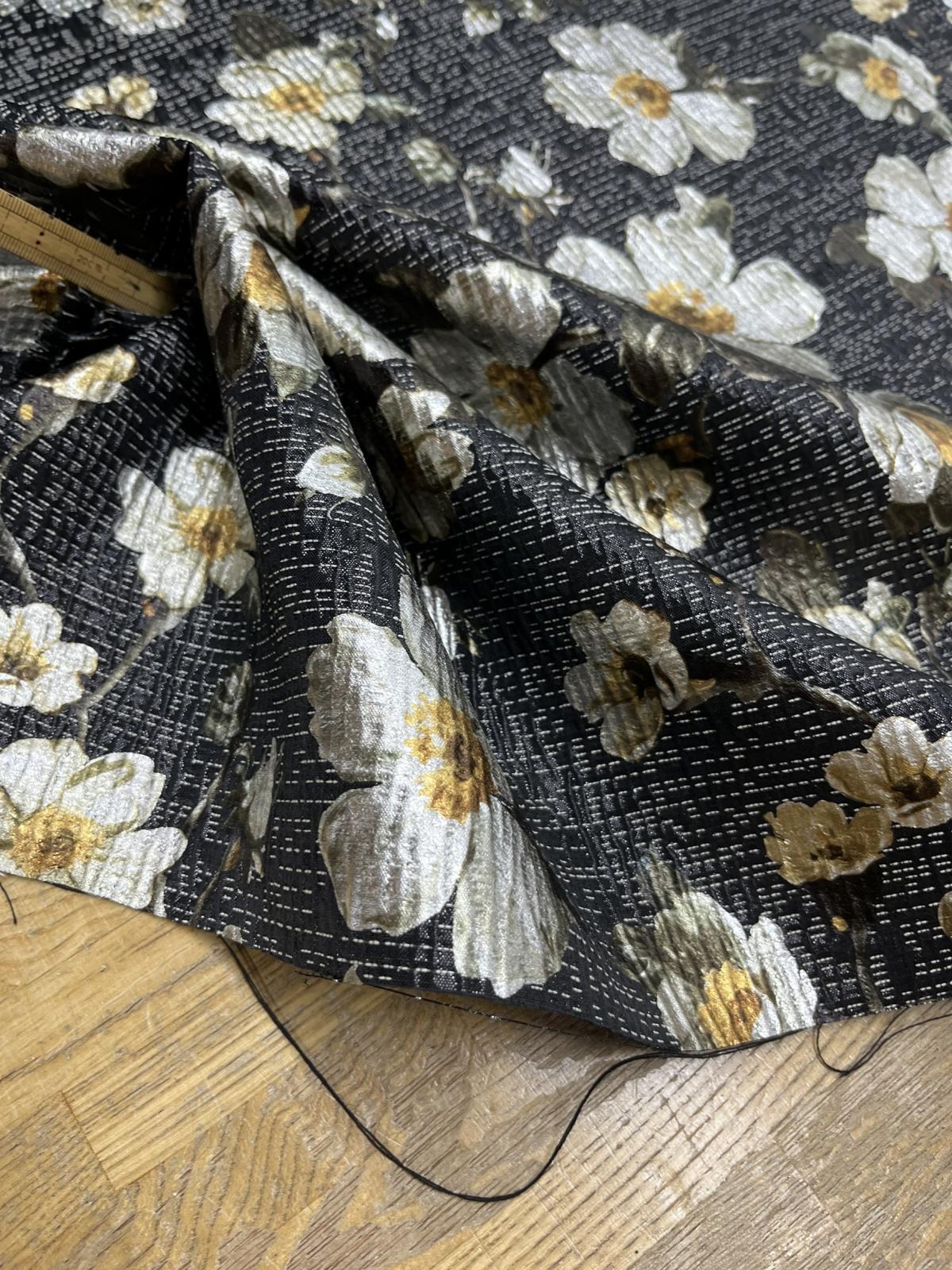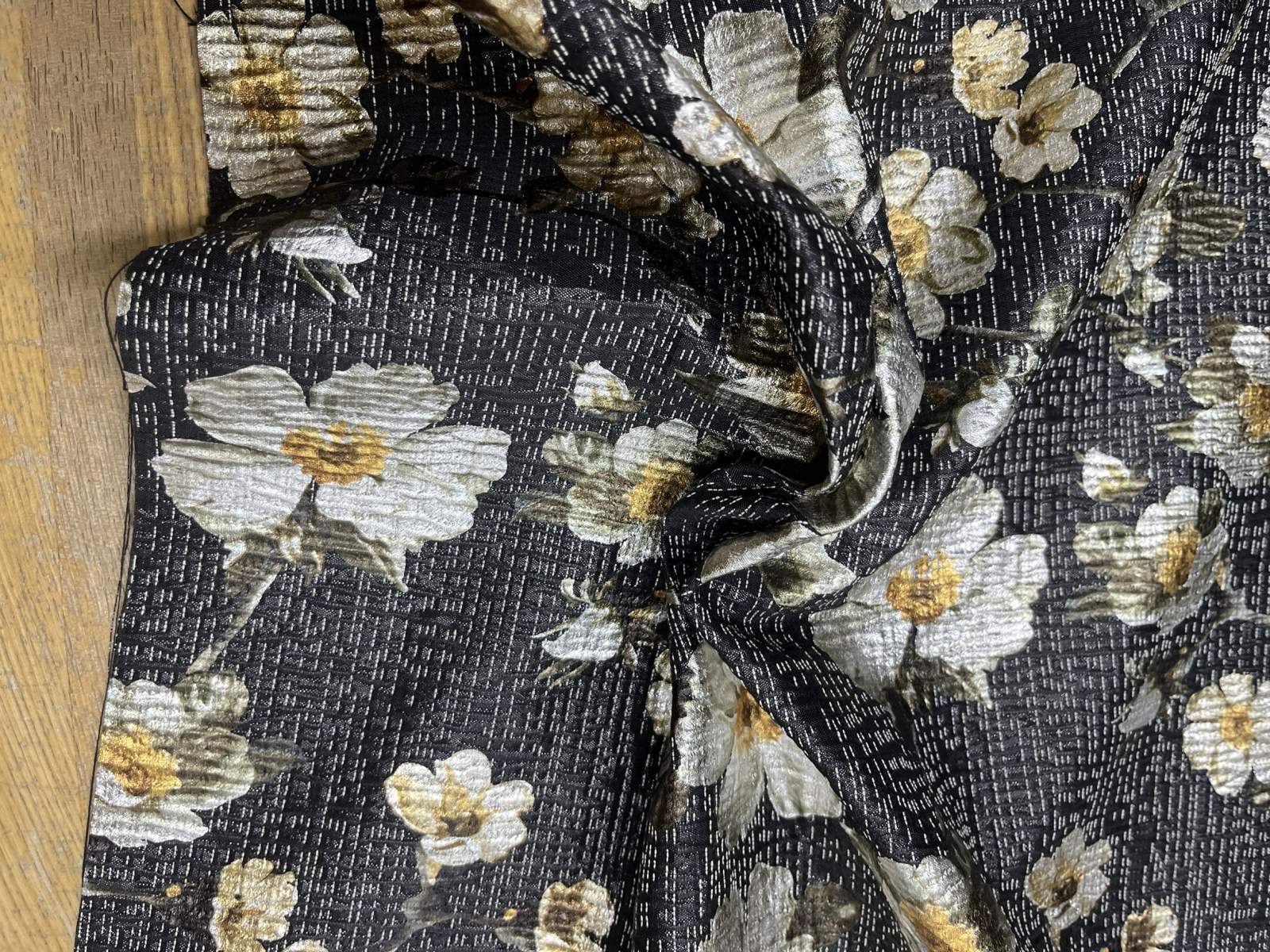 深みのあるマットな黒をベースに、ゴールドラメ糸を織り込んだフローラルジャカード生地。