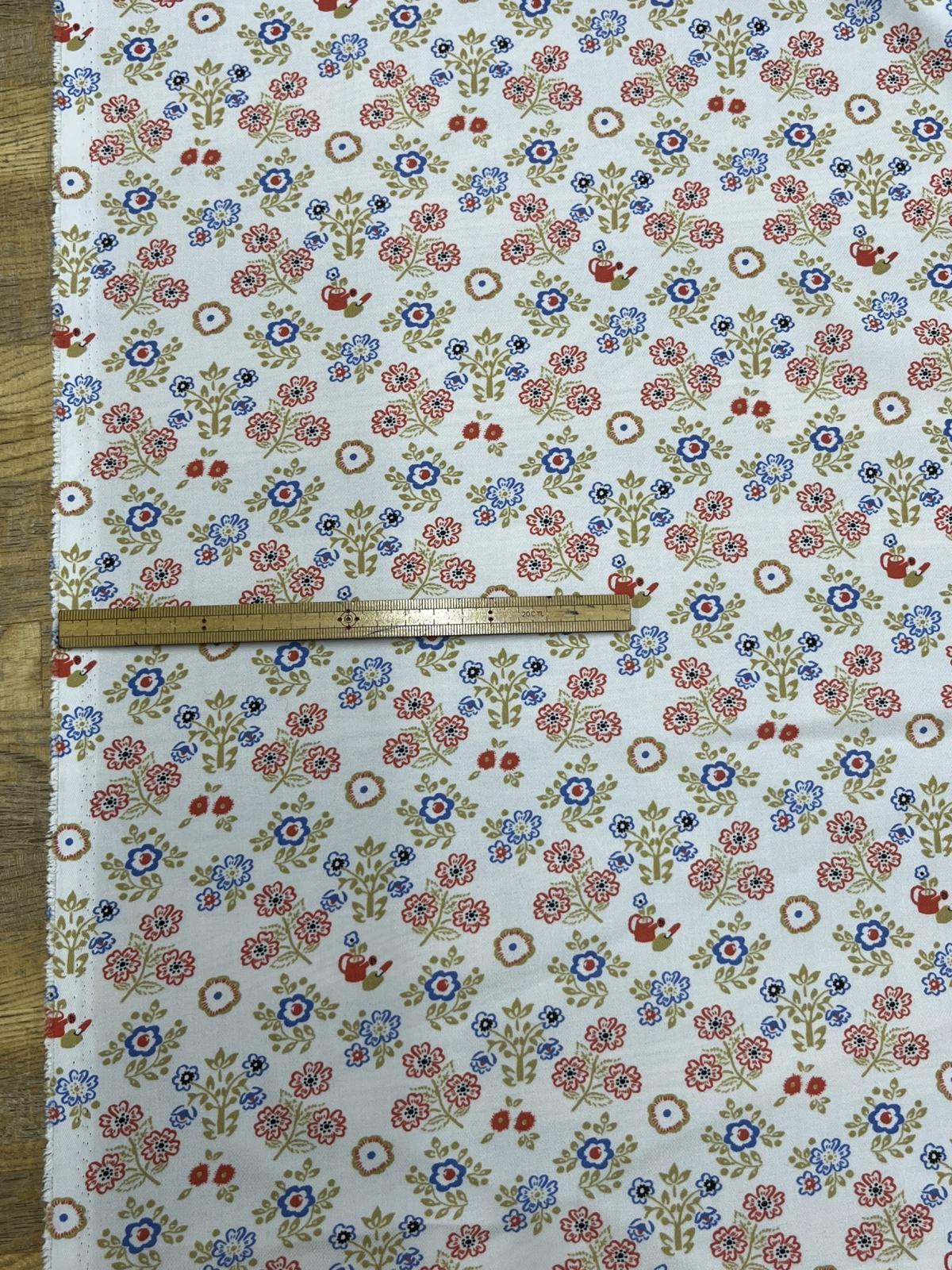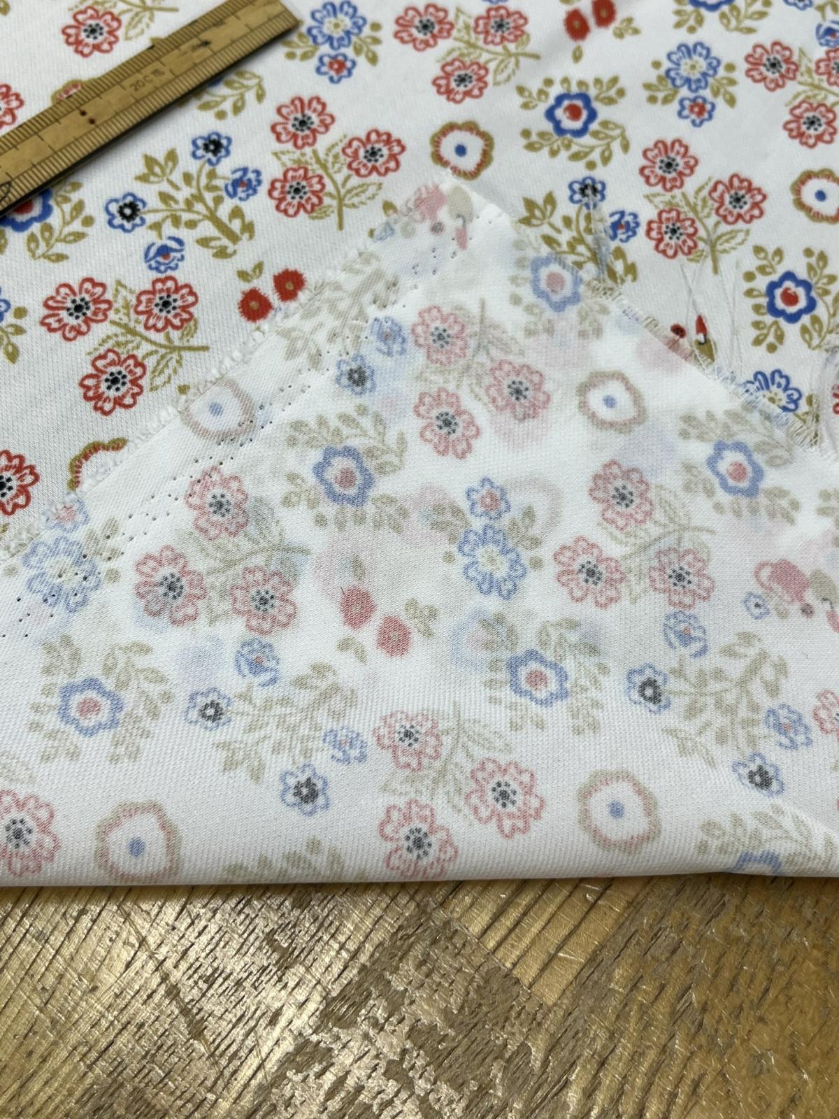 オフホワイトのベースに、赤・青・グリーン・ベージュブラウンを基調としたクラシカルな小花柄プリント。