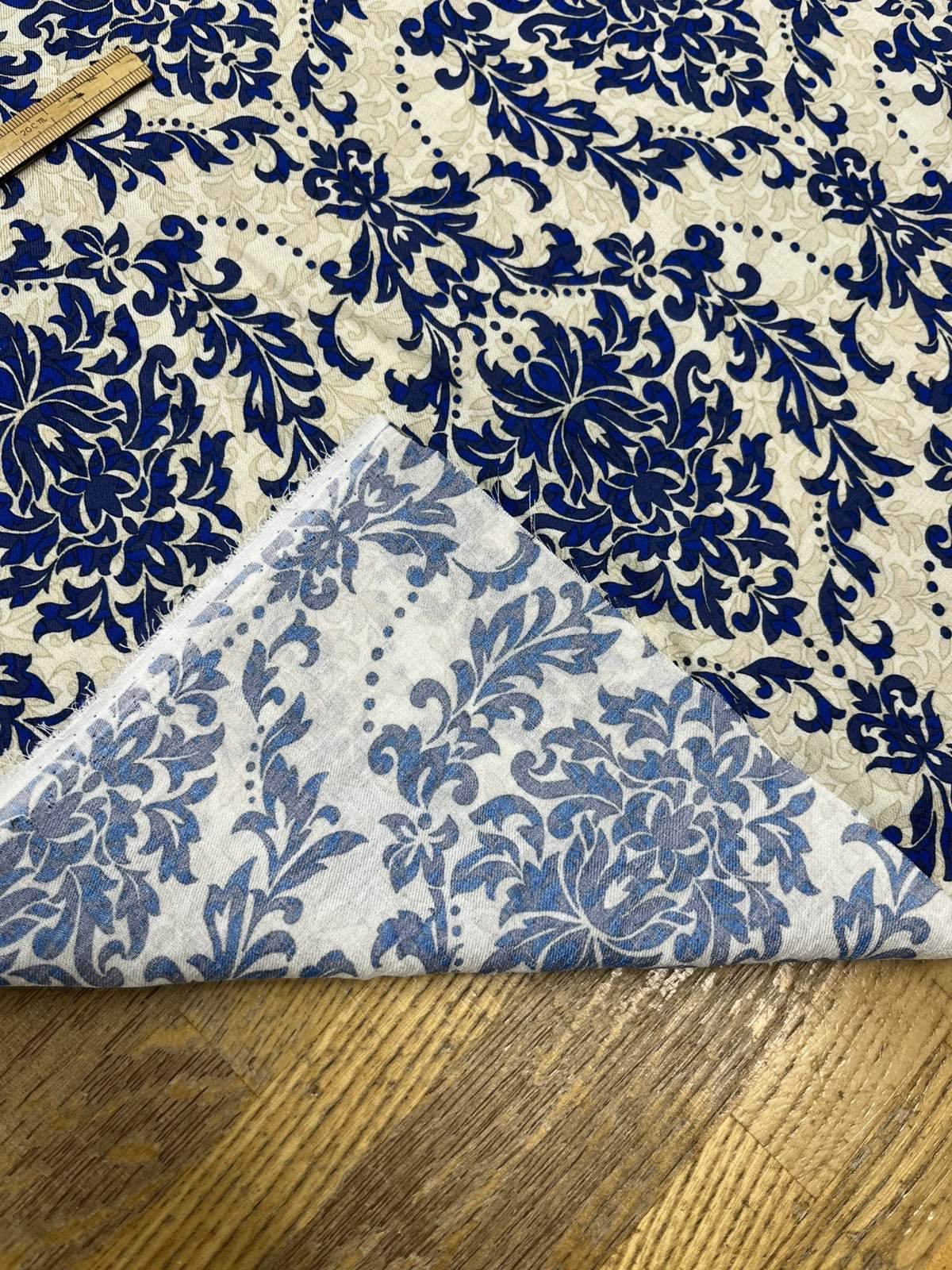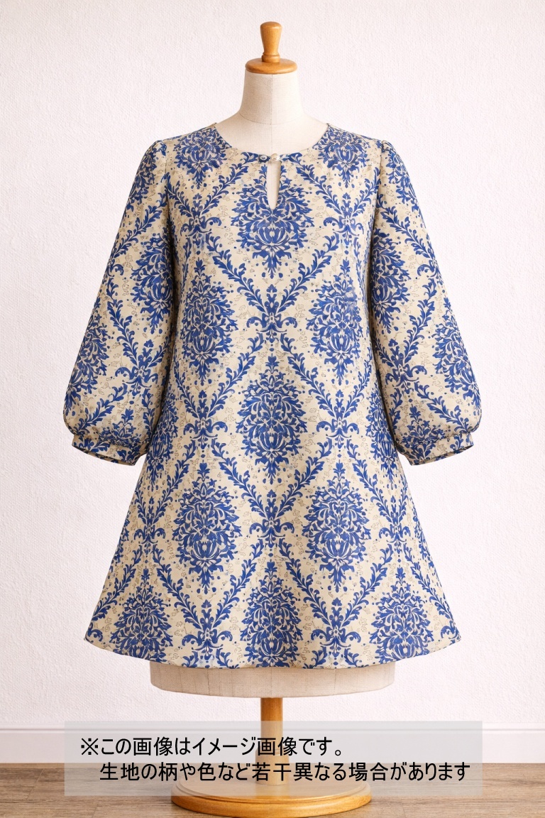 生地:ポリエステル100% ダマスク柄プリント(ベージュ×ブルー)