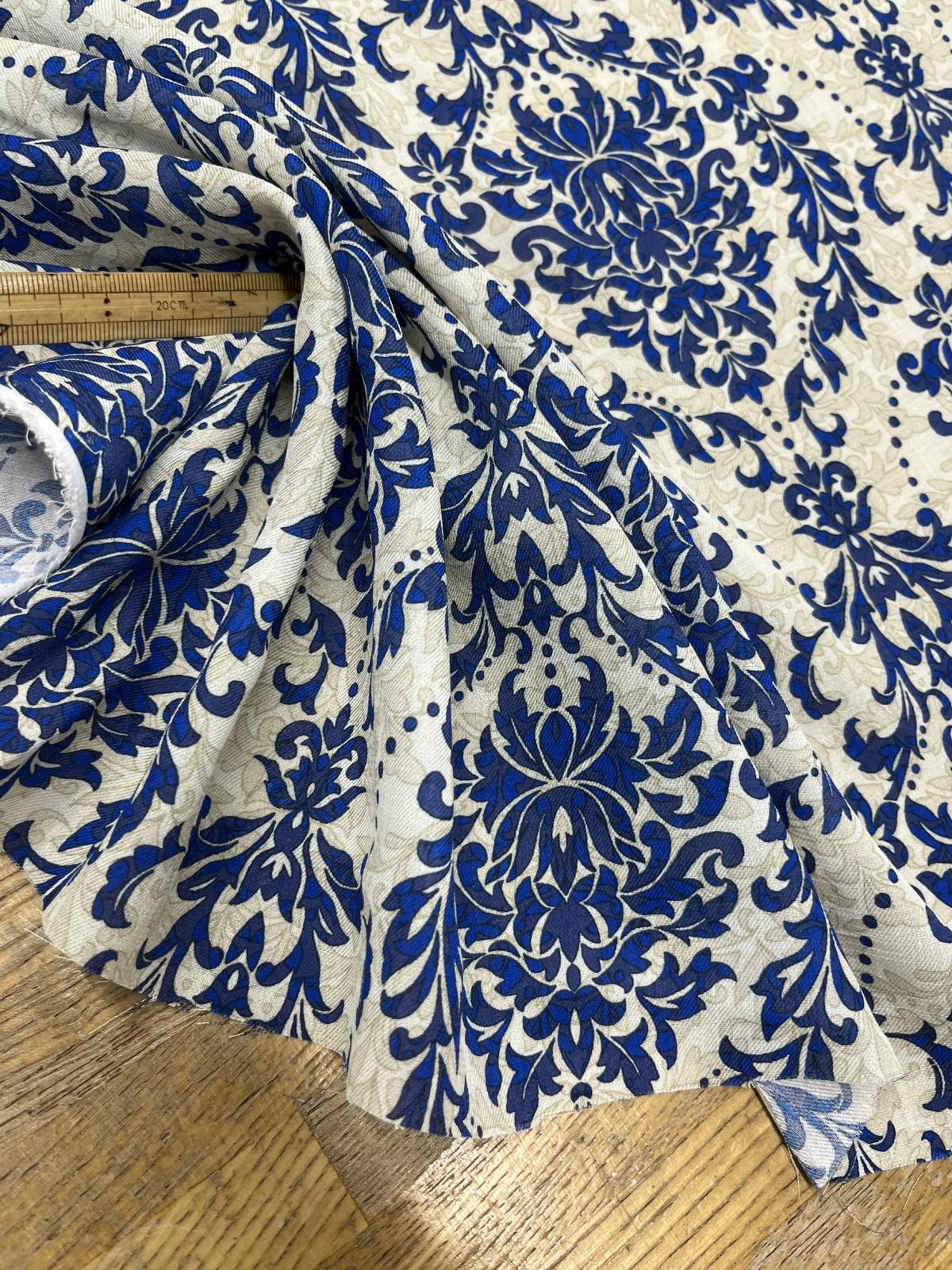 生地:ポリエステル100% ダマスク柄プリント(ベージュ×ブルー) [kiji-3171]