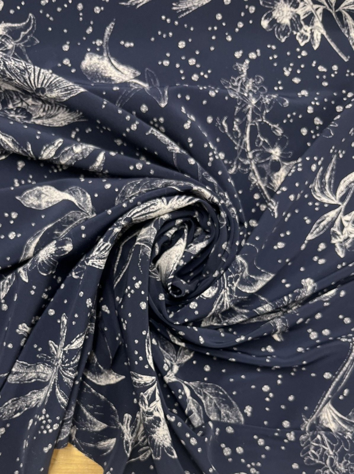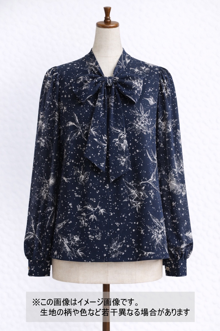 濃紺の地に、繊細な線画タッチの花柄と細かなドット柄が重なり、落ち着きの中に華やかさのある印象に仕上がっています。