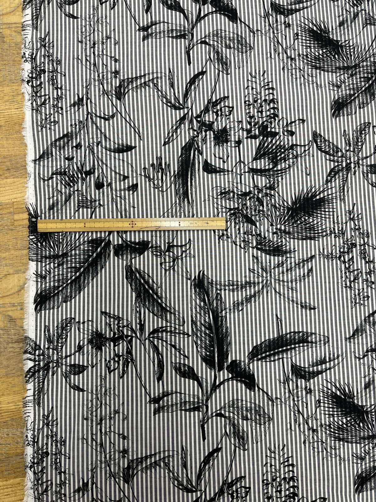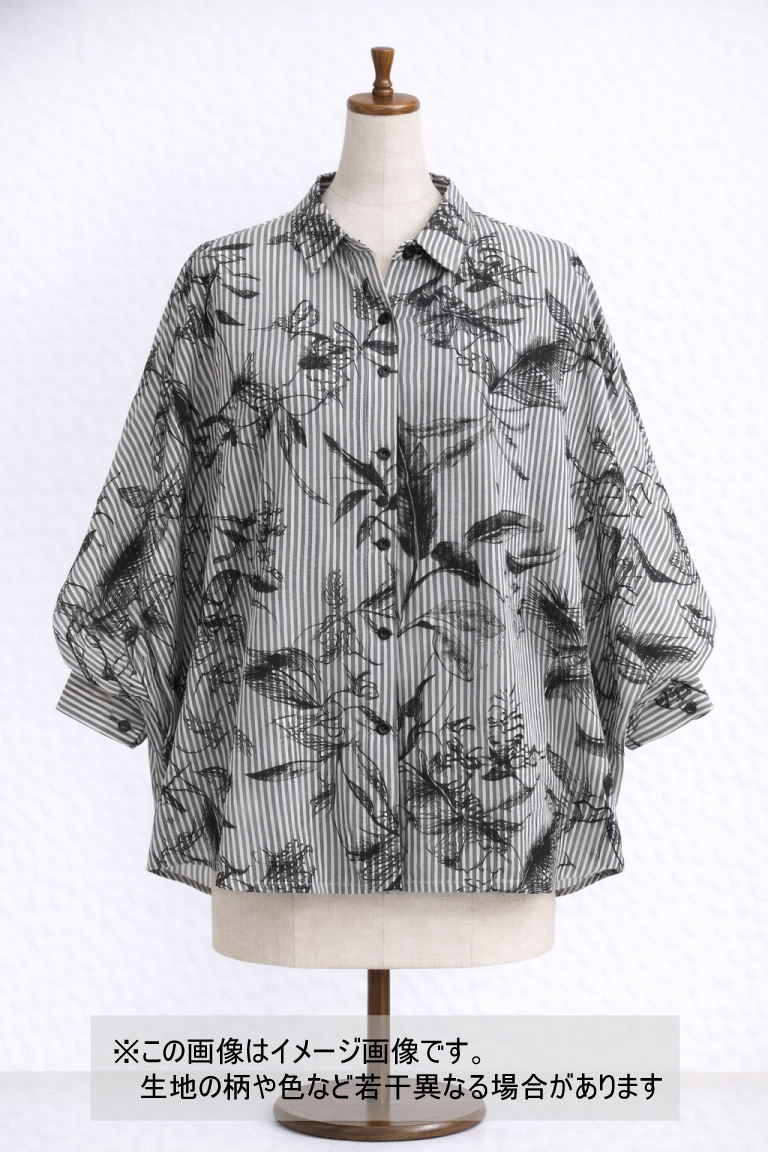 ストライプの規則性と、手描き風の花柄が重なり、甘さを抑えた大人っぽい印象に仕上がっています。