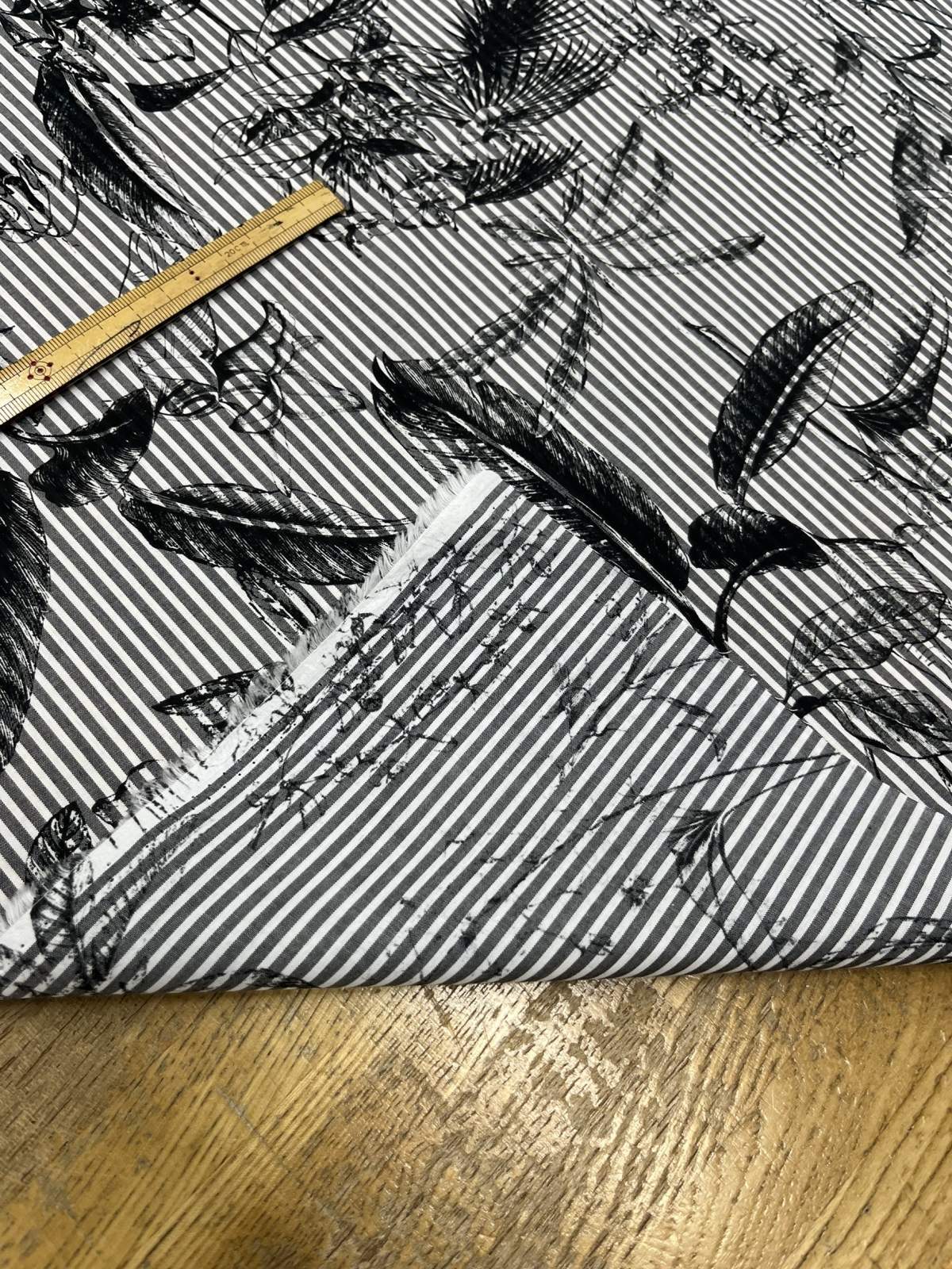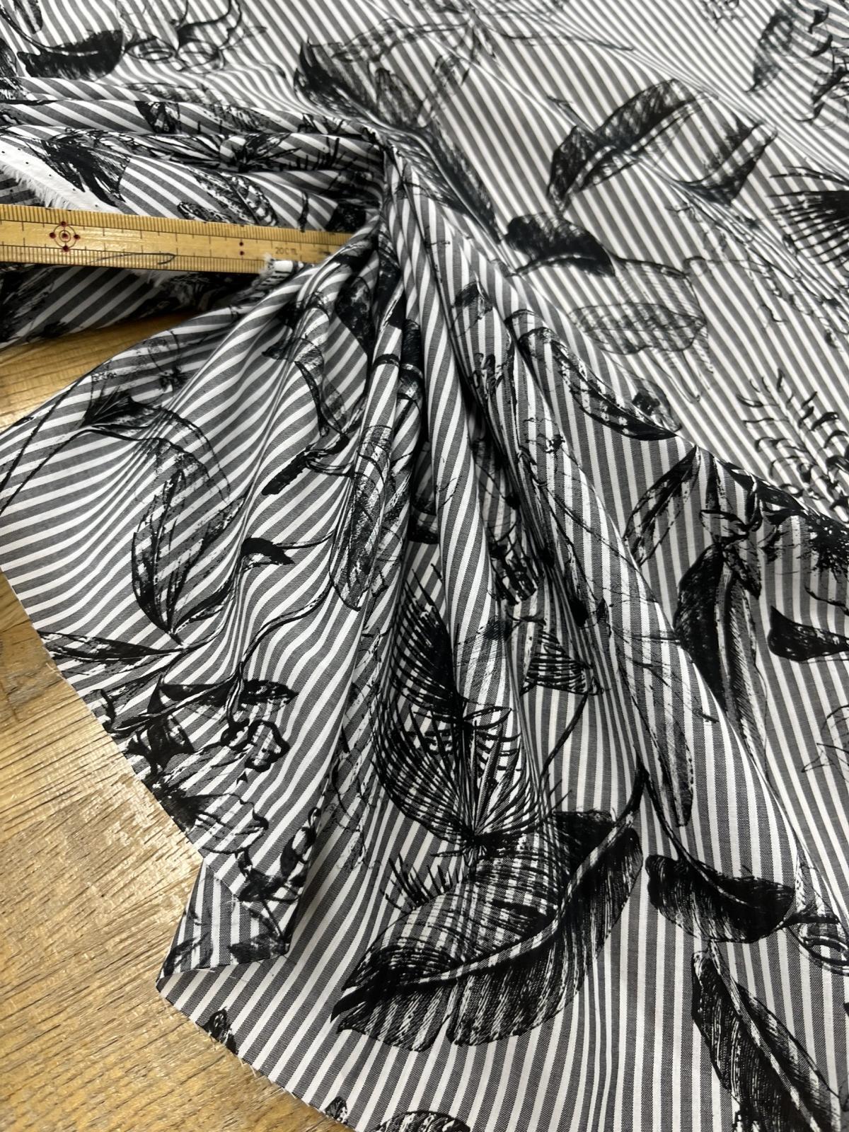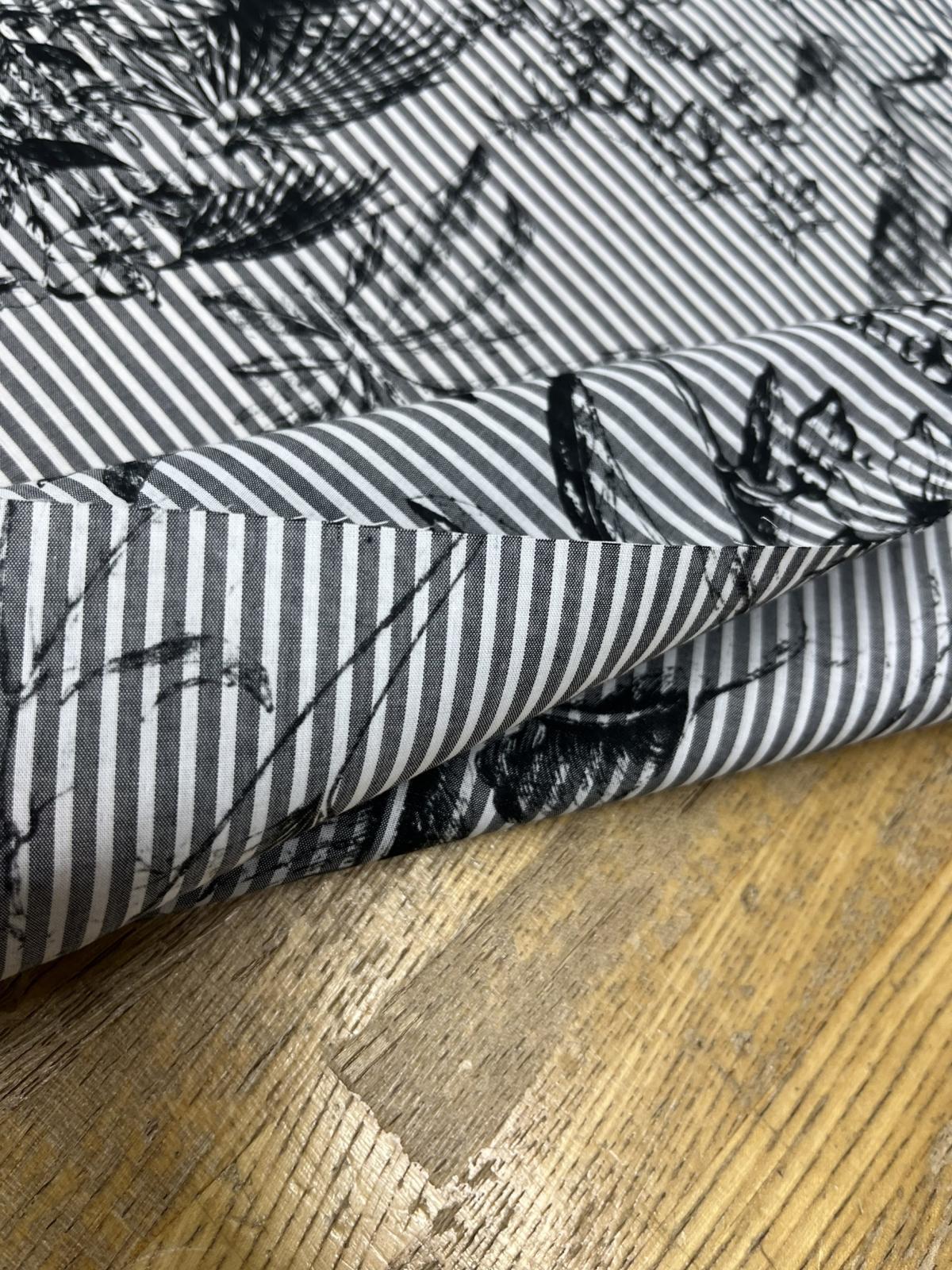 先染めストライプの上に、繊細な花柄プリントを重ねた、表情のあるコットンローンです。