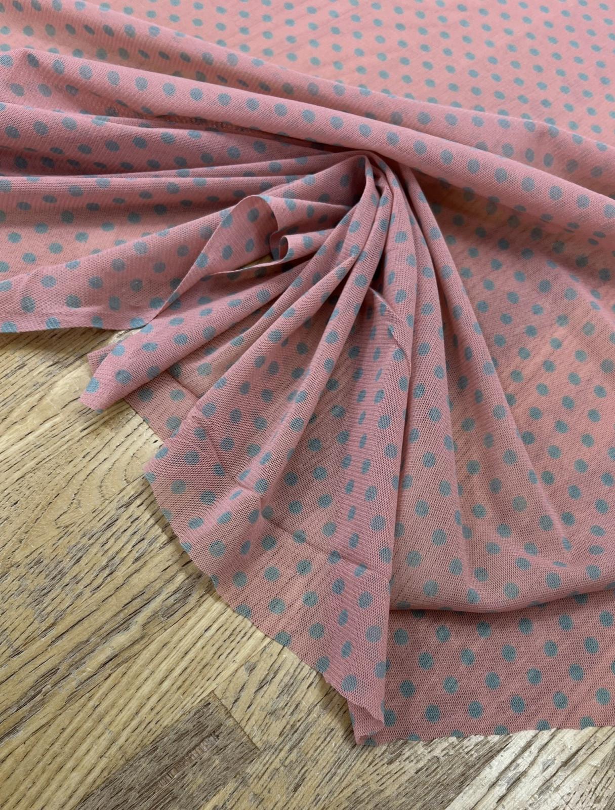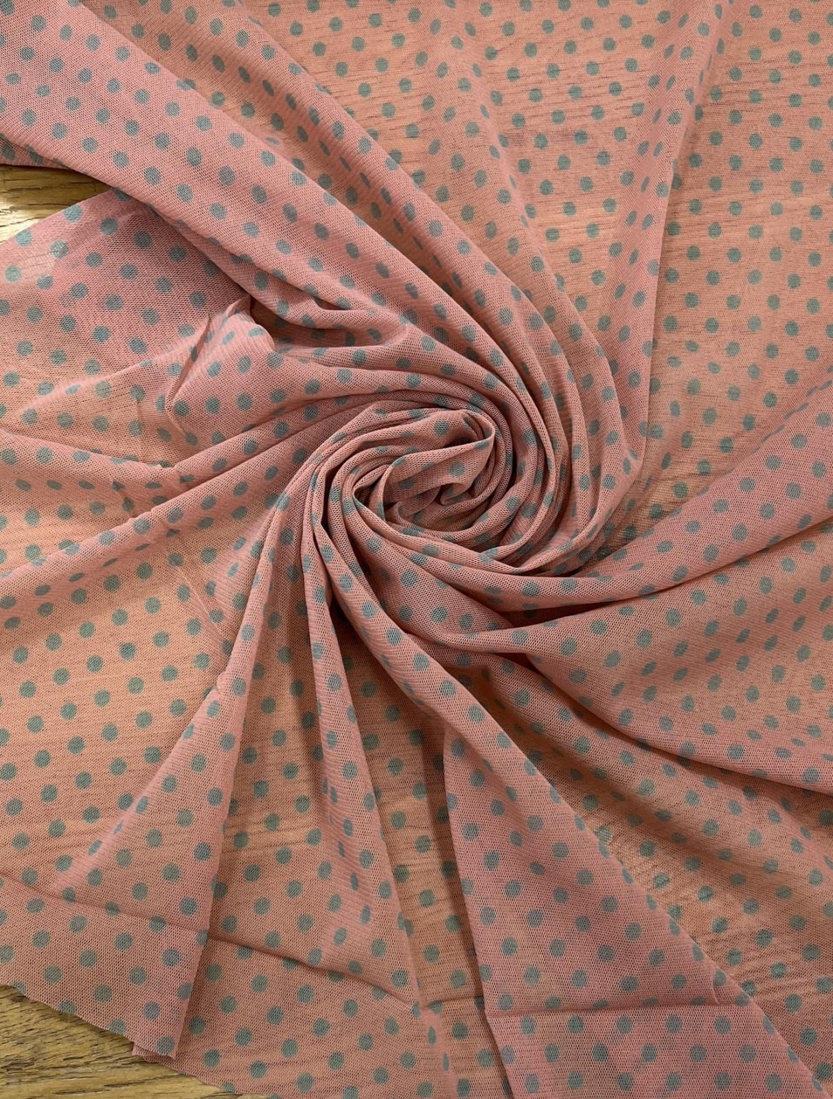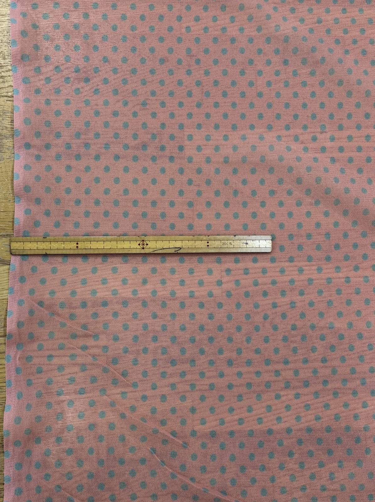 生地:ポリエステル 水玉プリントチュール(ピンク×水色)
