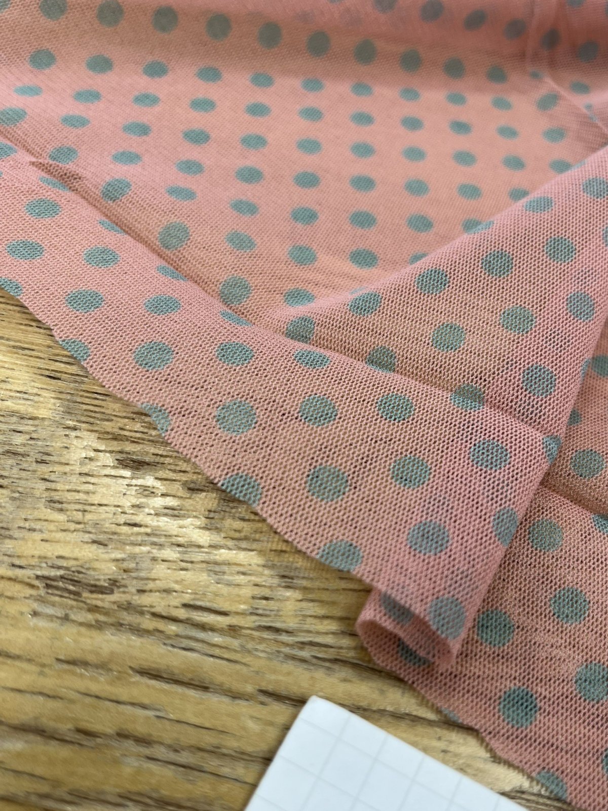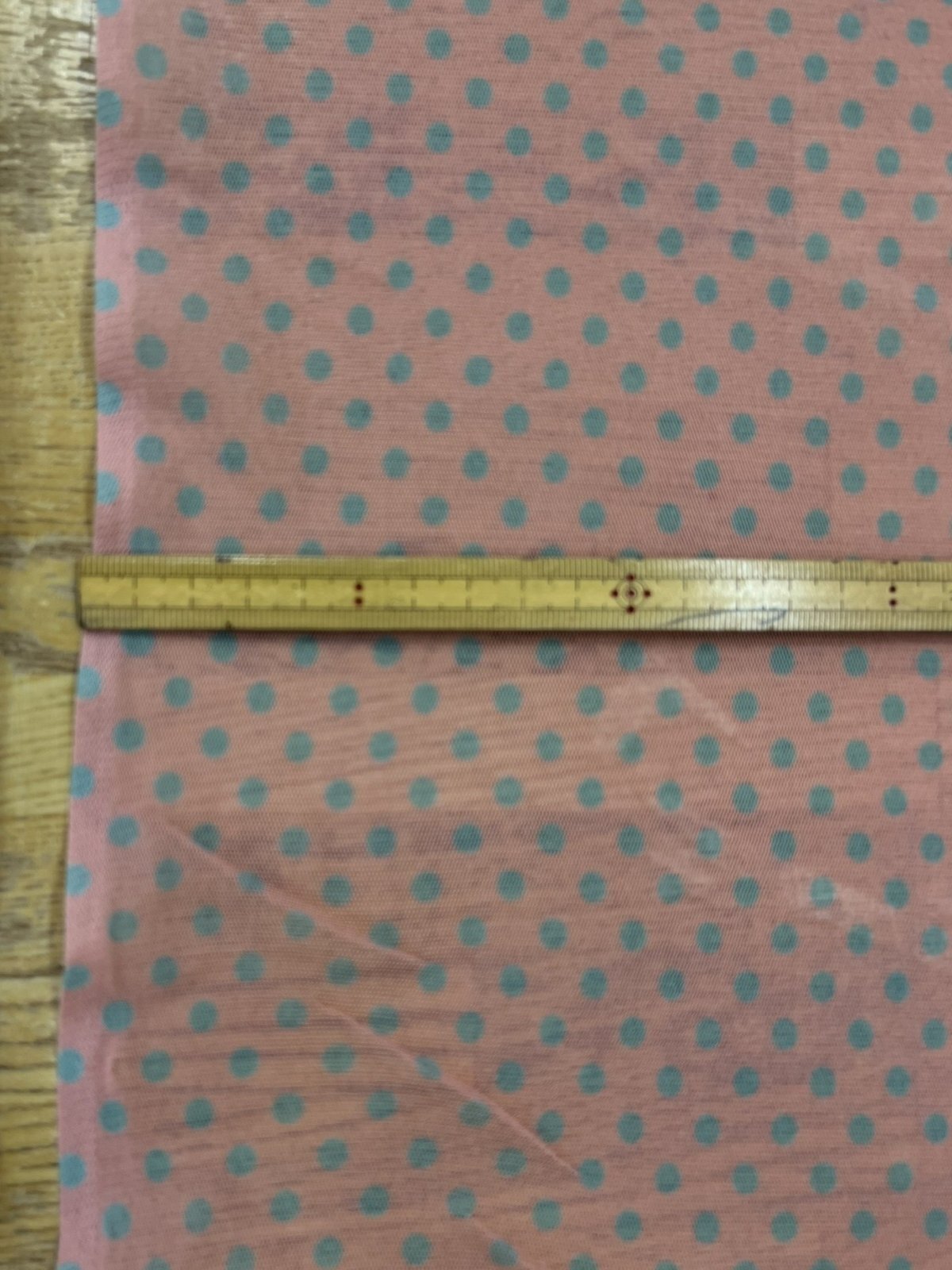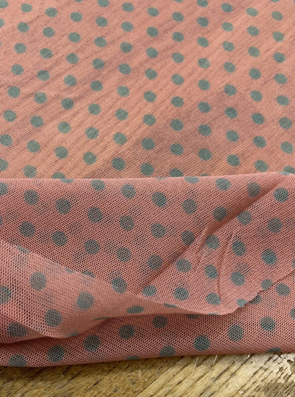 生地:ポリエステル 水玉プリントチュール(ピンク×水色)