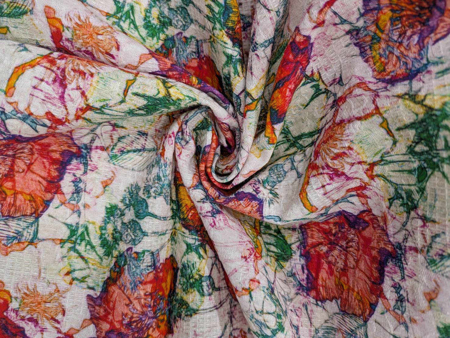 ジャガード織りに繊細なフラワーモチーフをプリントした、表情豊かな綿100%素材です。
