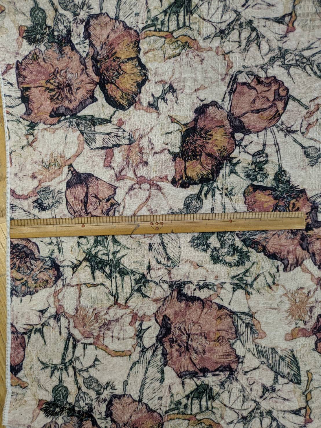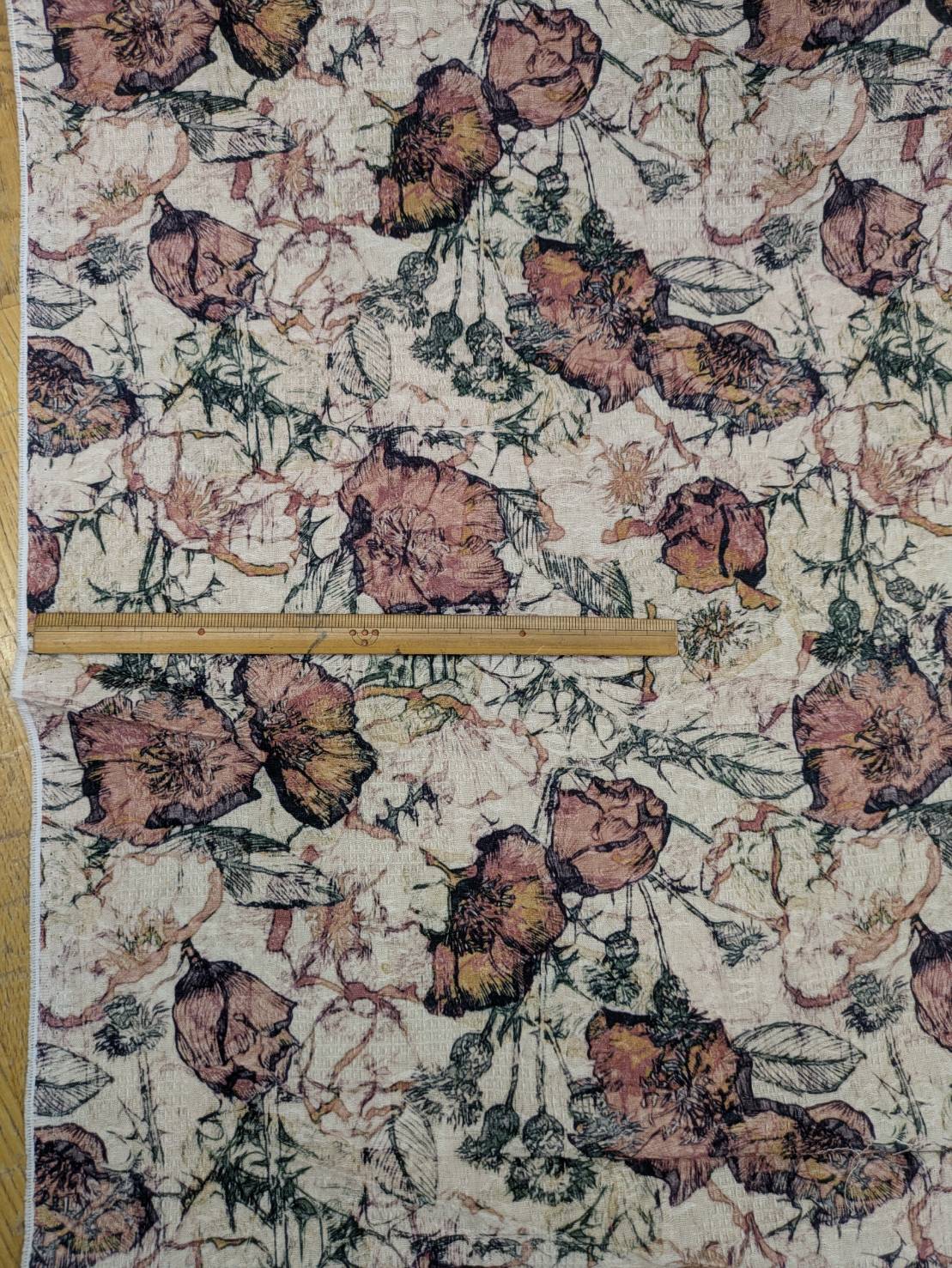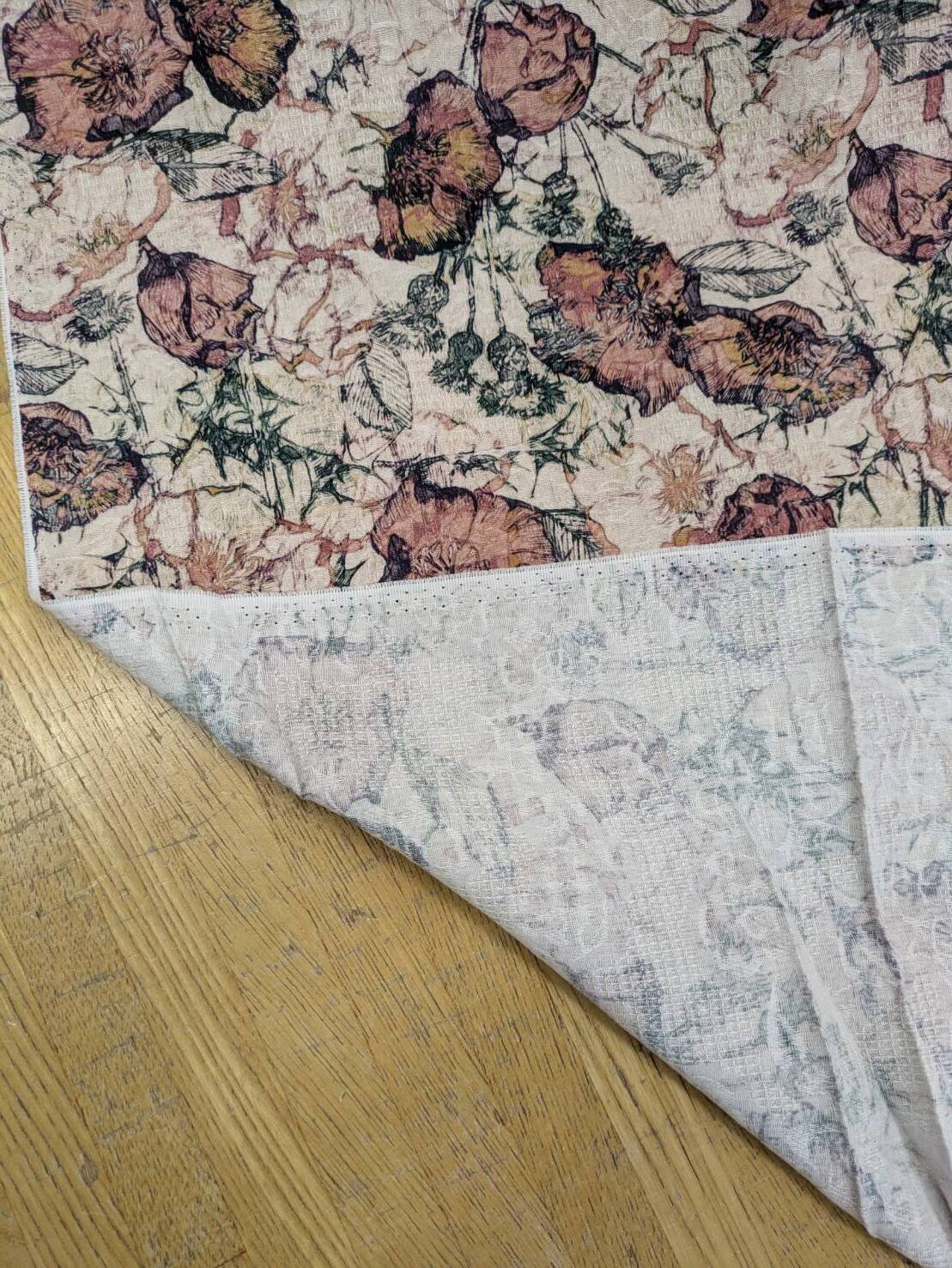 ジャガード織りに繊細なフラワーモチーフをプリントした、表情豊かな綿100%素材です。