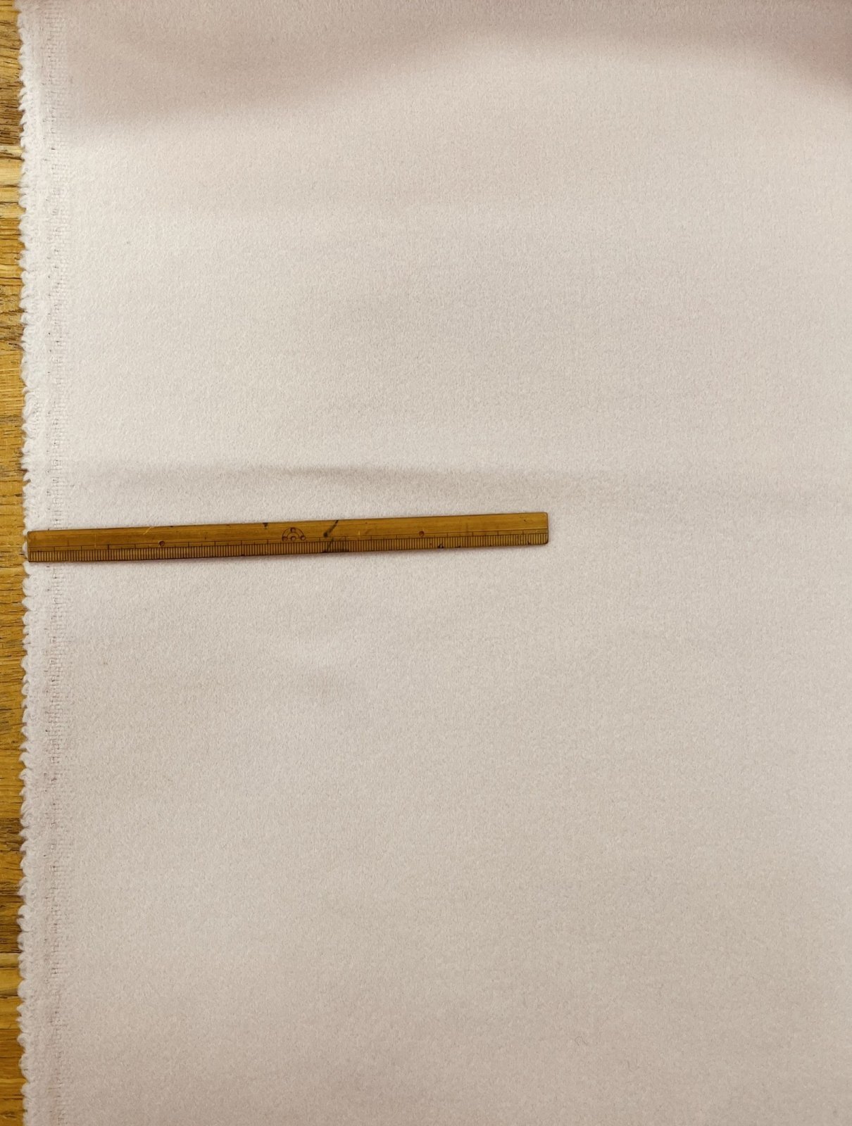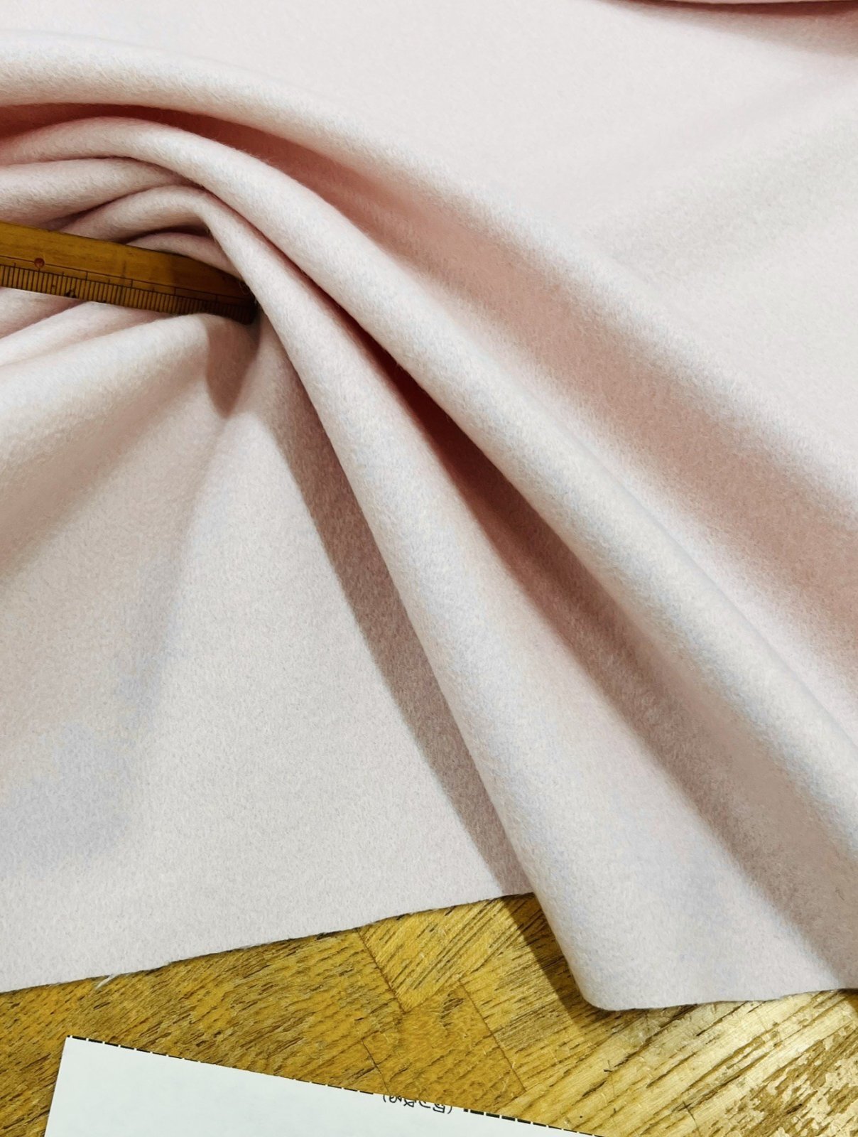 ウール混ならではのやさしい起毛感と、淡く上品なライトピンクが印象的な素材です。