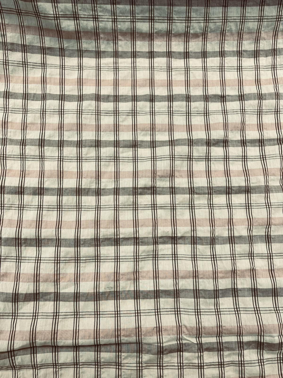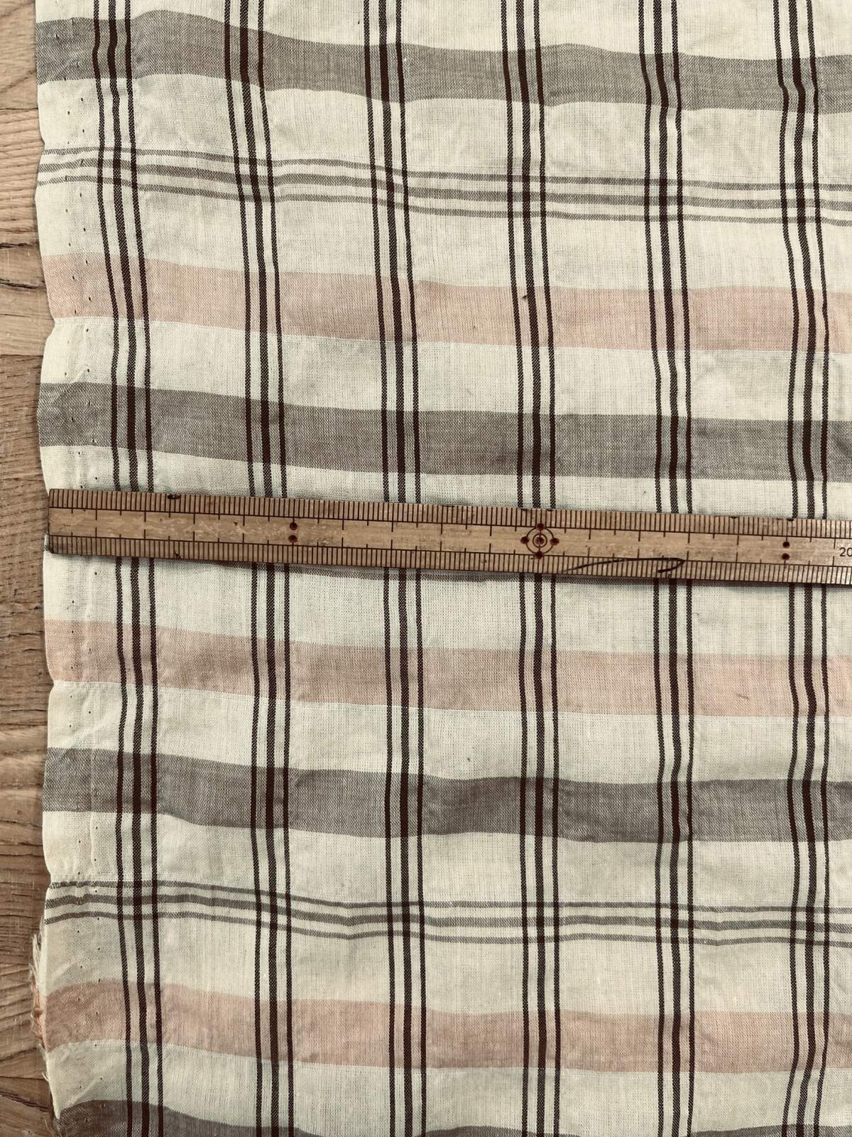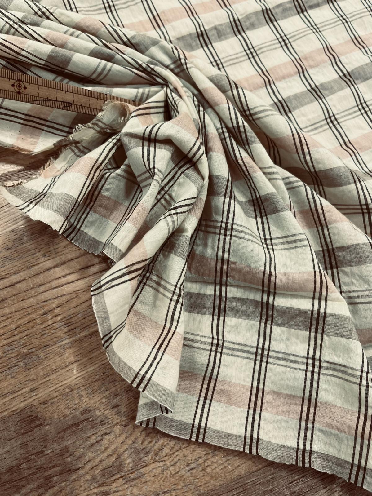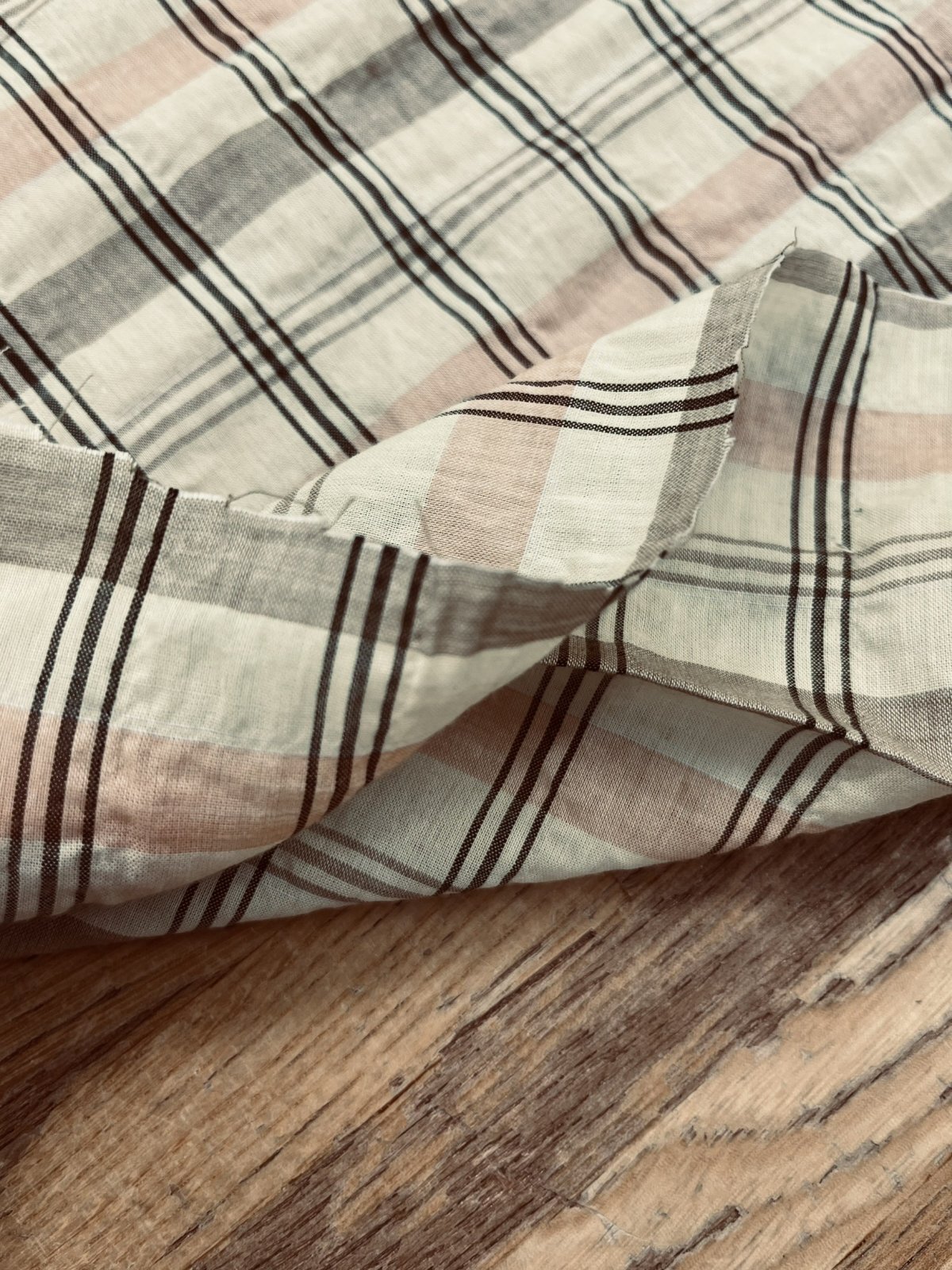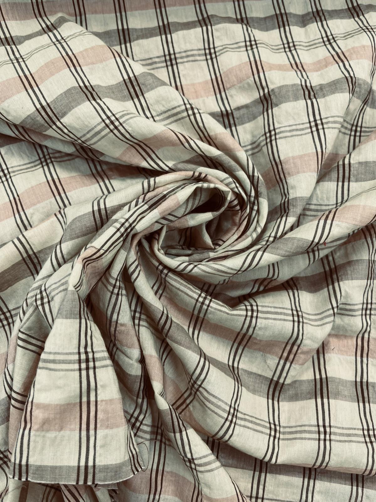 ブラウンやグレージュ、淡いピンクベージュのラインが重なり合い、ナチュラルで上品なチェック柄に仕上がっています。