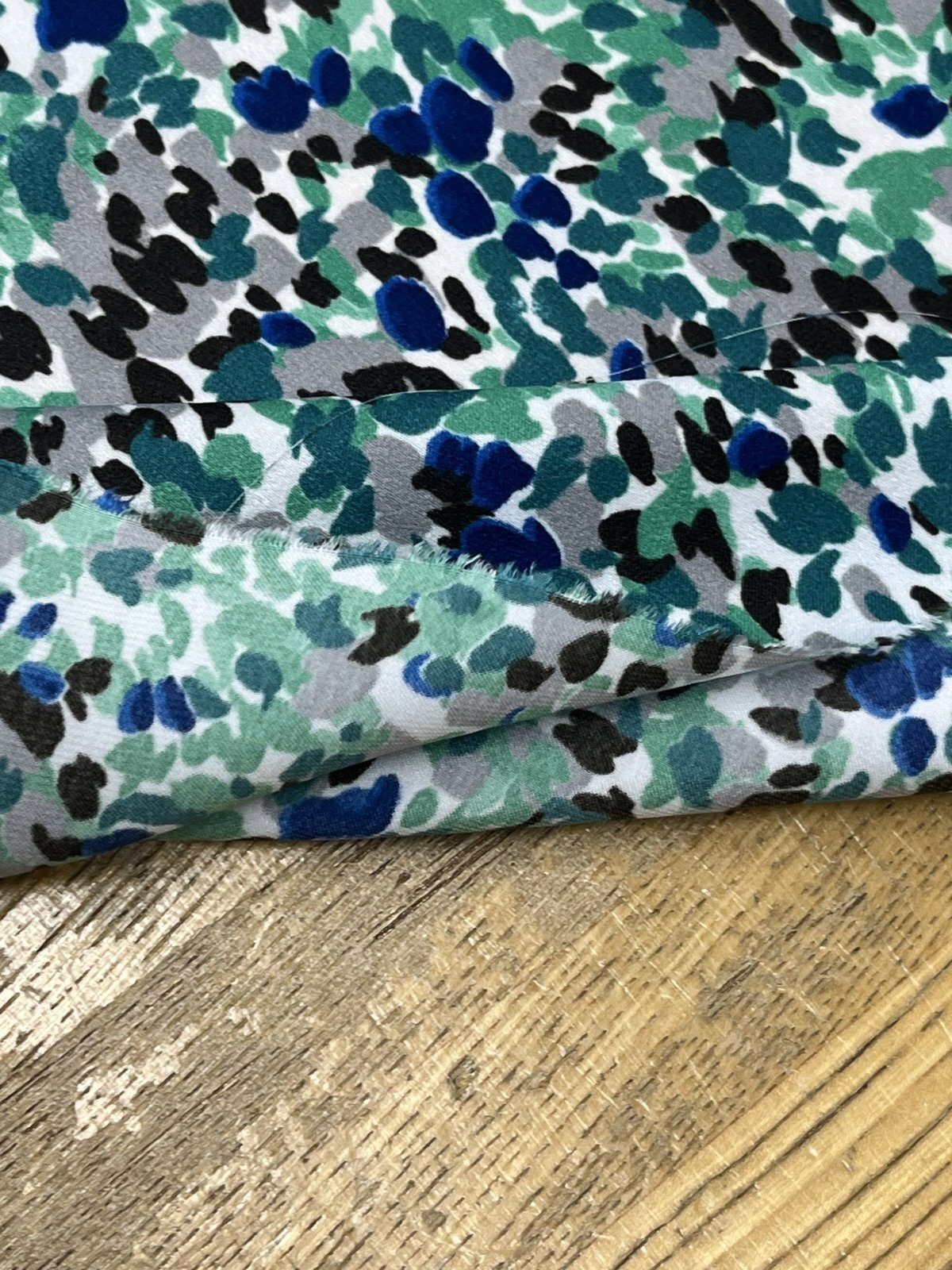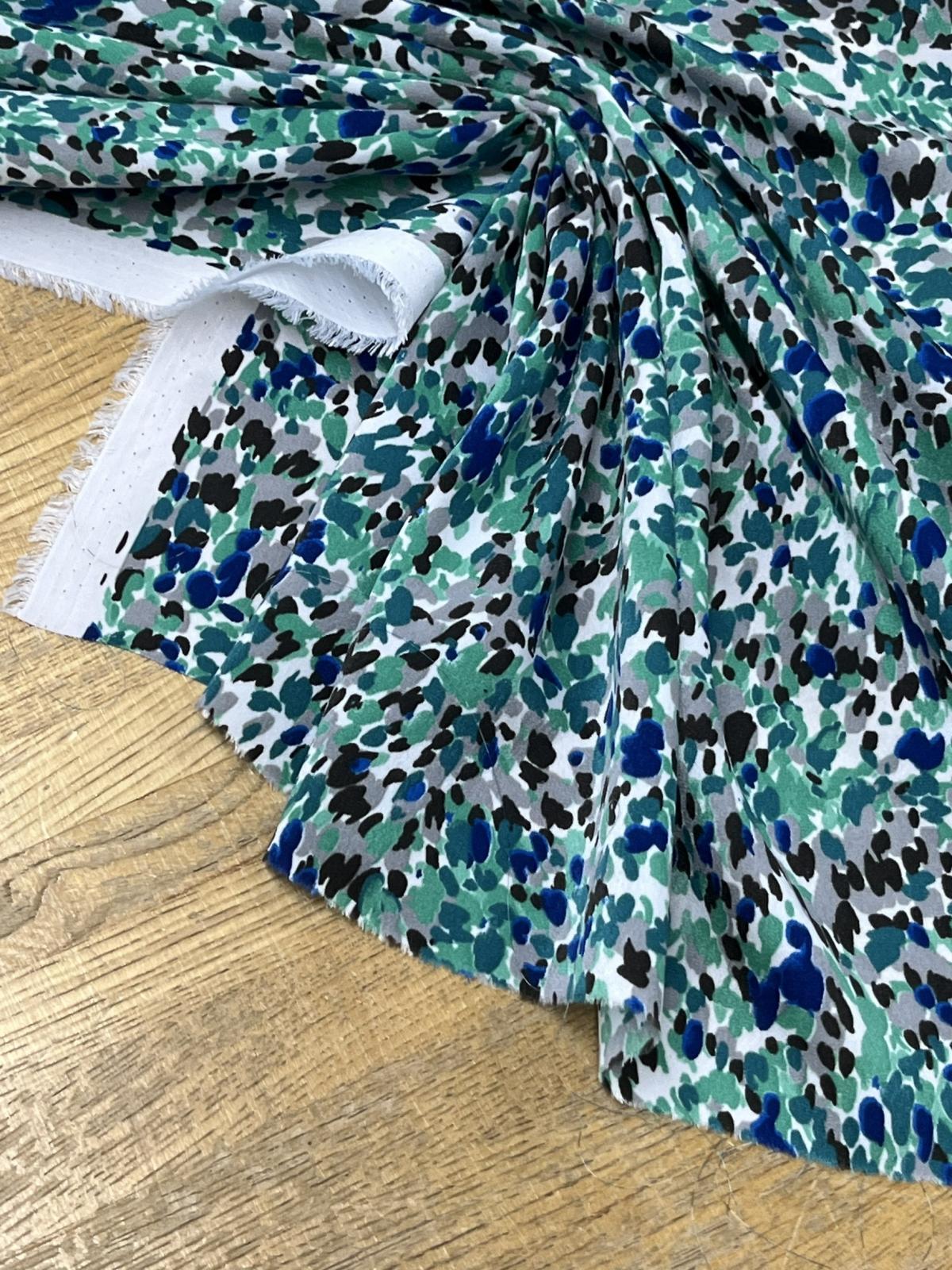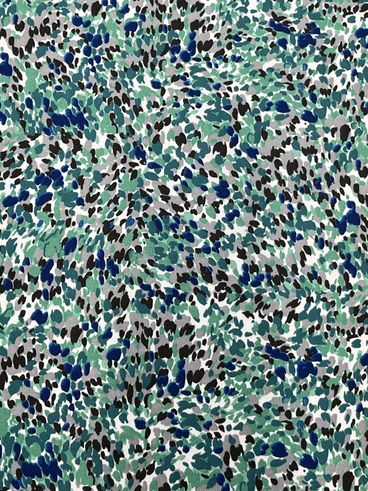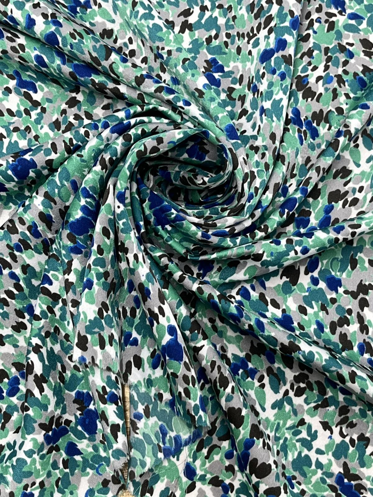 パウダー調のまろやかなタッチで、ソフトな着心地。発色性にも優れ、グリーン・ブルー・ブラック・グレーが重なり合う抽象柄を鮮やかに表現しています。