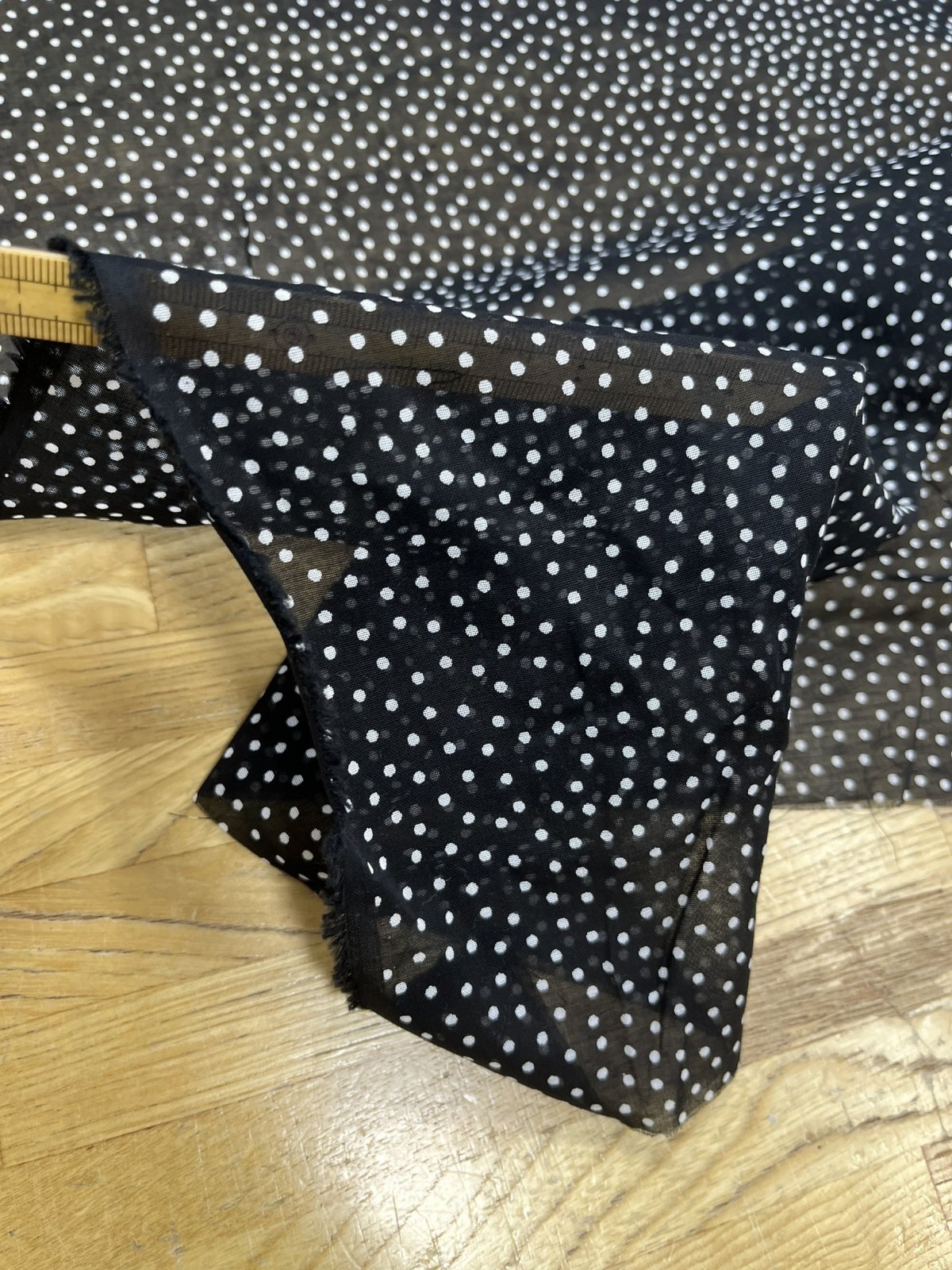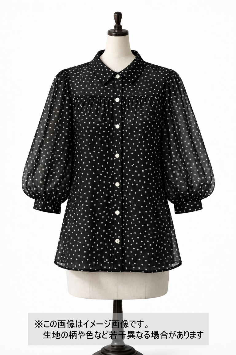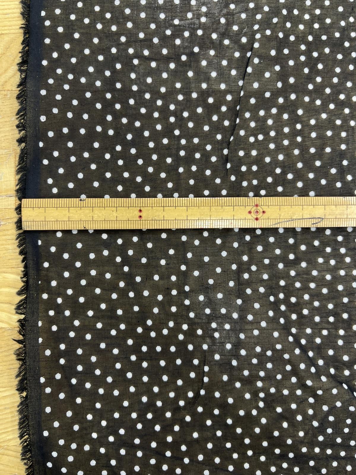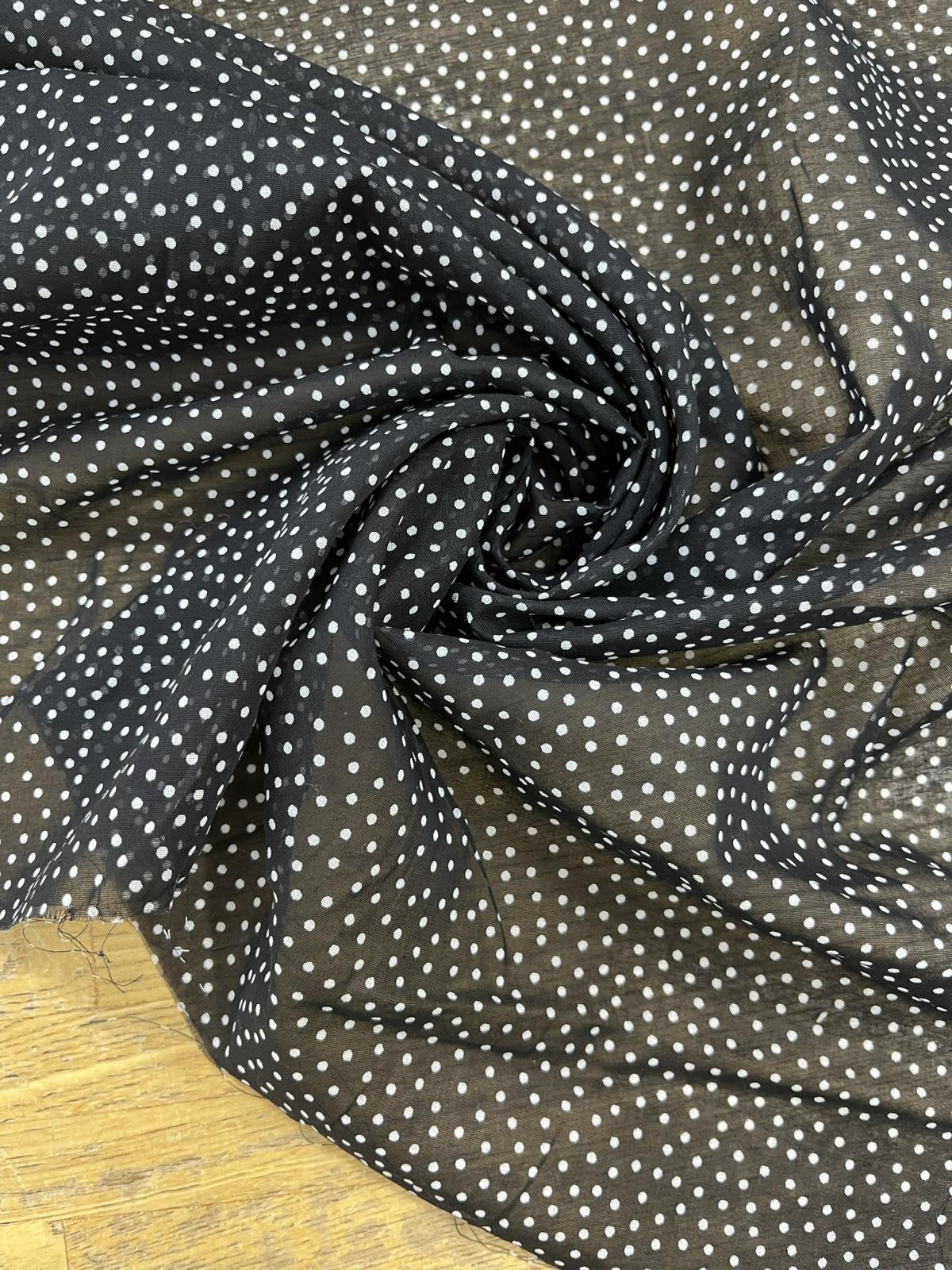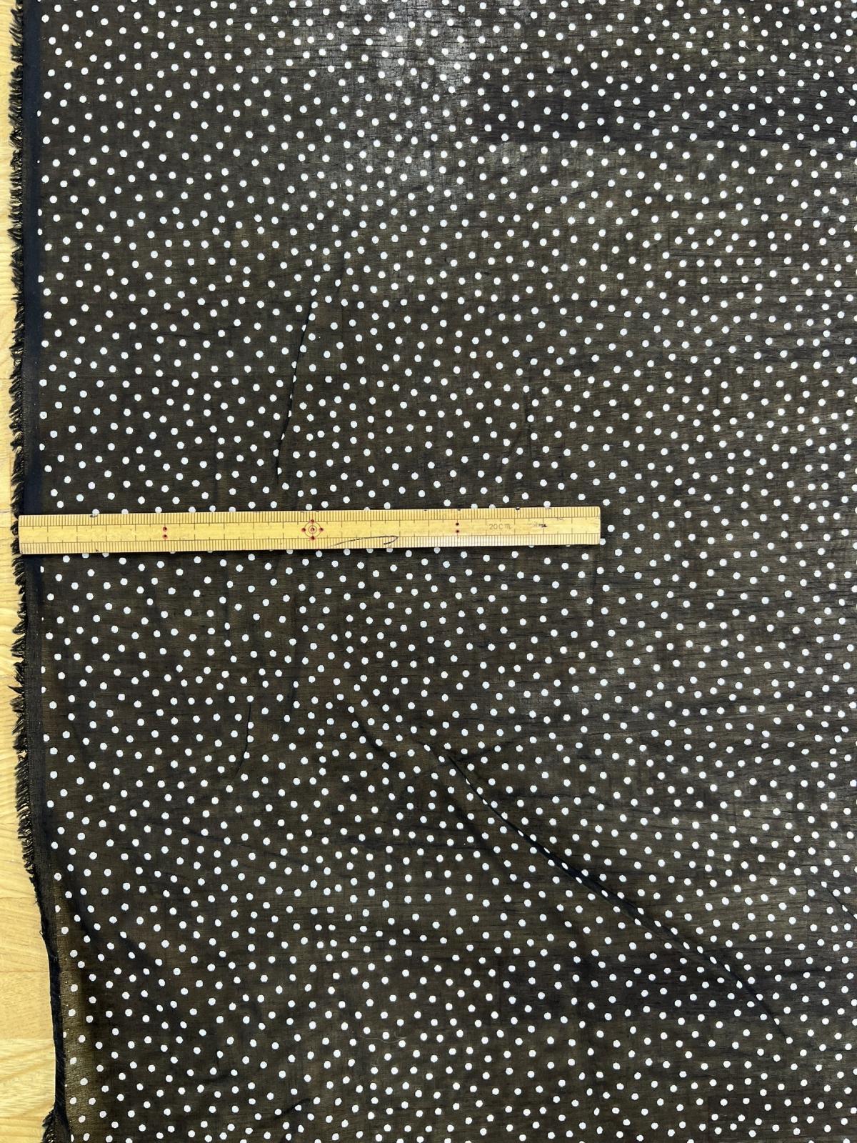 綿100%のランダムドット柄シアー素材。ブラック地にホワイトの小さなドットが散りばめられたデザインで、