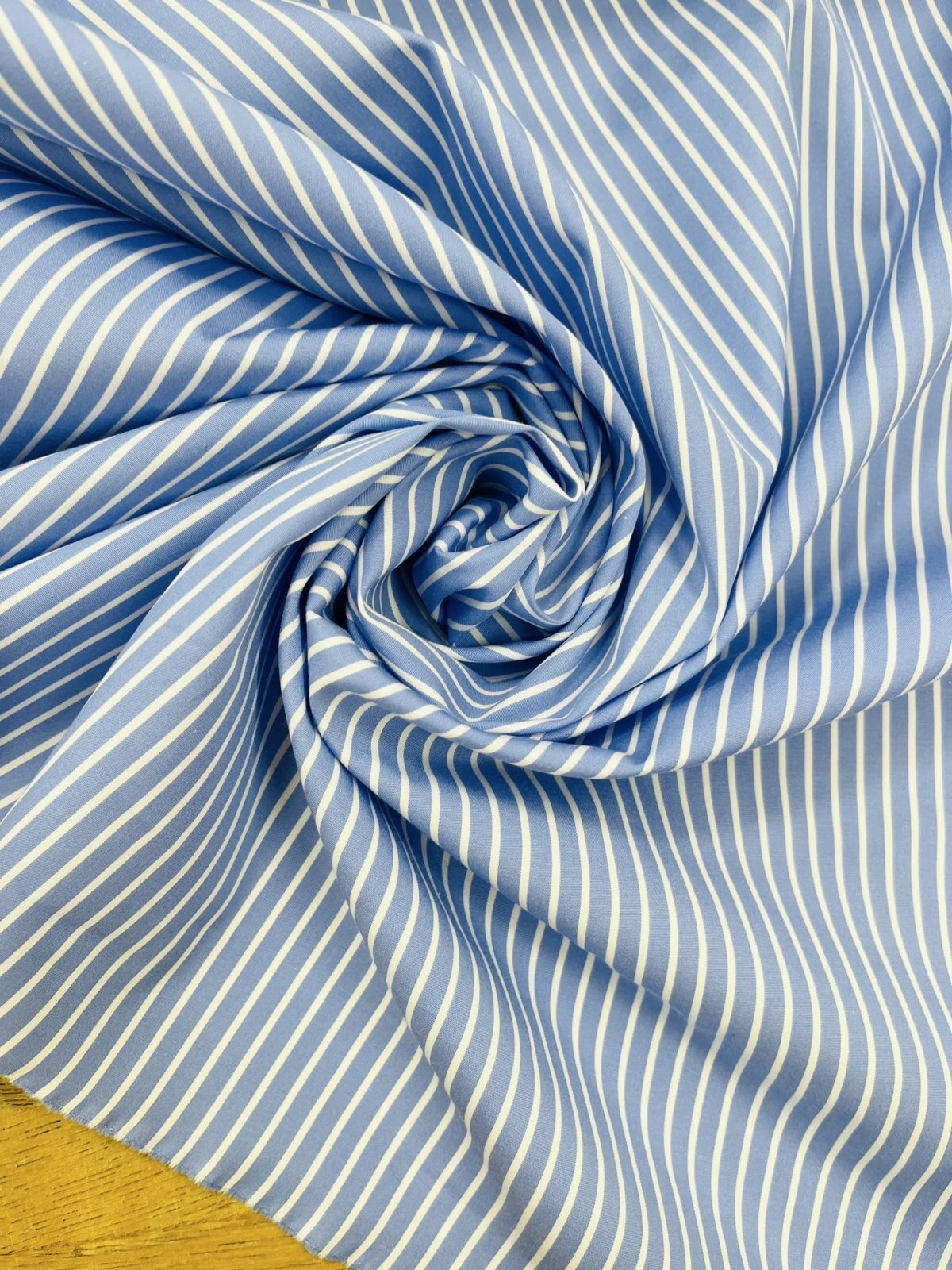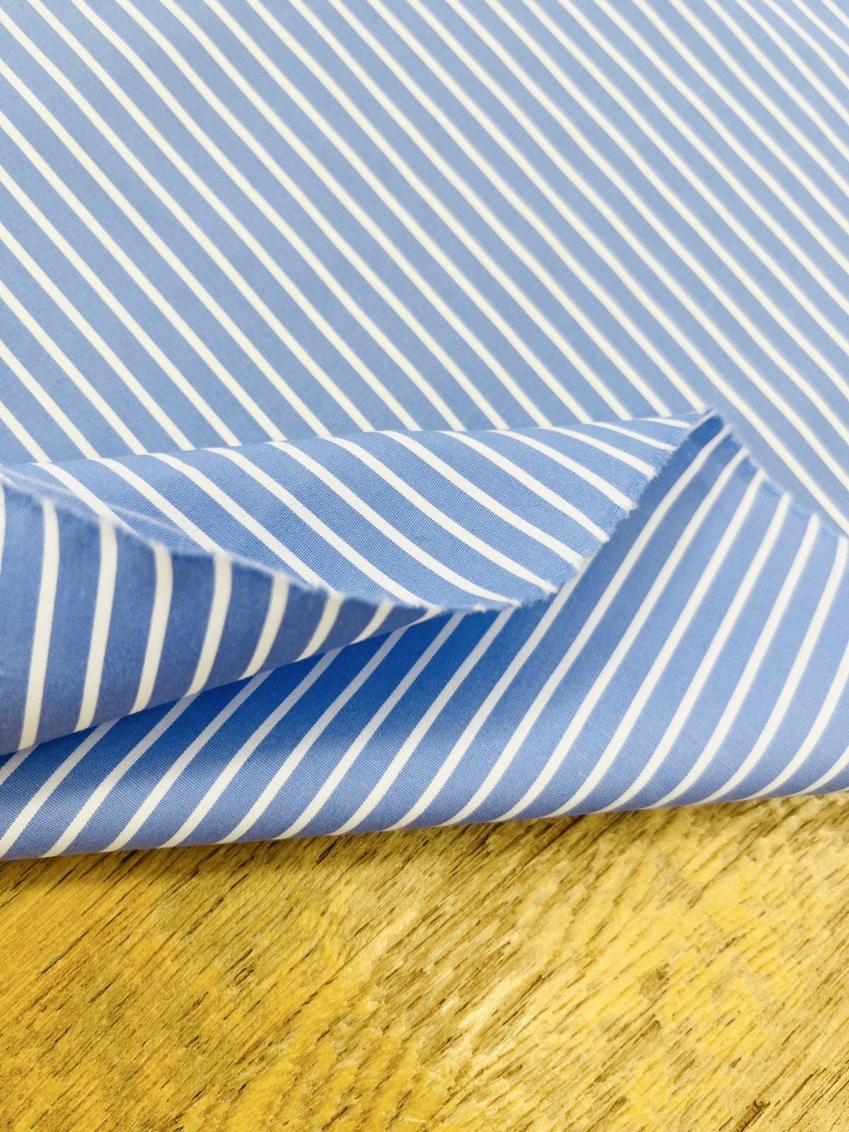 爽やかなブルーに細めのホワイトストライプが入った、清潔感のある先染めコットン素材です。