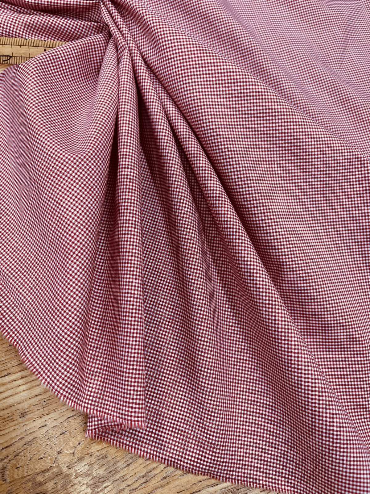 白地に赤の極小ギンガムチェックをあしらった、細やかで上品な印象のコットン素材。