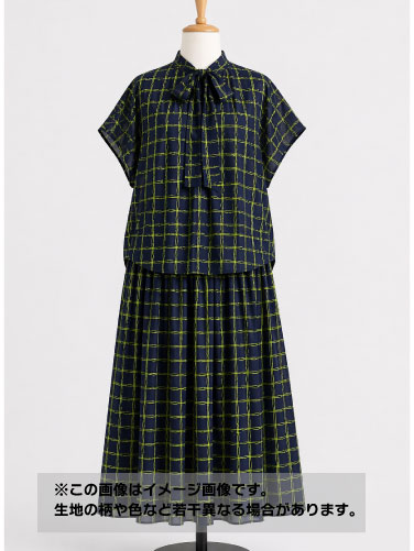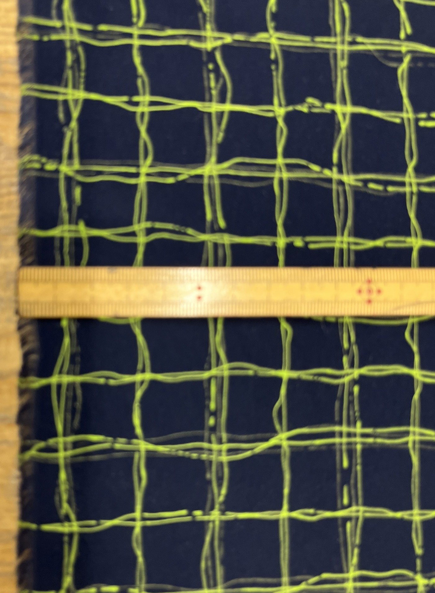 生地:ポリエステル100%手描き風格子プリント デシン(ネイビー×蛍光グリーン)