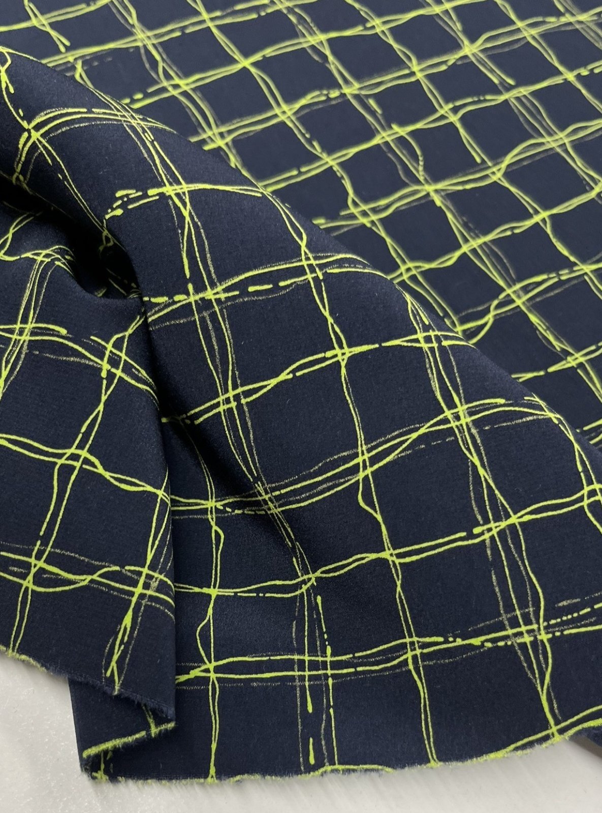 生地:ポリエステル100%手描き風格子プリント デシン(ネイビー×蛍光グリーン) [kiji-3286]