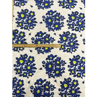 白地に鮮やかな青い花がデザインされた、華やかで爽やかな印象のプリント生地です。
