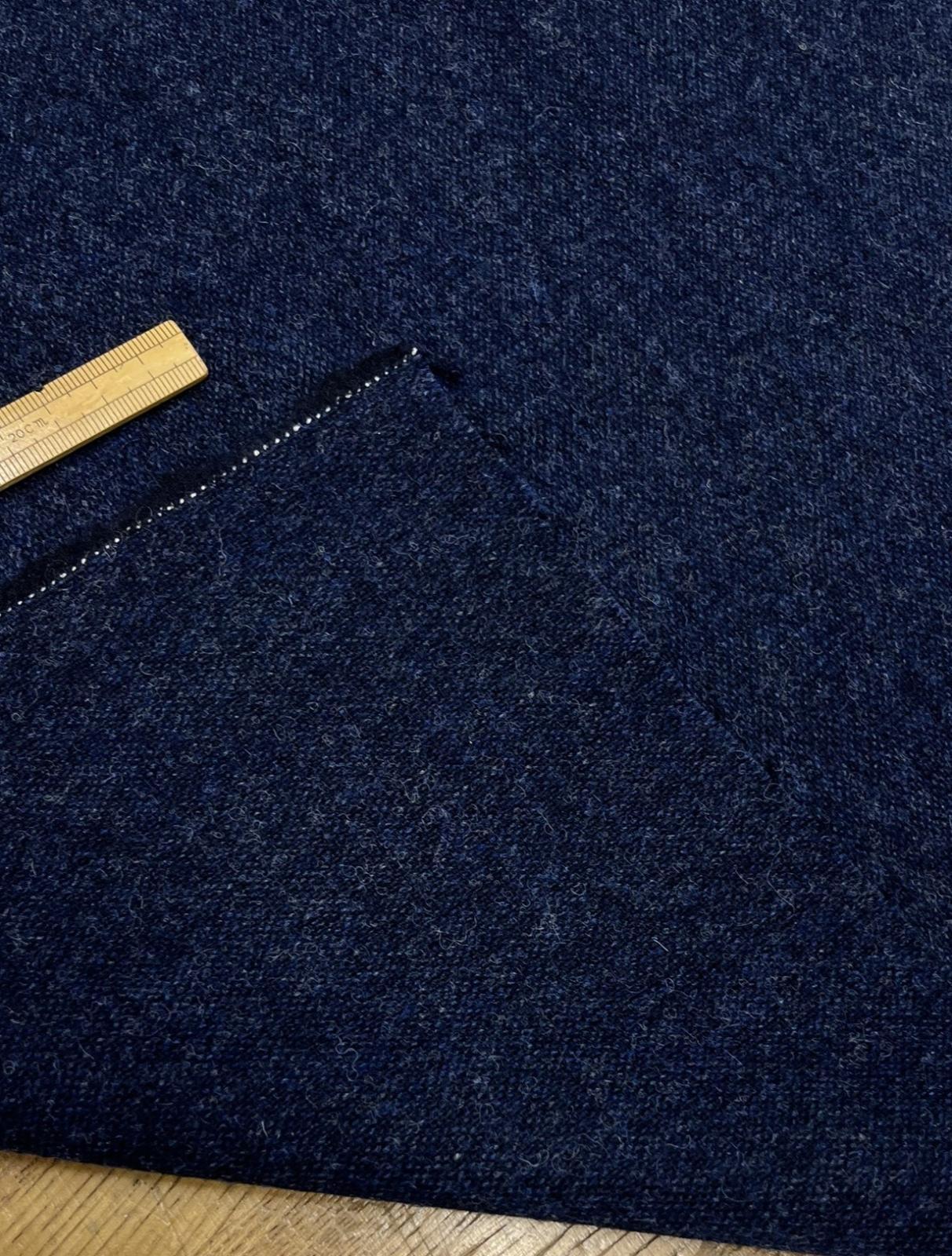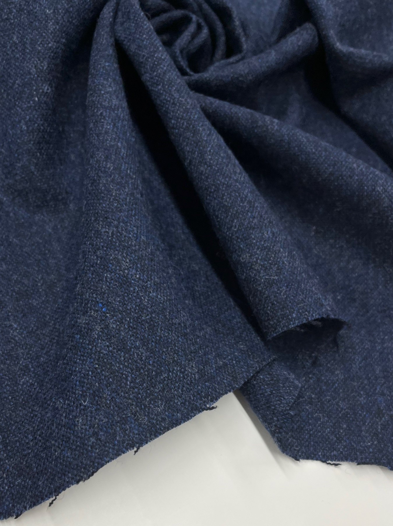 深みのあるネイビーブルーに杢調の糸が織りなす、落ち着いた印象のウール混ツイード生地。