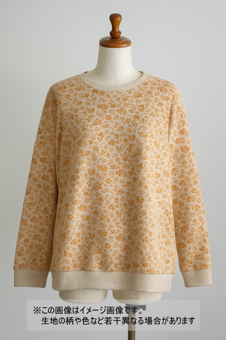 ベージュ地にオレンジの小花が散りばめられた、柔らかな印象のミニ裏毛ニットです。