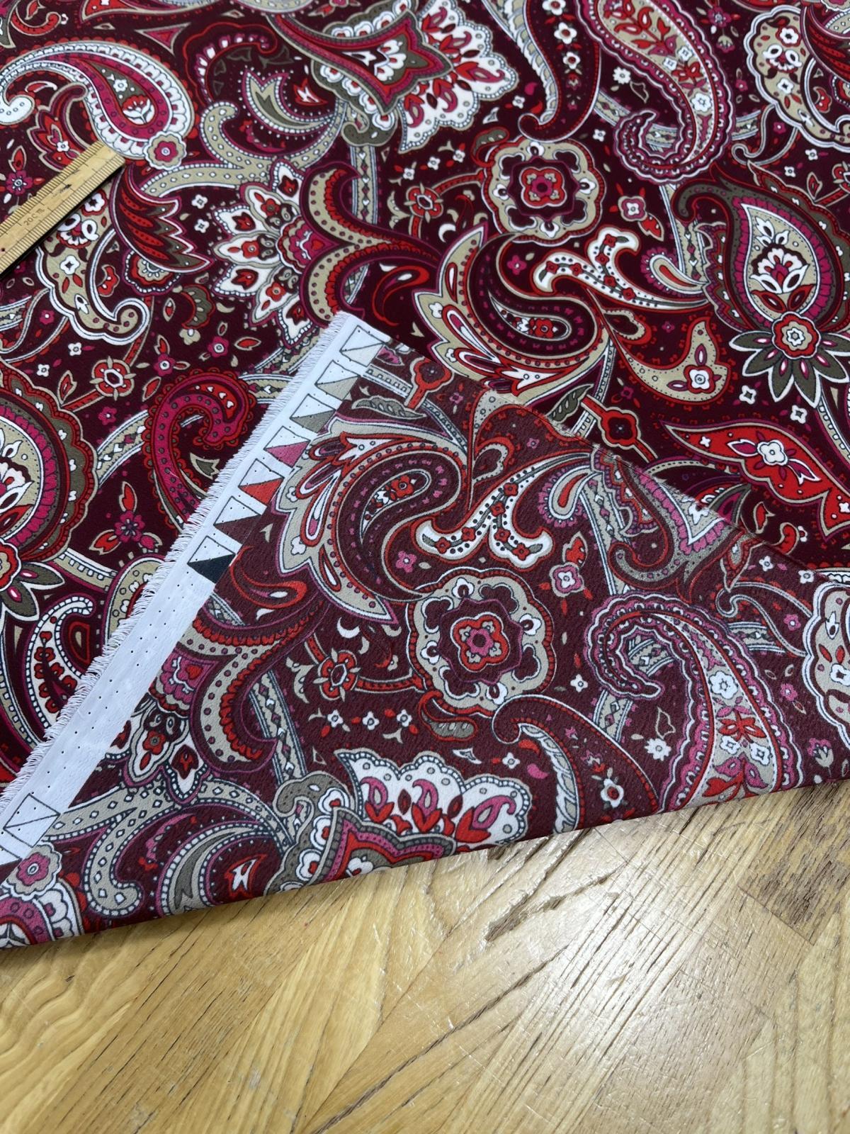 深みのある赤をベースに、ベージュ・ブラウン・ホワイトを組み合わせたクラシカルなペイズリー柄プリント。
