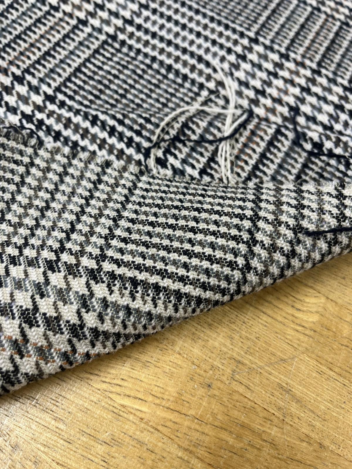 細かな柄が連続するグレンチェック調で、落ち着いた色味ながら存在感のある仕上がりです。