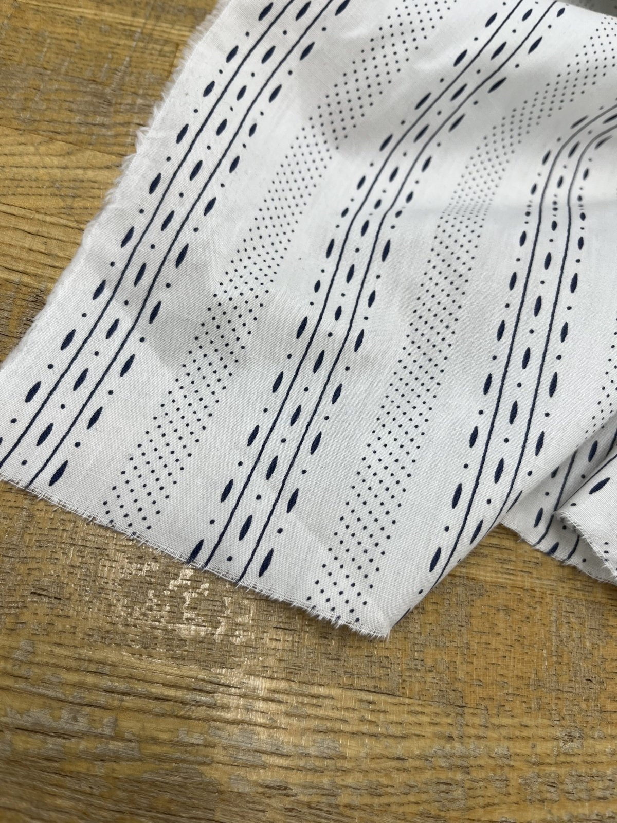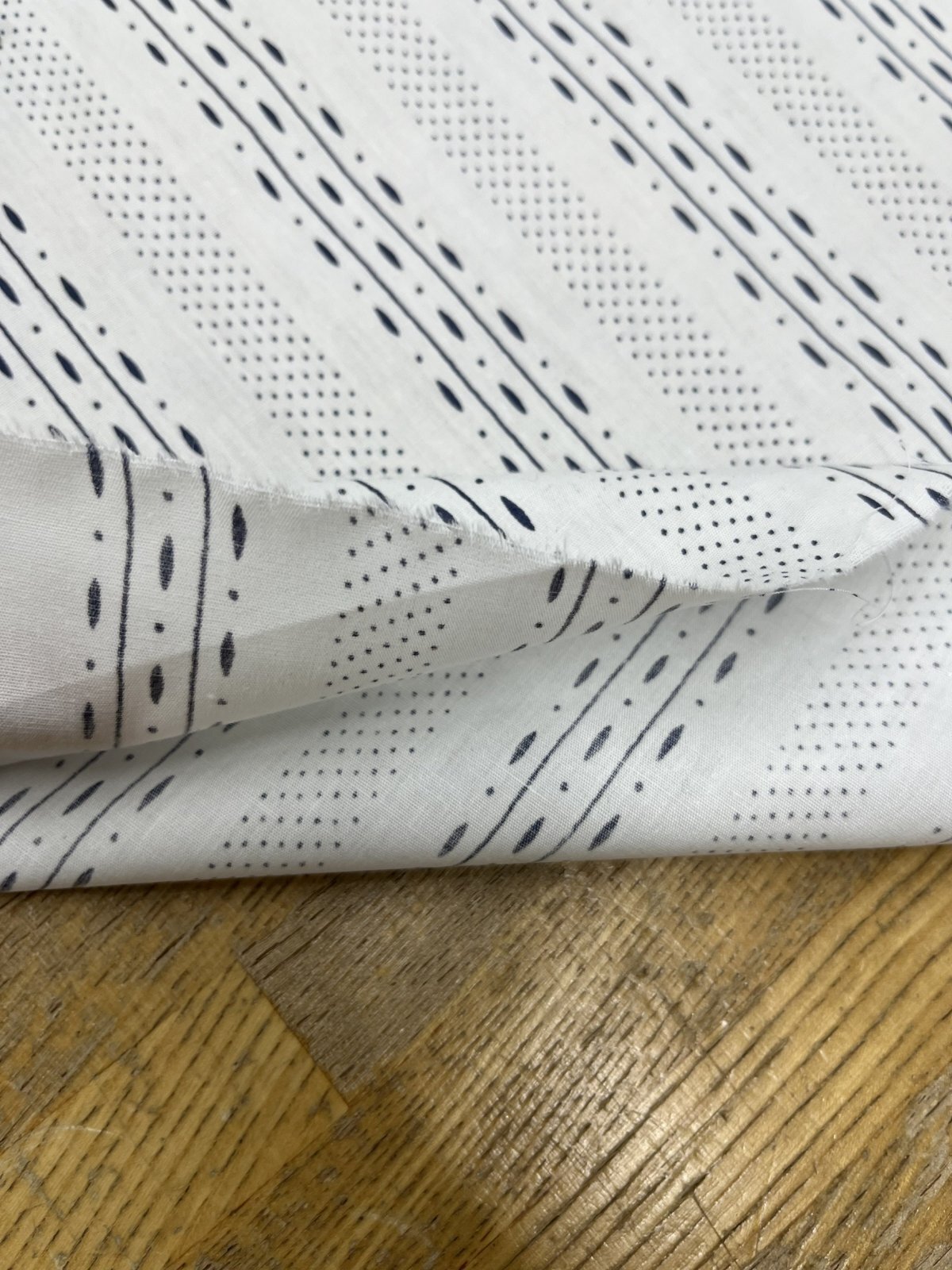 白い地に、濃紺で表現されたストライプと点線を組み合わせたプリント柄です。